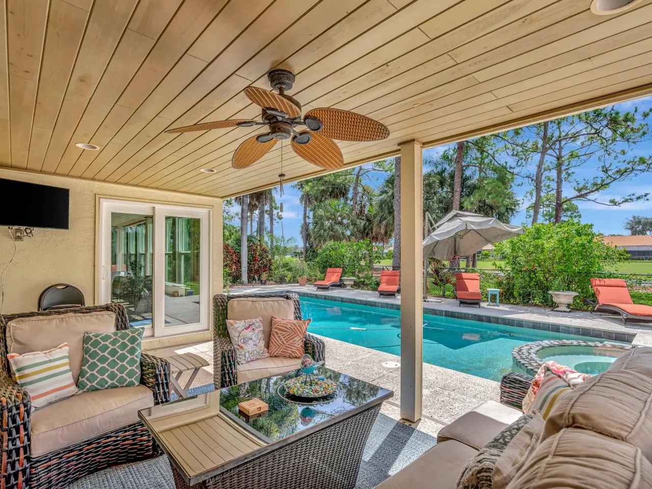 Located on quiet cul-de-sac in Thurston. This 3 bedroom, 3.5 bath boasts unbeatable golf course views. Two patios on the fairway make entertaining quite comfortable.Features include impact window, doors, and garage door. Plenty of room for two cars, motorcycle and storage. IncludesTesla charging station and over sized storage above in the garage.Freshly landscaped with new sprinkler system, 3 zone a/cs with 2 new a/cs. Brand new kitchen and appliances. Large pantry/storage off the kitchen. Sunroom has newly refurbished flat roof/sundeck. Huge laundry room with washer and 2 dryers. Security system in the home. Newly paved driveway and walkway