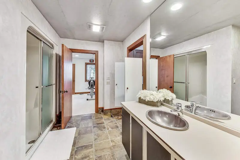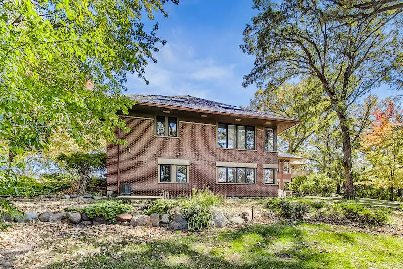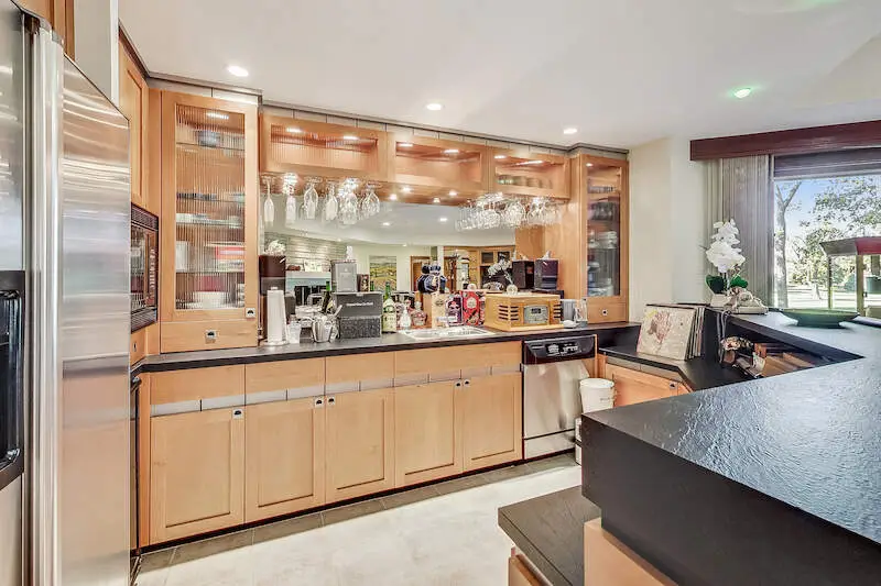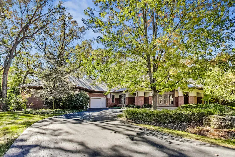 Designed by the talented and highly acclaimed architect, Ron McCormick. Iconic home situated on approximately 1.3 acres and overlooking the sweeping views of 16th fairway of Wynstone Golf Course. For those discriminating buyers desiring the finest of a unique custom built home with features including stone and woods incorporating the gorgeous oaks of outside and the contemporary oasis of the inside. One is welcomed by a dramatic entrance to almost 4000 square feet on the first floor! The layout and style of the home captures every aspect of the property. Ideal home for those seeking multi generational situation or more elegant and private guest space. Expansive primary suite on main level, blend of mid century and Frank Lloyd Wright tones in the kitchen, dining area, and great room with expensive flooring and wood touches. Upstairs provides the perfect guest quarters with living space, bedroom, and separate kitchenette area. The finished walkout emphasizes the openness of the home and highlights the floating staircase. Incredible spaciousness to entertain, enjoy the fine elements of the home, and the impressive property with towering trees. Recent HVAC replaced and one year new roof.