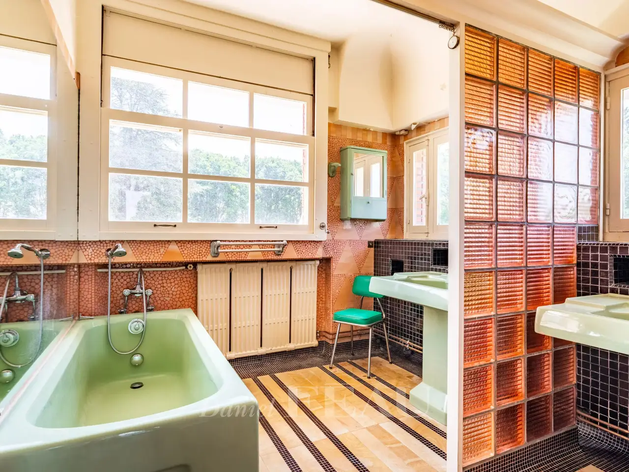 This exceptional Art Deco-style property was once home to architect Pierre Petit who exposed at the 1937 International Exposition of Art and Technology in Modern Life. Set in 3 hectares of grounds with a tennis court, a rose garden, a vegetable plot, a water feature and garages, it has benefited in the past from contributions from sculptors Jean René Debarre and Georges Guyot, wrought-iron artist Raymond Subes, andmaster glassworker Joseph Jean Kef Ray, and features lighting signed Perzel. A grandiose entrance hall boasting polished stucco leads to a reception room with a bar, as well as former staff rooms. Upstairs are a kitchen, a dining room in its original state, and a double living/reception room opening onto a wide terrace commanding a panoramic view over the grounds. The top floors comprise six bedrooms, three bathrooms and a billiard room. Among the property’s most remarkable period features are the mosaic floor tiles. A must for lovers of Art Deco.