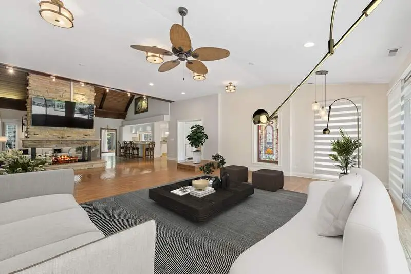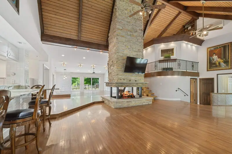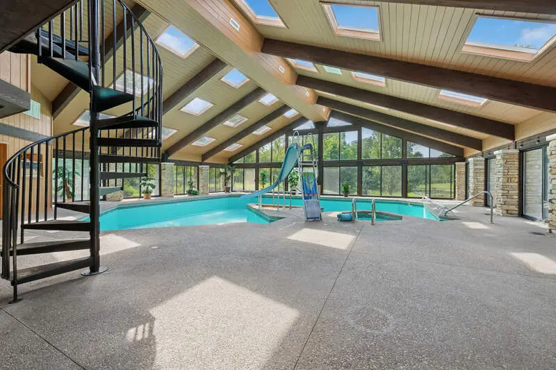 A rare opportunity to own 20+ prime acres in sought-after Barrington Hills! This exceptional 9,000+ sq ft estate offers resort-style living with an incredible indoor pool, expansive living areas, and a separate log-cabin-style guest house-all set amidst serene countryside. The main residence features five bedrooms and seven full baths, including a convenient main-floor suite with ensuite bath, ideal for one-level living. The dramatic great room is a showstopper with soaring tongue-and-groove vaulted ceilings and a striking floor-to-ceiling, four-sided stone fireplace. An adjacent family room with sliders to the patio creates a seamless flow for entertaining. The light-filled kitchen offers abundant cabinetry and counter space, opening to the great room and flowing into a spacious dining room with picturesque views of the backyard. A separate living room and sitting area lead to the indoor pool retreat, complete with vaulted ceilings, skylights, hot tub, slide, walls of sliding glass doors, and a spiral staircase to a second-floor bonus room. Additional highlights include a main-level sauna bath off the game room and a private second floor primary suite with French door entry, vaulted ceilings, a large walk-in closet/dressing room, and a spa-like ensuite. Upstairs, you'll find three generous secondary bedrooms-including a second primary suite-and three full baths. The property includes a barn with a stunning 3,000+ sq ft "Yellowstone-style" log cabin guest house offers two bedrooms, two full baths, an office, soaring beamed great room with floor-to-ceiling fireplace, and full kitchen-perfect for guests, extended family, or private retreats. An attached outbuilding features a two-stall barn with tack room, along with ample space for equipment and service vehicles. Garage space abounds with a three-car attached garage and a detached 6-car garage that can accommodate up to 10 vehicles. Whether you're dreaming of a family compound, equestrian estate, or hobby farm, the possibilities here are endless. All this in the award-winning D220 school district and just minutes to charming downtown Barrington, Metra, restaurants, and shopping.
