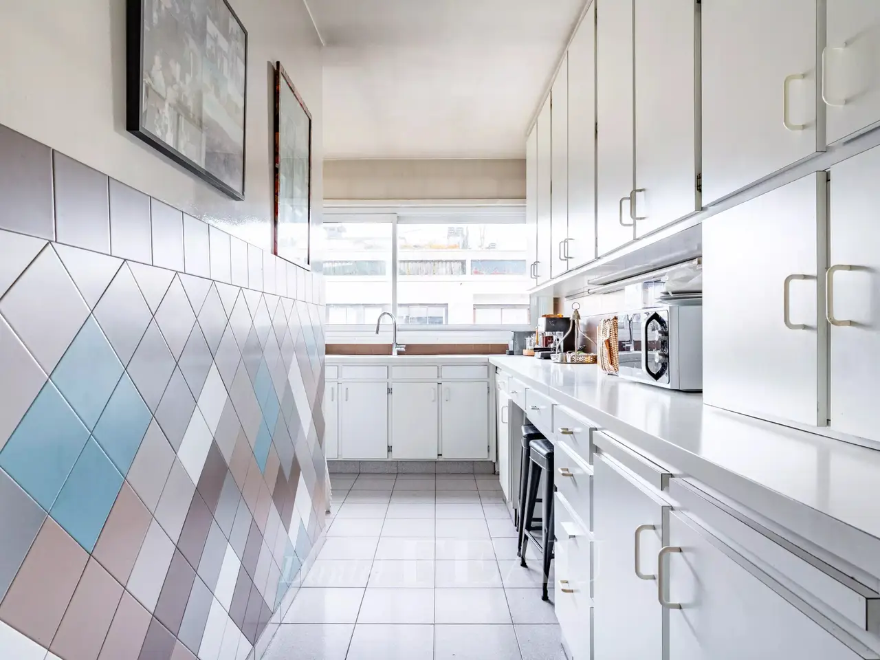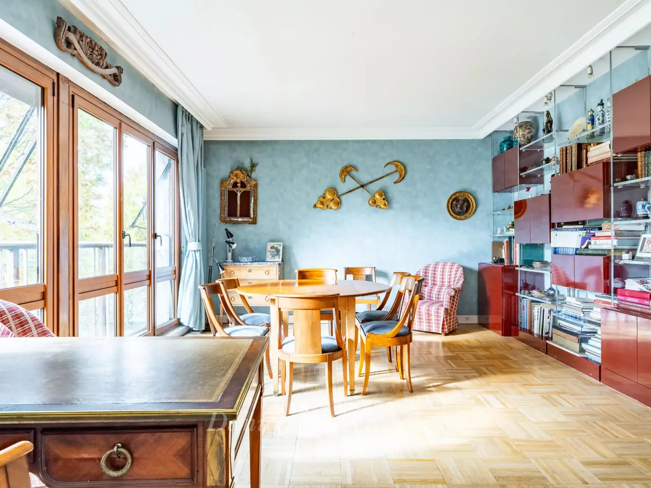 This south-west facing apartment on the top floor of a luxurious mid 20th century co-ownership located near Pasteur high school and the shops enjoys open views. Bright, peaceful and benefiting from a flexible floor plan, it includes a spacious living/reception room, a dining room, a separate kitchen, a utility area, a guest wc, two bedrooms, a bathroom, a shower room and a separate wc. A third bedroom would be easy to create. Renovation is required to exploit the full potential. Two 13 sqm garden-level maid’s bedrooms and a lock-up garage may be acquired for a further 333000 and 40000€ respectively.