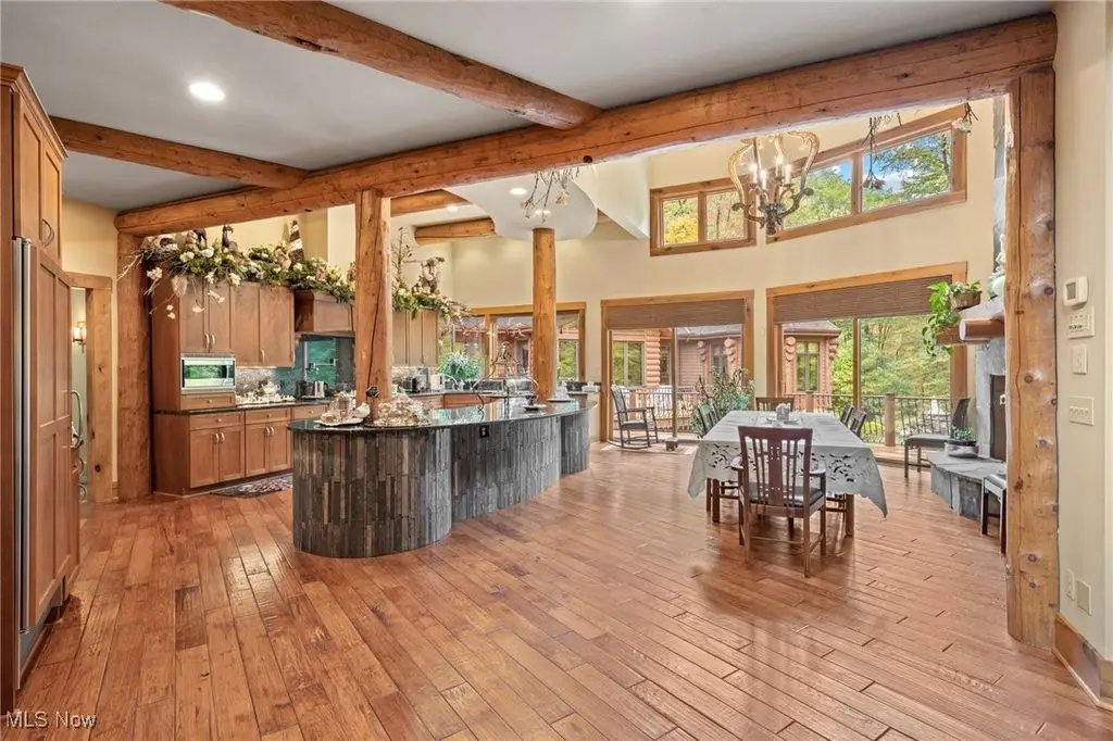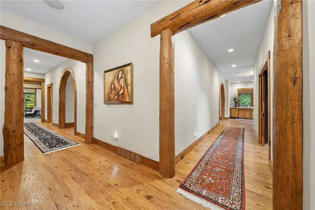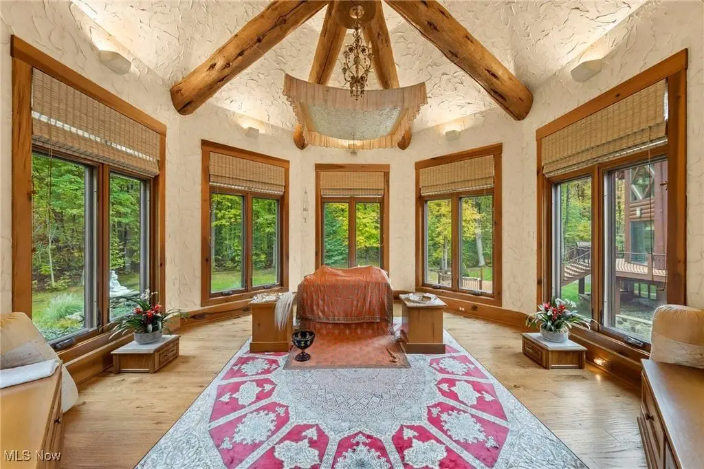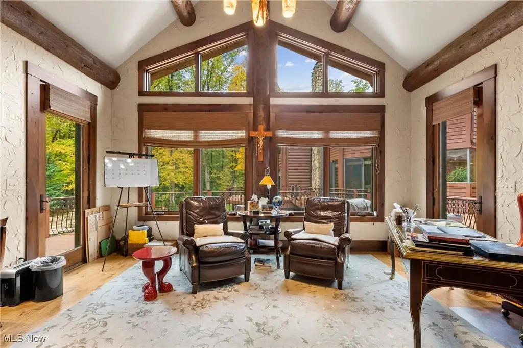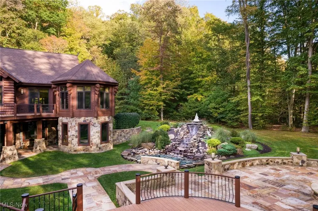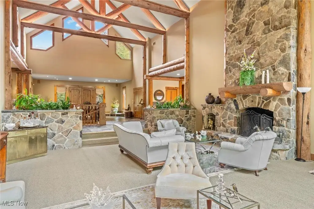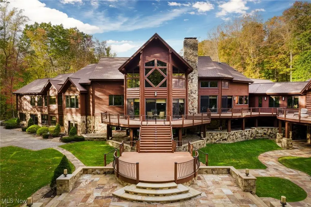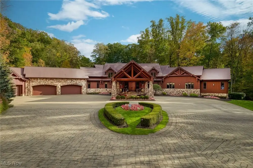 Nestled in the most spectacular almost 18 acre enclave, this private retreat unveils a breathtaking sanctuary, where nature's grandeur converges with the elegance of a stone and timber mountain modern home! The property with Chagrin River frontage sprawls over pristine wilderness and fabulously landscaped grounds, affording absolute seclusion and serenity. Enter through a spectacular gated entrance and travel down the meandering driveway unveiling the stunning residence! The home's exterior is a harmonious blend of stone and timber and integrates perfectly into its natural surrounding! Walking through the front door, one will immediately notice the soaring ceilings, walls of windows, and open design concept! This home is an exquisite balance of rugged and refined! The main great room boasts a cathedral ceiling adorned with exposed timber beams and a magnificent two story stone fireplace! Open to the great room is the incredible gourmet kitchen which is designed for entertaining and features a huge dining room area with fireplace, immense center island , and high end appliances! Each bedroom area on the main level is a private suite! The owner's wing is absolutely luxurious beyond compare offering a library, private kitchen, spectacular bedroom, sitting room, dual bathrooms, walk-in dressing rooms, and more! The walk out lower level is yet another incredible space with multiple entertaining rooms, bedroom suites, and even a television studio! 6+ car garage! One of a kind!!