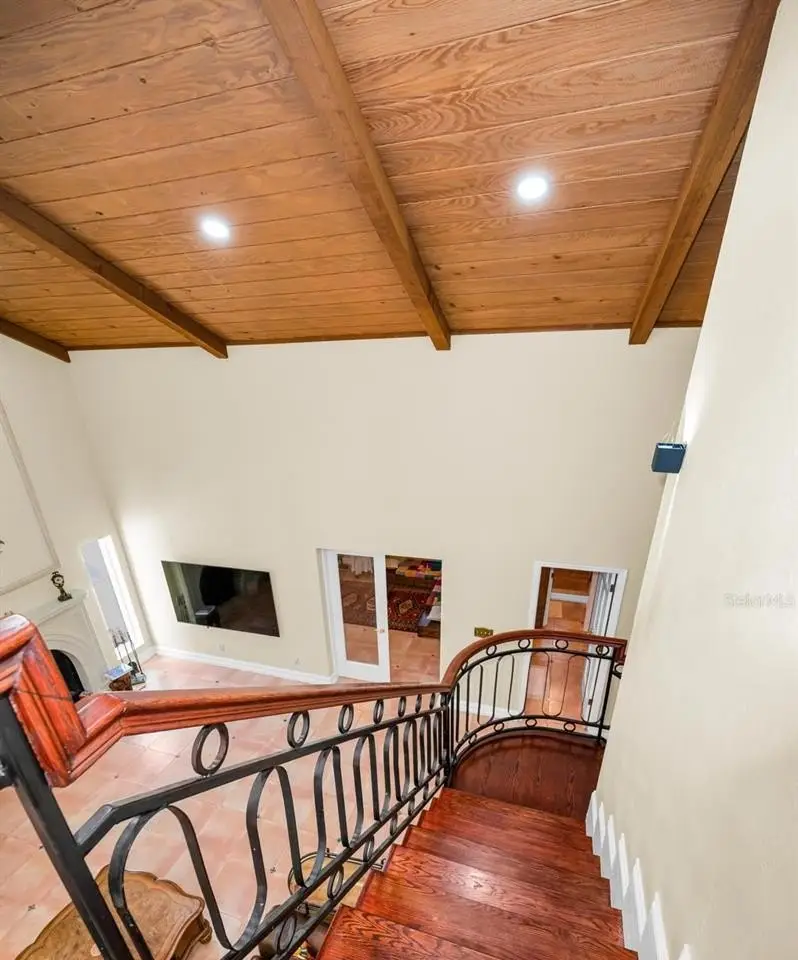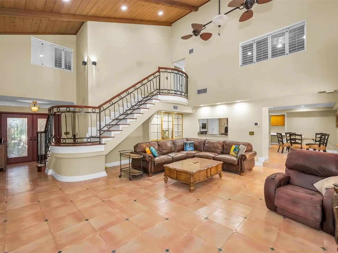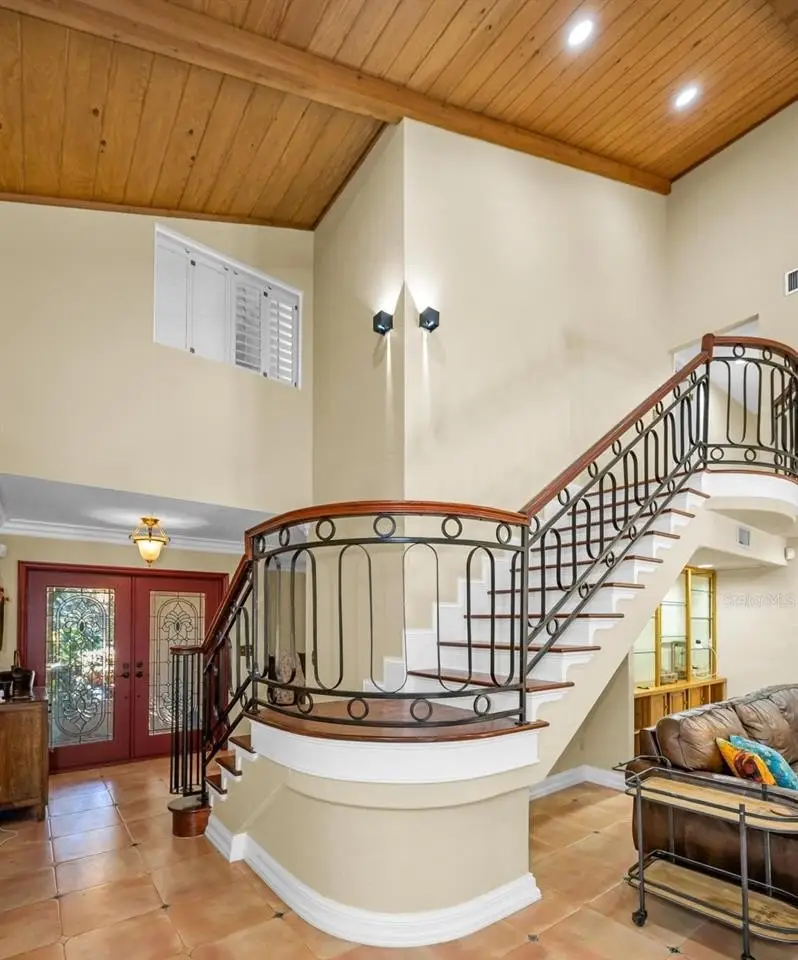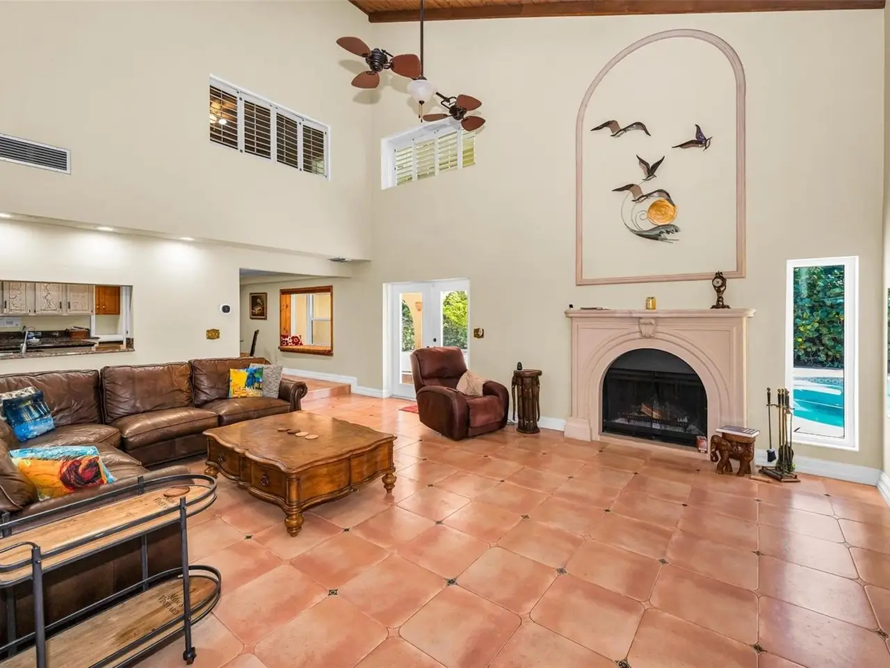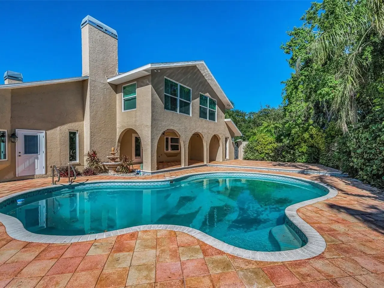 Timeless Mediterranean Revival Estate with Resort-Style Pool Oasis on Over Half an Acre in Prestigious Carlton Estates. Step into a world of enduring elegance with this captivating two-story Mediterranean style pool home, where architectural splendor meets elevated leisure and family-friendly luxury. Nestled on more than half an acre in one of Pinellas County’s most sought-after enclaves, this exceptional residence offers over 3,800 square feet of exquisitely designed living space. Inside, authentic character abounds, from rich Saltillo tile floors and arched doorways to bay windows, wrought iron railings, and soaring beamed ceilings that crown the interiors with timeless charm. A brand-new roof and updated windows and doors throughout ensure peace of mind and modern comfort. From the moment you enter, bold Tuscan-style tile flooring sets a tone of European permanence. The main level unfolds with expansive, interconnected living spaces, including a formal living and dining room that exudes warmth and sophistication—perfect for elegant entertaining or intimate evenings. At the heart of the home lies a grand, light-filled family room, where two-story vaulted ceilings and exposed wood beams evoke the rustic romance of a Spanish mission. Anchoring the space is a striking wood-burning fireplace, casting a cozy glow across gatherings large or small. The adjacent chef’s kitchen is a seamless extension of the living space, featuring a central island and open sightlines that keep the cook connected to the conversation. A sunlit breakfast nook with a bay window offers the ideal setting for casual meals and morning coffee with a view. Thoughtfully designed for flexibility, the main floor also includes a secluded office retreat with a beamed ceiling and a generously sized bedroom with an adjacent full bath—perfect for guests, multigenerational living, or a private sanctuary. A sweeping staircase of wood and wrought iron leads to the upper level, where three generously sized bedrooms and a sunlit, multi-purpose bonus room span the second floor. The expansive primary suite is a true retreat, complete with a dramatic stone fireplace and a private veranda for quiet moments under the stars. Outdoors, the Mediterranean lifestyle comes to life. A sprawling covered lanai with paver flooring and elegant arched breezeways opens to a park-like backyard, where mature landscaping surrounds a large, sparkling inground pool. Whether hosting alfresco soirées or enjoying tranquil afternoons in the sun, this outdoor oasis is designed for seamless indoor-outdoor living. This is more than a home, it’s a statement of style, serenity, and sophistication. With four bedrooms, 4 baths, a resort-style backyard & pool, and over half an acre in one of Pinellas County’s finest neighborhoods, this home checks every box. Don’t miss your chance to experience the elegance and ease of Carlton Estates living! Experience the European charm and refined design for yourself.