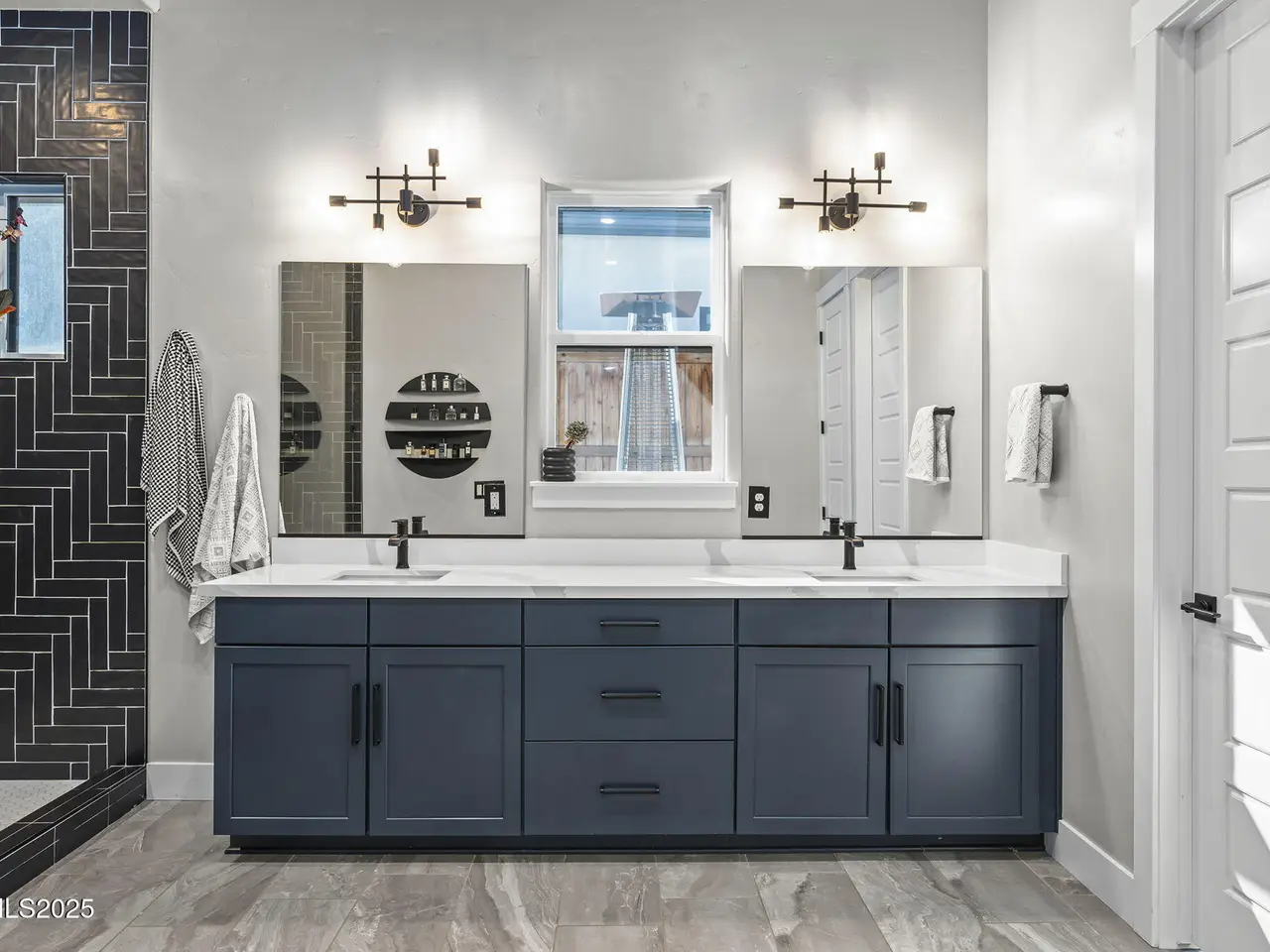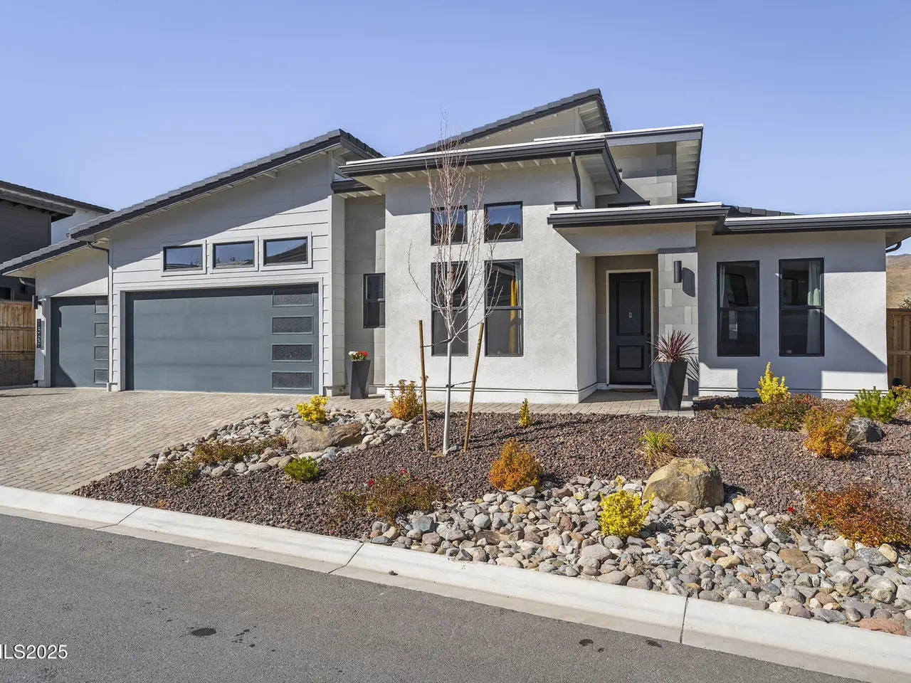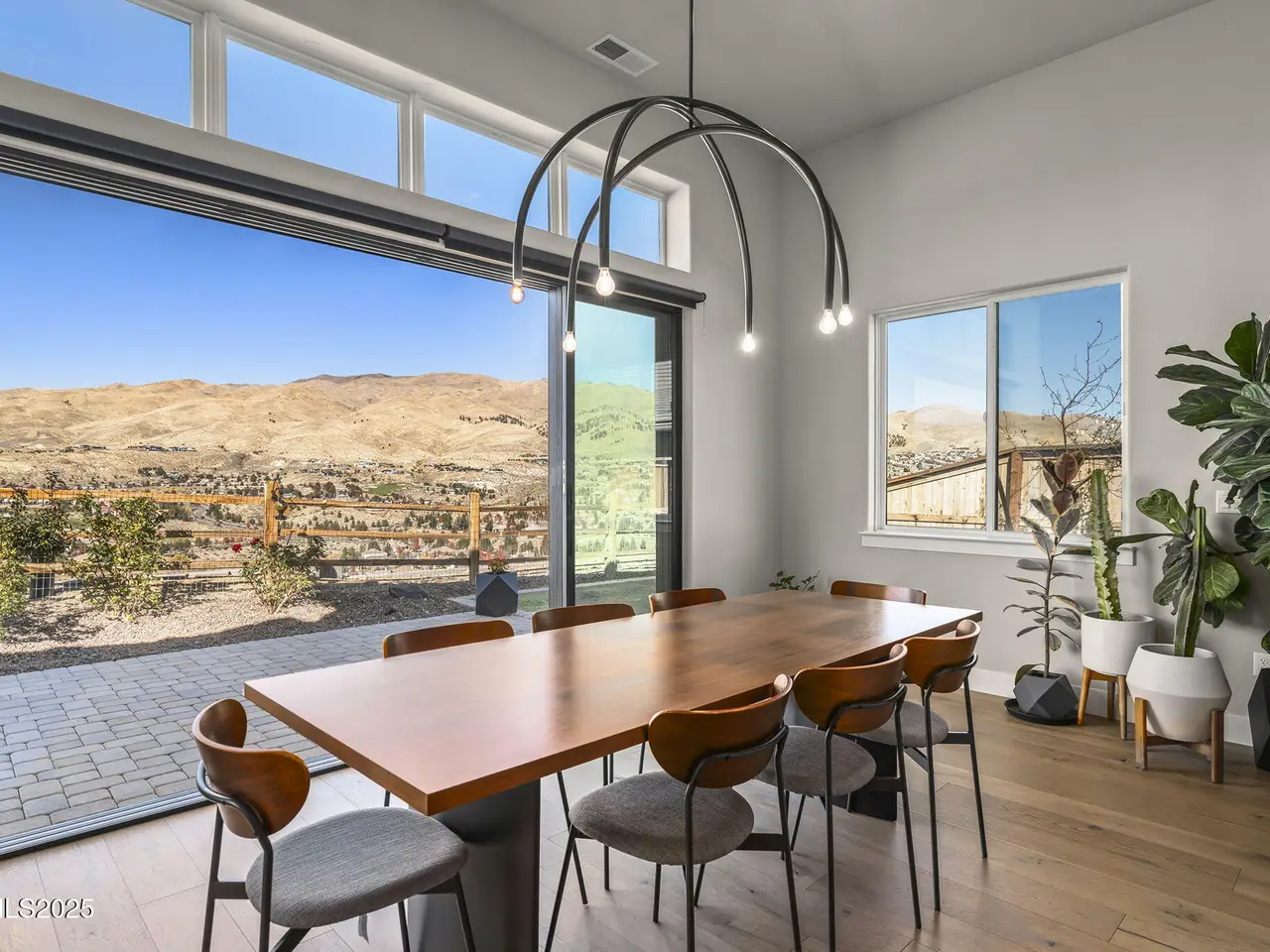 Welcome to this contemporary Somersett home located in the gated community of Brae Retreat. This home combines elevated design with breathtaking views of Peavine Mountain. Soaring 12-foot ceilings and an open-concept layout delivers unparalleled space and light from the moment you step inside. The entertainer's kitchen is a showpiece, featuring a double waterfall island crafted from Alpinus Green Crystal Vivid Brazilian Granite, upgraded cabinetry, and a seamless flow to the great room. Throughout the home, you'll find Hickory engineered hardwood flooring, beautifully tiled bathrooms, and high-end finishes. Multi-panel sliding doors create an indoor-outdoor living experience, opening to a covered patio. The hot tub overlooking the serene mountain views ensures easy relaxation. Modern conveniences include automated roller shades in the primary suite and living room, and blackout shades in select bedrooms. The fully finished laundry room is outfitted with both cabinetry and a sink. The low-maintenance landscaping makes outdoor living easy. Experience the best of Somersett living with access to the clubhouse, golfing, fitness facilities, pools, and scenic walking trails — all from this immaculate, move-in-ready home designed for effortless luxury and entertaining.