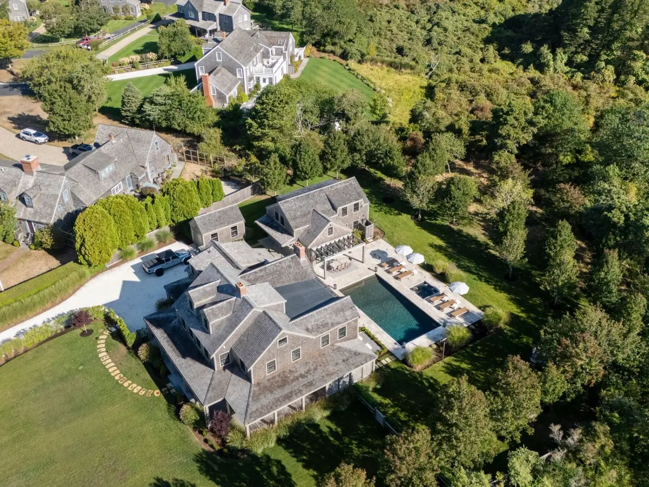 Experience modern Nantucket living at its finest in this newly renovated five bedroom, 5.5 bath home located in the desirable Austin Farm neighborhood near Hummock Pond. Thoughtfully redesigned in 2024, this home combines coastal charm with contemporary luxury and offers the perfect balance of privacy and convenience. The first floor features a bright, open layout with a custom kitchen, dining area, and spacious living room. High-end finishes, designer lighting, and hardwood flooring create an elegant yet comfortable atmosphere throughout. All flows seamlessly to the outdoor entertaining spaces. The home offers two primary suites, one on the first floor and one upstairs, each with beautifully appointed ensuite baths. Three additional guest bedrooms on the second floor provide ample space for family and visitors. A cozy den compliments the upstairs spaces, a perfect spot to unwind. Step outside to a beautifully landscaped yard with a heated pool with hot tub, pool house, and multiple lounge and dining areas. Mature plantings offer privacy while maintaining a relaxed island feel. Located just minutes from town, the beaches, Bartlett's Farm, and Miacomet Golf, this home provides convenient access to some of Nantucket's most beloved destinations.