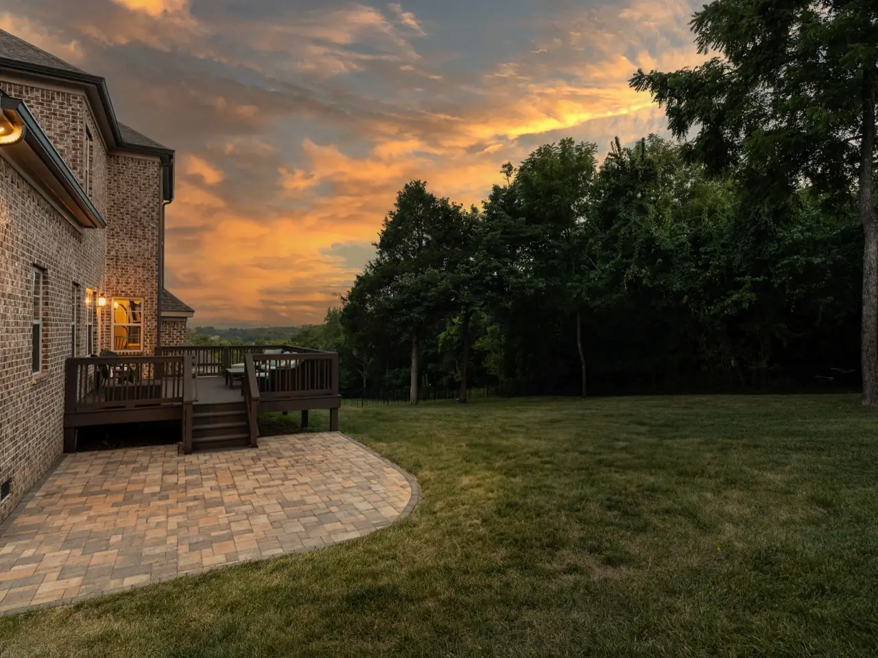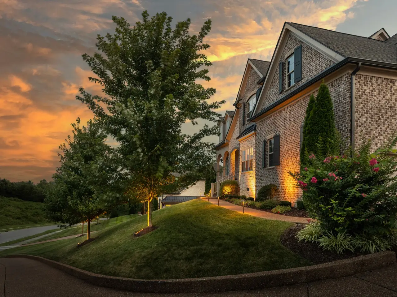 Mature landscaping with uplighting