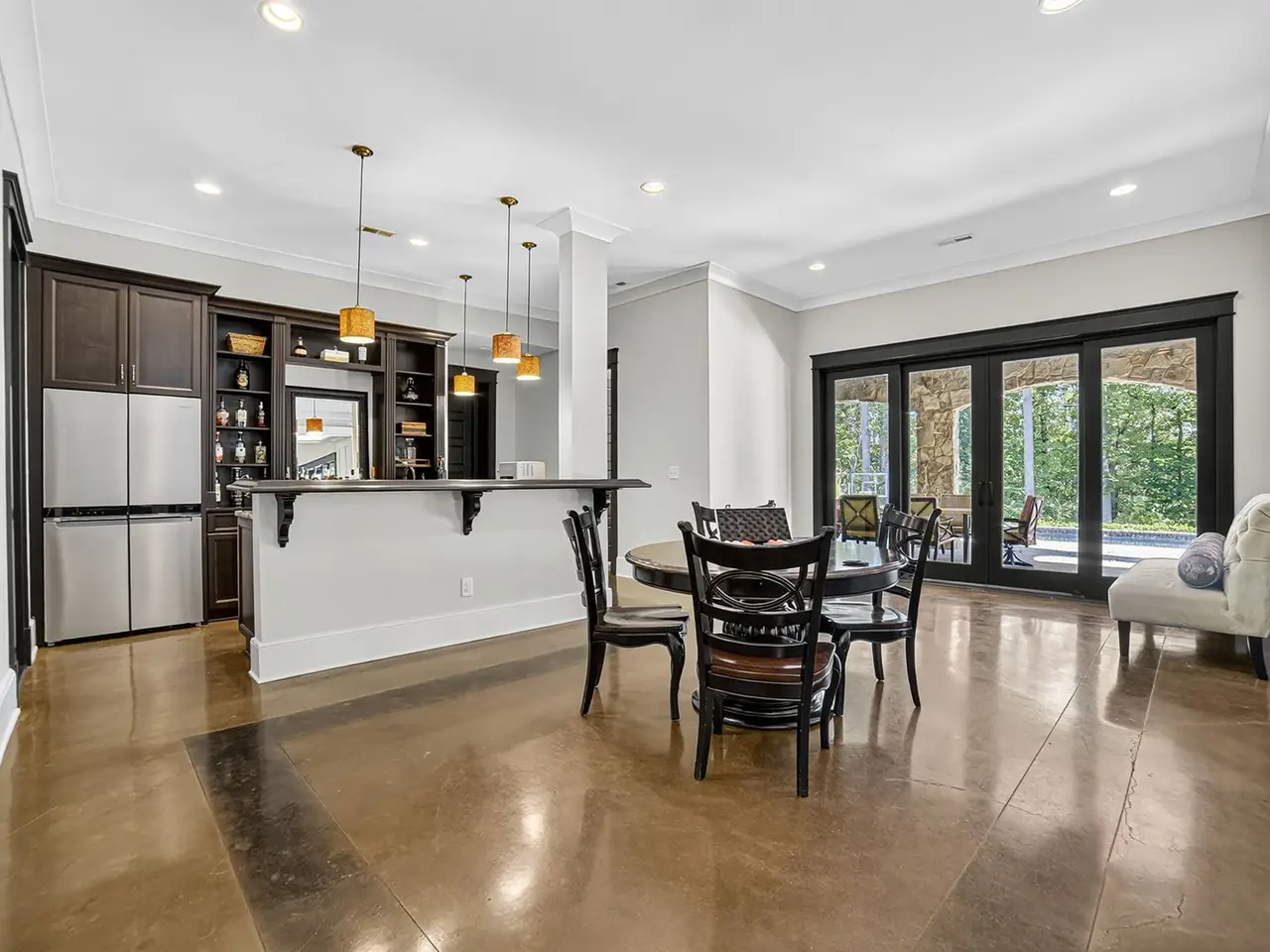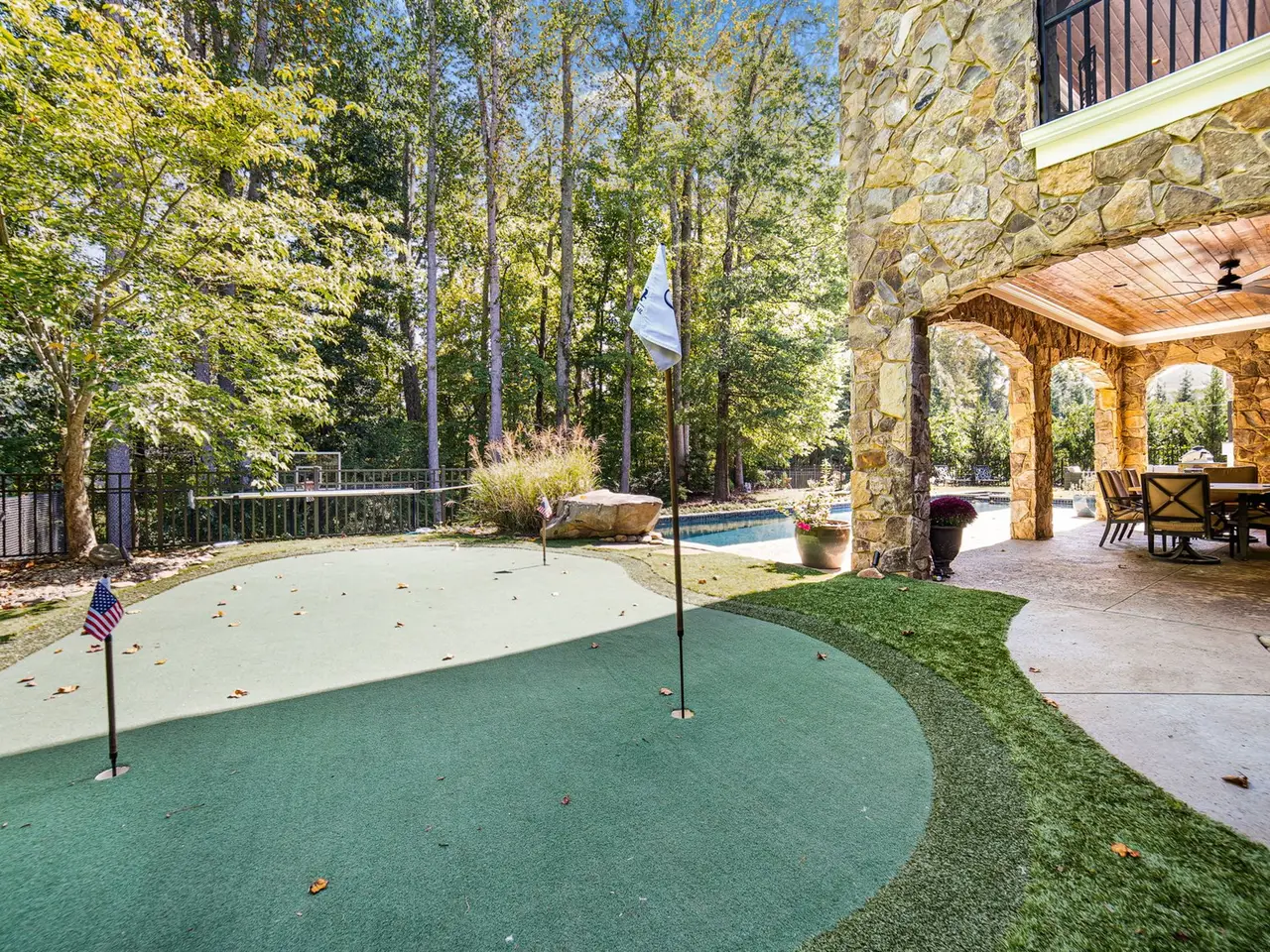 Resort-Style Luxury Estate Backing to Protected Greenspace Discover a rare blend of timeless craftsmanship and modern luxury in this cedar shake and stone estate. Designed for both everyday living and unforgettable entertaining, the home offers a true resort lifestyle. Outdoors, enjoy multiple living spaces screened porch, balcony, patios, and a spectacular pool with diving rock, spa hot tub, and dedicated pool bath. Entertain with a full outdoor kitchen, gas-start fireplace, fire pit, half-court basketball, turf putting green, and grassy play yard.Inside, soaring ceilings, elegant moldings, hardwoods, and smart-home features set the stage. The chef's kitchen shines with dual islands, Thermador appliances, walk-in pantry, and breakfast nook. The coffered-ceiling living room, keeping room, and screened porch make gatherings seamless.The main-level owner's suite is a retreat with vaulted ceilings, fireplace, porch access, and spa-inspired bath featuring heated marble floors, freestanding tub, oversized shower, and custom closets. Upstairs offers a study loft, three bedrooms with ensuite/shared baths, and unique bonus spaces.The finished lower level boasts a wine cellar, custom bar, 120-inch home theater, office, exercise room, and guest suite with pool access.This extraordinary estate delivers luxury, recreation, and nature right at home.