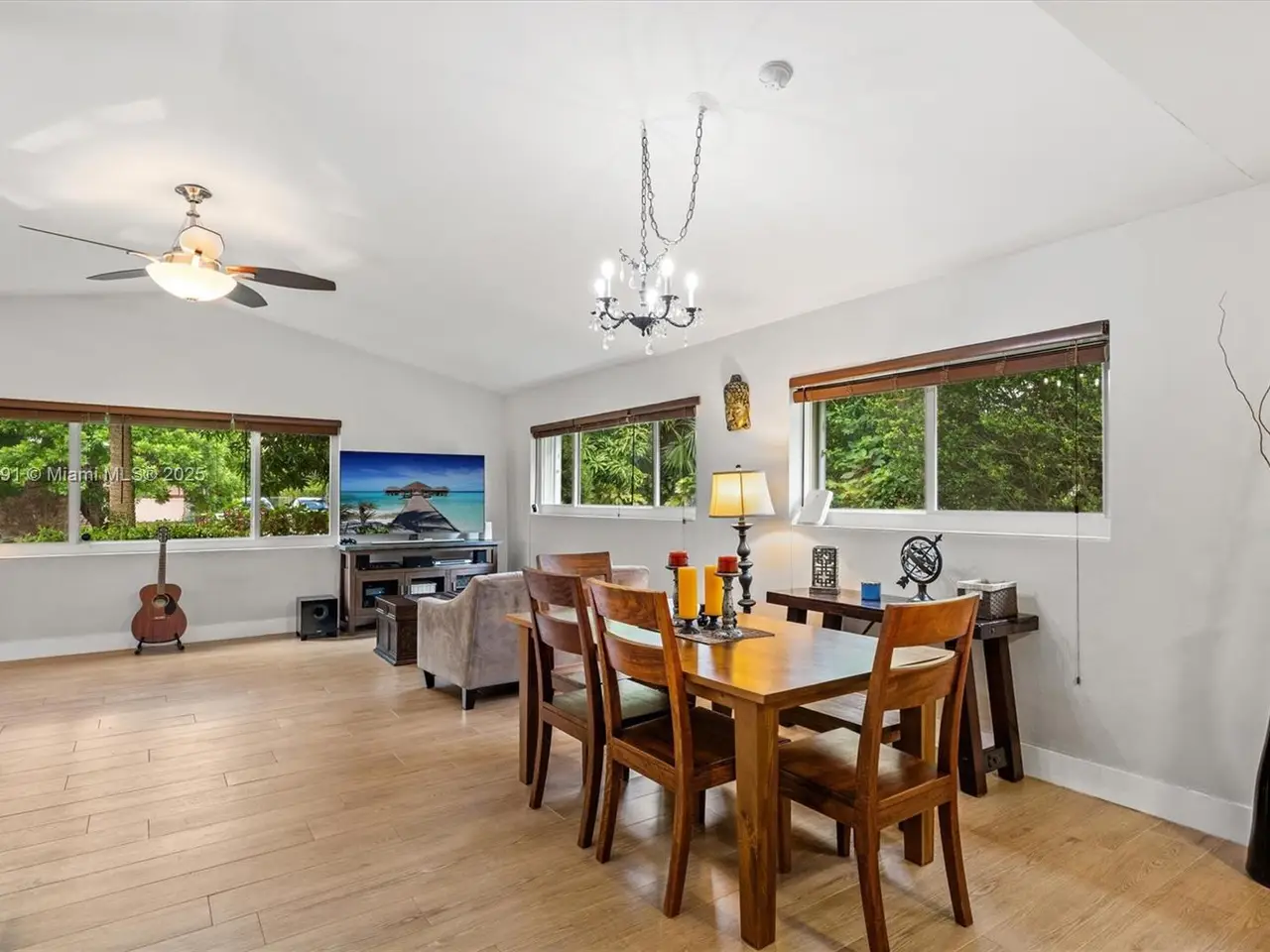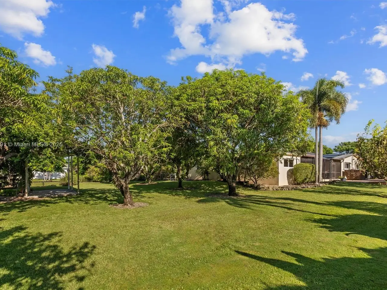 No HOA!! Not Flood Zone (X), 2019 Main House Metal Roof & Solar Panels. Garden Paradise in over 1/2 acre of land (25,200 sqft), Mango, Avocado, Lychee, Longan trees to enjoy nature privately. Beautiful 1-story house, 3 bedr./2 bath in Main House (3rd bedr. currently open office). Separate Guest House or In-Law Quarters with 1 bath & living room. Both structures built around a 6 Foot Saltwater & Heated Pool, screened w/outdoor sitting area & quartz counter extending from kitchen into pool area to enjoy with family. Remodeled kitchen with cathedral ceiling, quartz counter tops, stainless steel appliances, 3 tier lighting, 2 garage, auto sprinkler, impact glass main house, accordion shutters double protection, wood carved front door, 2022 A/C, space for boat. Great Schools & Close to Palmetto Bay Park.