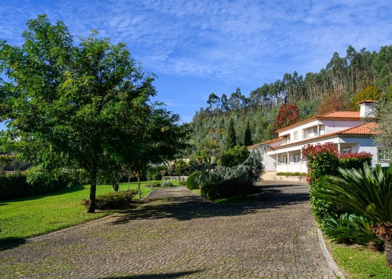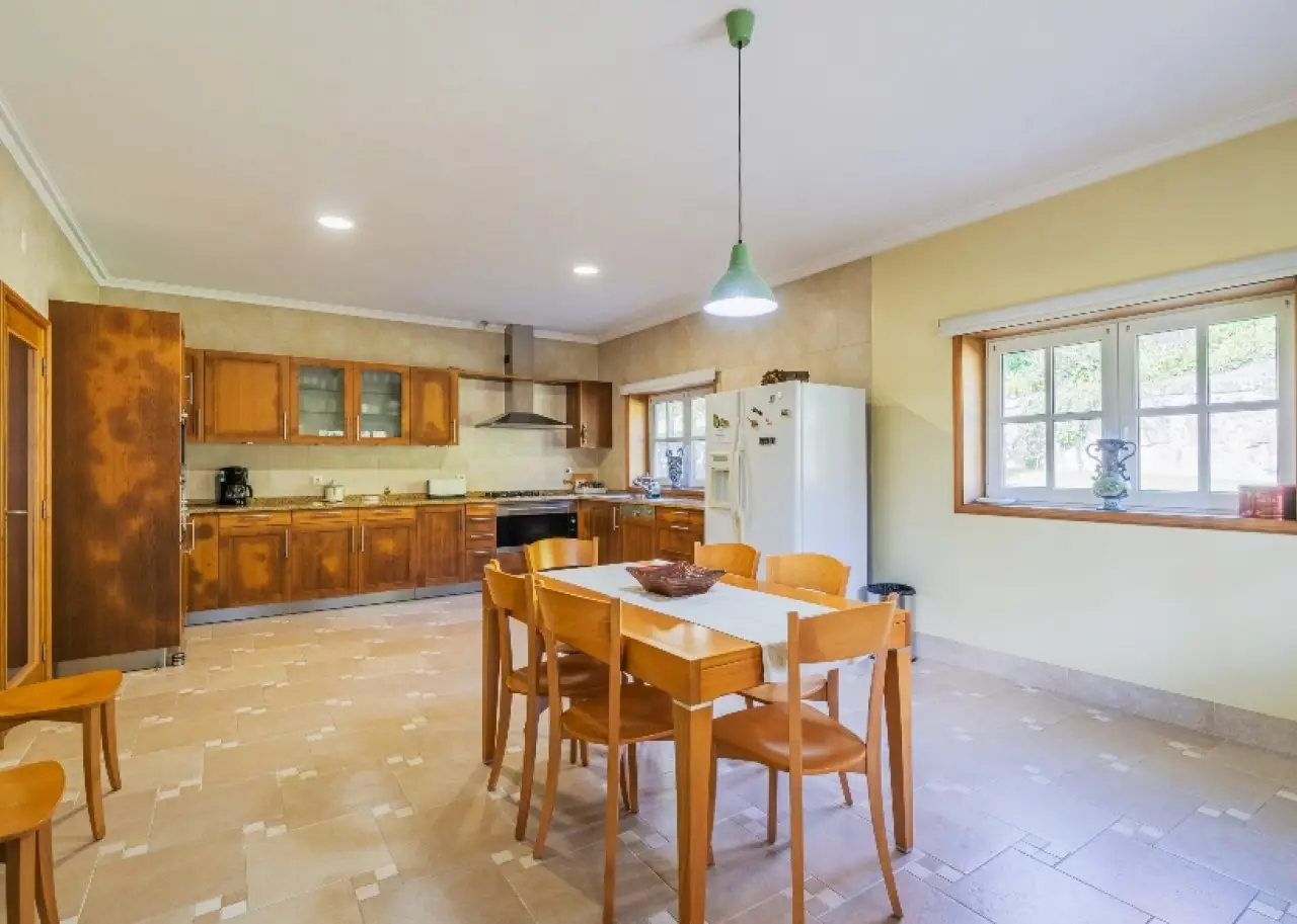 Fantastic house for sale in the suburbs of Guimarães, combining the exclusive beauty of traditional Portuguese architecture with the comfort and quality finishes of contemporary construction. Enjoying large rooms, the social area, located on the first floor, consists of a huge living room with three different environments, an office, a guest toilet and a large kitchen, all with a direct connection to the majestic outdoor gardens. In the private area there are six magnificent suites, three on the second floor and another three on the first floor. This property also has a large lounge in the basement, connected to the outside patio, as well as a garage for four cars. The entire house benefits from excellent finishes, such as wooden floors in the living rooms and bedrooms, marble in the bathrooms, central heating and air conditioning. Outside, the property benefits from a stunning garden - of around 10,000 m² - which is extremely well-kept, as well as roads and lighting throughout its area, large areas that are fully lawned and other wooded areas, citrus groves and other fruit species, and a beautiful swimming pool with its respective supports. The property benefits from its own water through two wells, an artesian borehole and a natural water mine. Privileged location, in a quiet residential area with excellent access, 10 minutes from Guimarães city center, 40 minutes from Porto and 30 minutes from the coast and the beach area. CHARACTERISTICS: Plot Area: 10 880 m2 | 117 111 sq ft Deployment Area: 442 m2 | 4 762 sq ft Building Area: 727 m2 | 7 824 sq ft Bedrooms: 6 Bathrooms: 8 Garage: 4 Energy efficiency: C FEATURES: Central heating; Air conditioning; PVC window frames with shutters; Insulation on exterior walls and roof; Two wells; An artesian borehole; A mine.