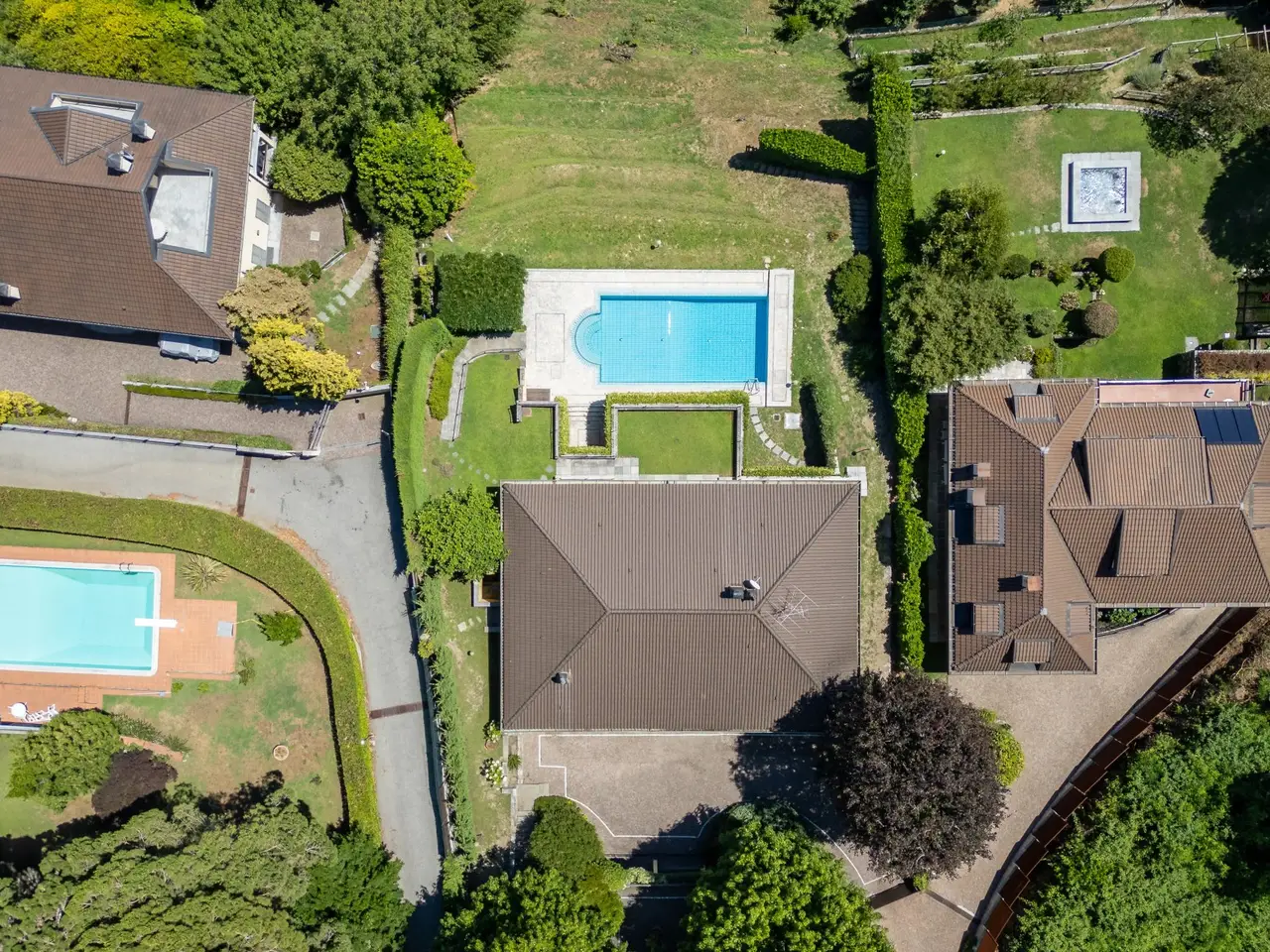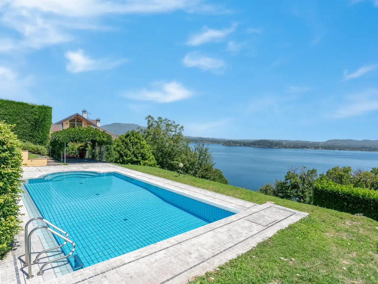 In a panoramic and private location on the hills of Lesa, we offer for sale a modern villa with breathtaking lake views, surrounded by a private park of about 3,700 sqm. The property is located in one of the most exclusive residential areas of Lake Maggiore, a few kilometers from the center, in an ideal location for those seeking tranquility, privacy and a representative residence. Main features of the villa on the mezzanine floor: - Main floor all on one level, ideal for enjoying the integrated convenience of space. - Large living room with panoramic windows overlooking the lake, connected to the dining area - Eat-in kitchen with adjacent workspace/den area - Master bedroom with en suite bathroom - Second master bedroom with en suite bathroom and walk-in closet - Courtesy bathroom for guests Ground floor: - Large tavern with fireplace - Third bedroom with en suite bathroom - Additional kitchenette, ideal for guests or staff - Study, technical rooms and various storage spaces (laundry, storage, etc.) Exterior and amenities: - Private pool with sunbathing area - Panoramic terraced garden of about 3,700 sq. m. - Pergola with wisteria ideal shaded area to create a barbecue adjacent to the pool and lake view terraces - Double covered garage and large porphyry-paved courtyard - Irrigation system, outdoor lighting, automatic gate, alarm system. This villa for sale in Lesa is perfect as a first home or vacation residence. The commanding location offers spectacular views of Lake Maggiore, while the spacious interior and exterior spaces make it ideal for families as well.