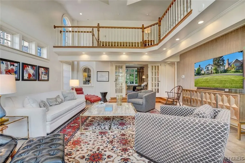Timeless Elegance Meets Modern Luxury Across from Delaware Park at 81 Nottingham Terrace. Discover refined living in this stunning 4 bedroom, 3.5 bath Tudor estate, perfectly positioned across from Olmsted's historic Delaware Park. A seamless blend of classic architecture and contemporary upgrades, this home offers exceptional comfort and elegant style. The fully remodeled chef's kitchen is a showpiece, featuring premium appliances including a Sub-Zero refrigerator, Wolf range, Cove dishwasher, and a built-in coffee bar. Elegant Carrara marble countertops and a spacious island make it ideal for both cooking and entertaining. The kitchen opens to a bright breakfast room and offers a unique view into the climate-controlled wine cellar, which holds up to 1,000 bottles of wine. The formal dining room, adorned with its original chandelier, flows into a grand foyer. A spacious living room centers around a striking woodburning limestone fireplace, while the large modern family room features radiant heated floors and a loft above. French doors lead to a private courtyard patio, perfect for relaxing or hosting guests. The distinguished library/study offers warmth and character with a wood-burning fireplace and custom built-in bookshelves. Original hardwood floors and incredible woodwork throughout. Gorgeous staircases show the charm and character of this exquisite home. Upstairs, the luxurious primary suite includes three closets and a spa-inspired ensuite bath. The second bedroom opens to a Juliet balcony, and the third bedroom features a generous walk-in closet. The third-floor bedroom includes an additional full bathroom, ideal for guests or a private retreat. Outdoor living is equally impressive - enjoy a saltwater inground pool, a stone fire pit for cozy evenings, grilling area designed for effortless entertaining. Fully fenced electronic gated yard with sprinkler system. Updates include roof, boiler system ($30,000), Generac generator, and much more. This exceptional home combines historic charm, modern amenities, and resort-style outdoor living in one of Buffalo's most coveted neighborhoods.