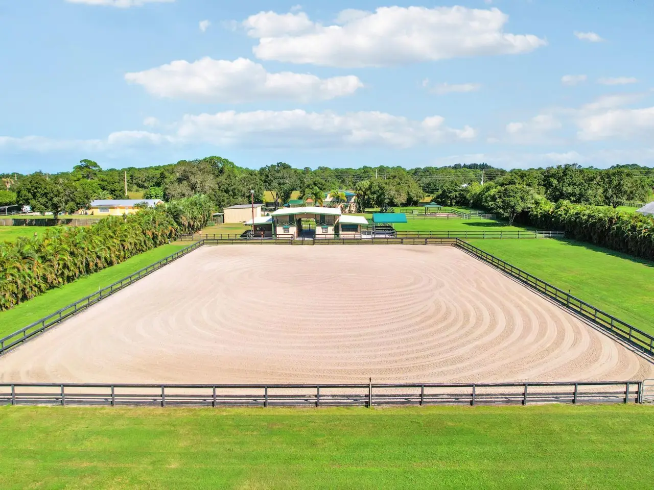 Tucked behind mature Areca palms, this 5.34-acre estate offers total privacy and top-quality equestrian amenities. Fully fenced with an 8-stall barn featuring 14x14 stalls, fly spray system, fans, auto waterers, AC tack room, feed room, hayloft, and barn bath. The 200x300 sand arena has a clay base, water system, and two viewing decks. Includes five paddocks, cookhouse, gazebo, fountain, shaded turnaround, and ample trailer/RV parking with 100-amp and 50-amp hookups. The 5BD/3.5BA Key West-style home has a 2017 metal roof, impact windows, quartz kitchen, sauna, and generator. Minutes to I-95, Turnpike, 8 miles to St. Lucie Inlet, 7.5 miles to Treasure Coast Airport. - click on See More for more details.