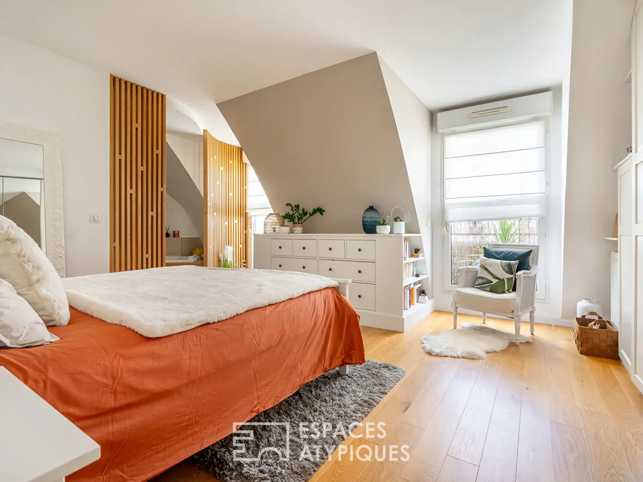Located near Parc Montsouris, on the fifth and top floor with elevator of a modern building from the 2000s, this 127 m2 apartment (113 m2 Carrez law) has been entirely designed in a resolutely contemporary style. This bright, dual-aspect apartment benefits from a terrace adjoining the 56 m2 living room.The entrance hall, equipped with custom storage, leads on one side to a superb master suite with its own balcony and a spacious bathroom (with bathtub and shower), and on the other side to a second bedroom, a shower room, and a separate toilet.A fully equipped, independent kitchen adjoins a bright living room with clean, minimalist lines.Custom fittings, generous ceiling height, multiple openings, and smart lighting: every detail enhances the success of this modern renovation.A stylish, airy staircase leads to the upper level, which houses a third bedroom overlooking the living area, giving the entire space the feel of an artist's loft.The kitchen and living area extend onto a lushly planted terrace that offers a true outdoor living space, thoughtfully designed for everyday comfort, just like the apartment itself.Being on the top floor, with triple aspect, peaceful surroundings, high-end finishes, and a large terrace connected to the living space, makes this unique property a rare and emotionally compelling place to live.A cellar and two parking spaces complete this property, which is part of a condominium.Transport:Metro Alesia (line 4)REF. 12584Additional information* 4 rooms* 3 bedrooms* 1 bathroom* 1 bathroom* Floor : 5* 5 floors in the building* Parking : 1 parking space* 26 co-ownership lots* Annual co-ownership fees : 4 100 €* Property tax : 2 442 €* Proceeding : NonEnergy Performance CertificatePrimary energy consumptiond : 181 kWh/m2.yearHigh performance housing*A*B*C*181kWh/m2.year5*kg CO2/m2.yearD*E*F*GExtremely poor housing performance* Of which greenhouse gas emissionsa : 5 kg CO2/m2.yearLow CO2 emissions*5kg CO2/m2.yearA*B*C*D*E*F*GVery high CO2 emissionsAgency feesThe fees include VAT and are payable by the vendorMediatorMediation Franchise-Consommateurswww.mediation-franchise.com29 Boulevard de Courcelles 75008 ParisInformation on the risks to which this property is exposed is available on the Geohazards website : www.georisques.gouv.fr