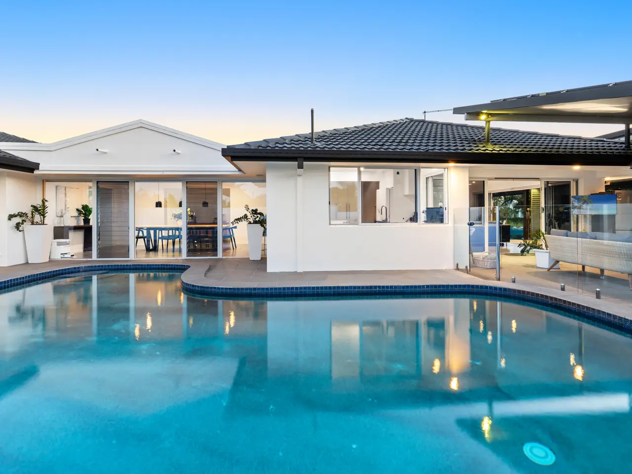 Resort-inspired outdoor sanctuary with glistening pool