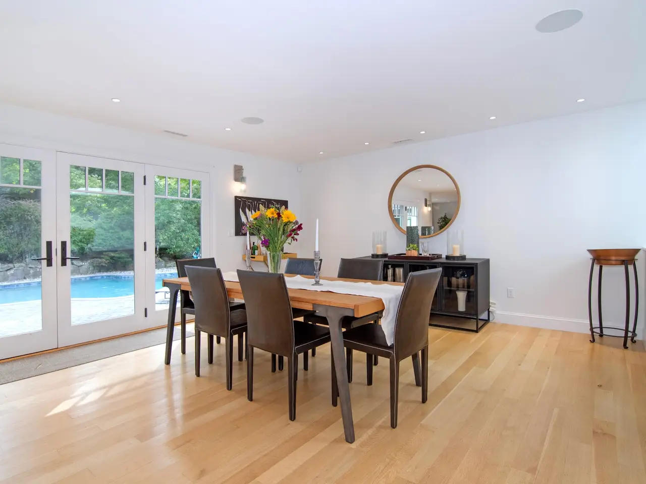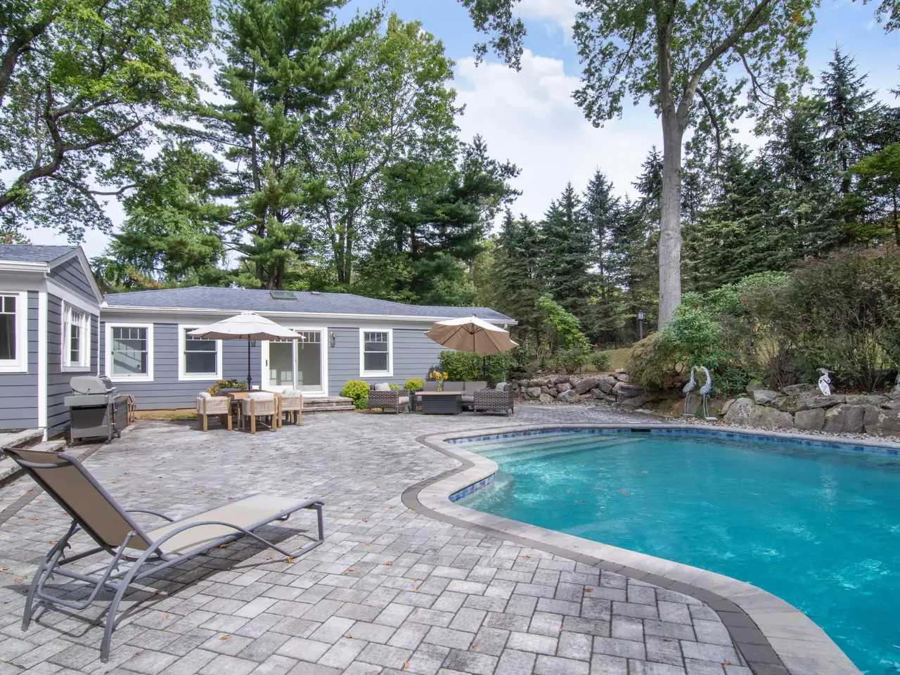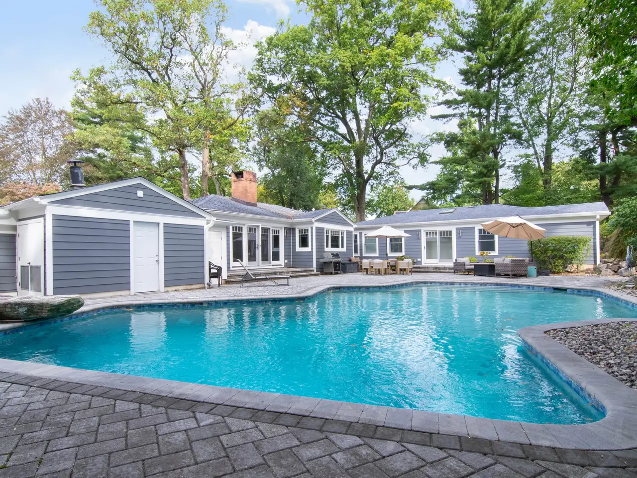 Your dream home in Hartsdale Estates is fully available. This beautifully reimagined and completely rebuilt modern Ranch offers the perfect blend of luxury, comfort, and everyday functionality. Set on nearly an acre in the sought-after Hartsdale Estates neighborhood, this home was thoughtfully designed for easy single-level living and exceptional entertaining. The bright and airy open floor plan features gleaming white oak floors, while oversized windows fill the spaces with natural light. At the heart of the home, a striking three-sided gas fireplace connects the spacious living and dining areas to a true chefs kitchen, complete with high-end Thermador and Fisher & Paykel appliances, ideal for hosting family and friends. The private bedroom wing includes three large bedrooms, two full bathrooms, and a convenient laundry area. The spacious primary suite feels like a personal retreat, featuring a spa-like bath with a soaking tub and walk-in shower, a custom walk-in closet, a cozy sitting area or home office, and even room for your own gym. The finished lower level offers a great bonus space for a family room, playroom, or media lounge, with plenty of storage and the option to add a fifth bedroom and bath. Enjoy your own backyard oasis with a heated Gunite pool, a full outdoor bath/dressing room, and a fully fenced yard that is perfect for entertaining, and making memories all year round. A spacious attached three-car garage completes this exceptional home. This move-in-ready gem has it all.