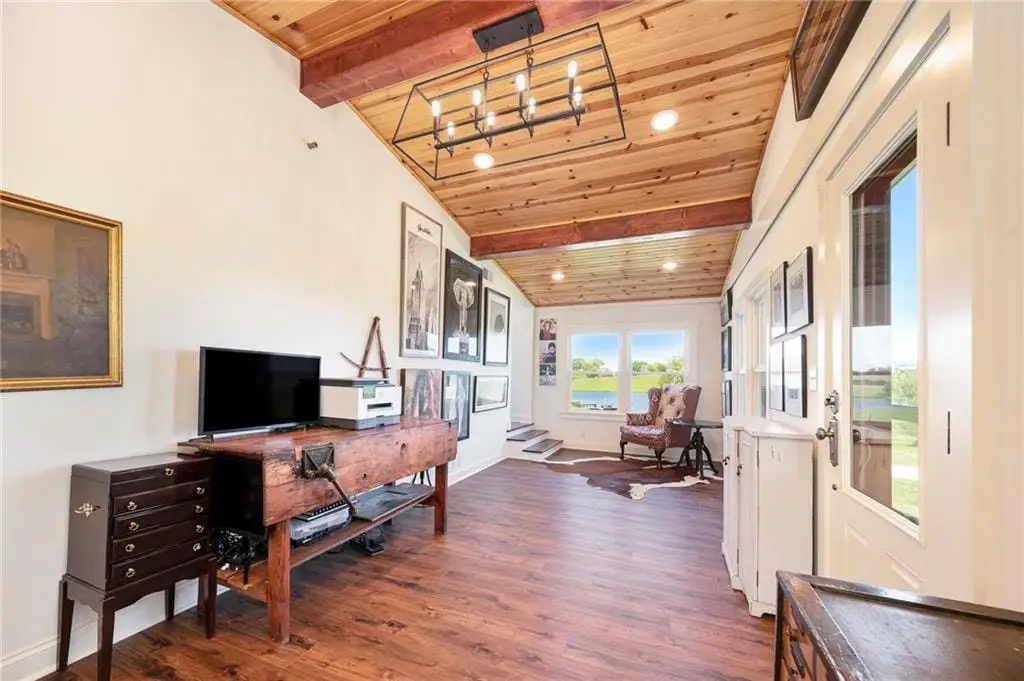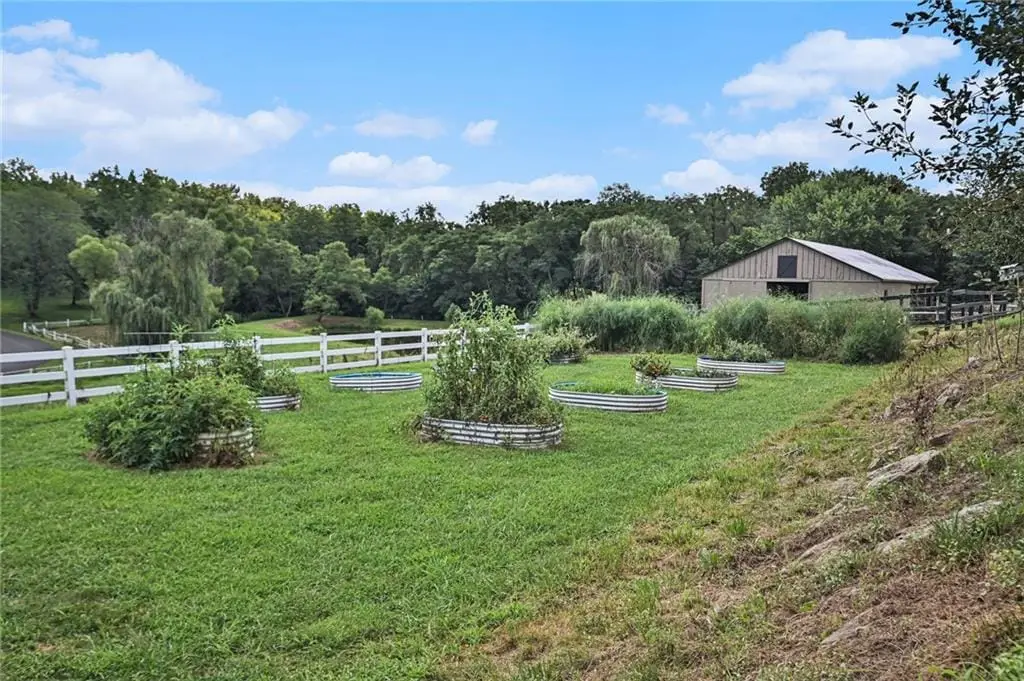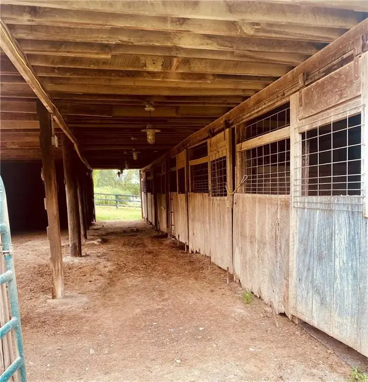 This gated property offers a unique blend of tranquility and modern living, situated on 29 picturesque acres with breathtaking views, including a 6-acre pond. The landscape features rolling hills and a variety of fruit trees, including apple, cherry, plum, pear, and peach. The equestrian enthusiast will appreciate the 7-stall horse barn equipped with electricity, a sheep barn and tractor barn, providing ample space for all your needs. A 4-car detached garage with large doors, perfect for SUVs and trucks, featuring a convenient 1/2 bath and an 8x12 concrete storm shelter for added safety. Enjoy outdoor living with covered patios and walkways leading to the garage, perfect for entertaining or relaxing. The home itself has been completely remodeled, featuring all new wiring and plumbing, a stunning kitchen with custom cabinets, high-end appliances, a butler's pantry area that any chef would adore. The primary bath and closet have also been fully renovated. The home features a newer roof, new HVAC, new windows, combining the charming character of an old farmhouse with the modern conveniences of today. The property is powered by GEOTHERMAL energy ensuring efficiency and sustainability. The pond is complete with a dock & stocked with bass, crappie, perch, and catfish. Experience the best of country living while being conveniently close to amenities and the airport. Don't miss this opportunity to own a slice of paradise!