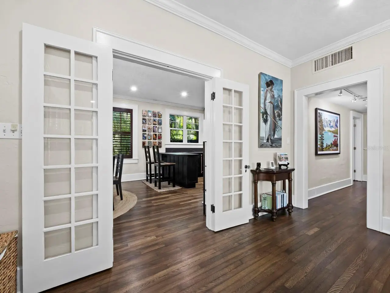 Situated in the highly desirable West of Trail neighborhood of Hudson Bayou, this fully restored 1922 residence is the perfect blend of historic charm and modern conveniences. The property offers 2,284 square feet with two bedrooms and two bathrooms in the main house, plus a one-bedroom, one-bathroom guest house. Renovations include a 2006 conversion of the garage into a guest house with a stucco privacy wall and Chicago brick driveway. In 2018, a spacious primary suite with double closets, a large bath, and French doors to a screened lanai was added. High ceilings, oversized impact windows, and refinished hardwood floors (2024) add to the home’s appeal. Recent updates include a recoated roof with a 10-year transferable warranty (2025), A/C (2023), water heater (2024), encapsulated crawlspace with dehumidifier (2024), foundation reinforcement with new support jacks (2024/2025), and hurricane-rated windows. The kitchen and dining area were fully renovated, featuring custom Calistoga cabinetry and designer appliances (2024/2025). Additional features include recessed lighting, custom closets, a Murphy bed, and a natural gas fireplace. A wellness room with an infrared sauna (2025) completes the interior. Exterior highlights include enhanced landscaping, three all-weather sheds, a pergola with natural gas grill hookups, and a serene brick courtyard surrounded by mature landscaping for privacy. The location is unparalleled, with proximity to Southside Village, the downtown Sarasota bayfront, St. Armands Circle, and the world-famous beaches of Lido and Siesta Key.
