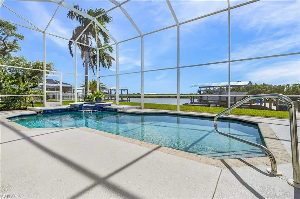 With the BEST view on Pine Island, this getaway stilt home has amazing amenities and upgrades including a wrap around composite boat dock with a 10,000# covered boat lift. Well constructed and maintained, this 4 bedroom, 3 bath home features one of the highest views of San Carlos Bay, Sanibel, and Pine Island Sound. Come and watch the dolphins and birds play. This home features a stone entry and an interior elevator that allows easy access to every floor. The first floor has a stunning open living area, kitchen, living room, and dining room with views of the bay. Impact pocket sliders lead to a large balcony and the two story pool cage allows for truly open living floor plan. The second floor has a spacious primary suite and luxurious bathroom with a sun porch overlooking the bay. The third floor is a den/4th bedroom and balcony looking out at the bay, with views of the Sanibel bridge and Punta Rasa. The ground floor has a paver driveway, an extra long and high 2 car garage, full bath, laundry, workshop, storage and a beautifully resurfaced in ground pool with cage, solar and electric pool heat, and a new pool pump. There is a fully automated AquaLink system to control pool functions. The backyard is aluminum fenced for a pet safe backyard. City water plus a well plumbed for Rainbird automated/zoned lawn irrigation. This home has optimum hurricane protection with cement board siding, accordion and roll down shutters, impact sliders on main level, closed cell spray foam insulation, shear walls, and upgraded hurricane strapping. It is fully wind mitigated. This home has new electric service panel and meter in 2022, retractable garage door automatic roll down screen in 2024, new composite front porch and rear stairs in 2024, and new washer and dryer in 2023. Two story pool cage was also new is 2023. Make your appointment to see this fantastic home.
