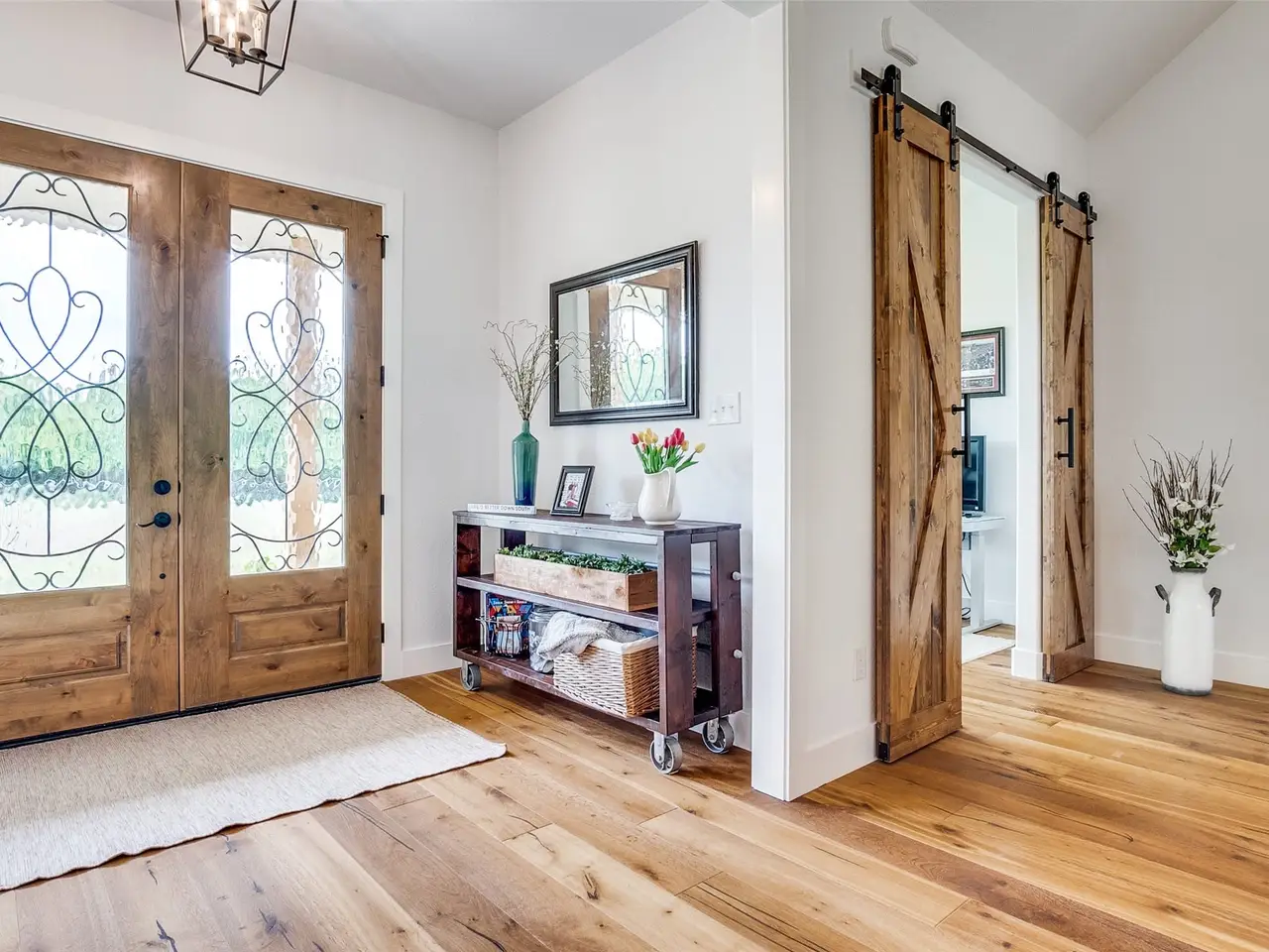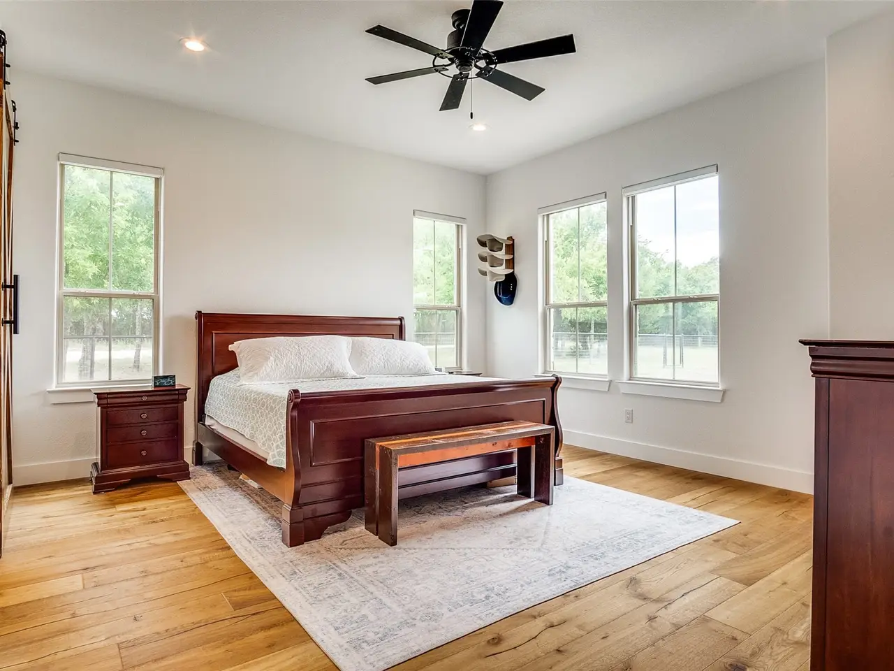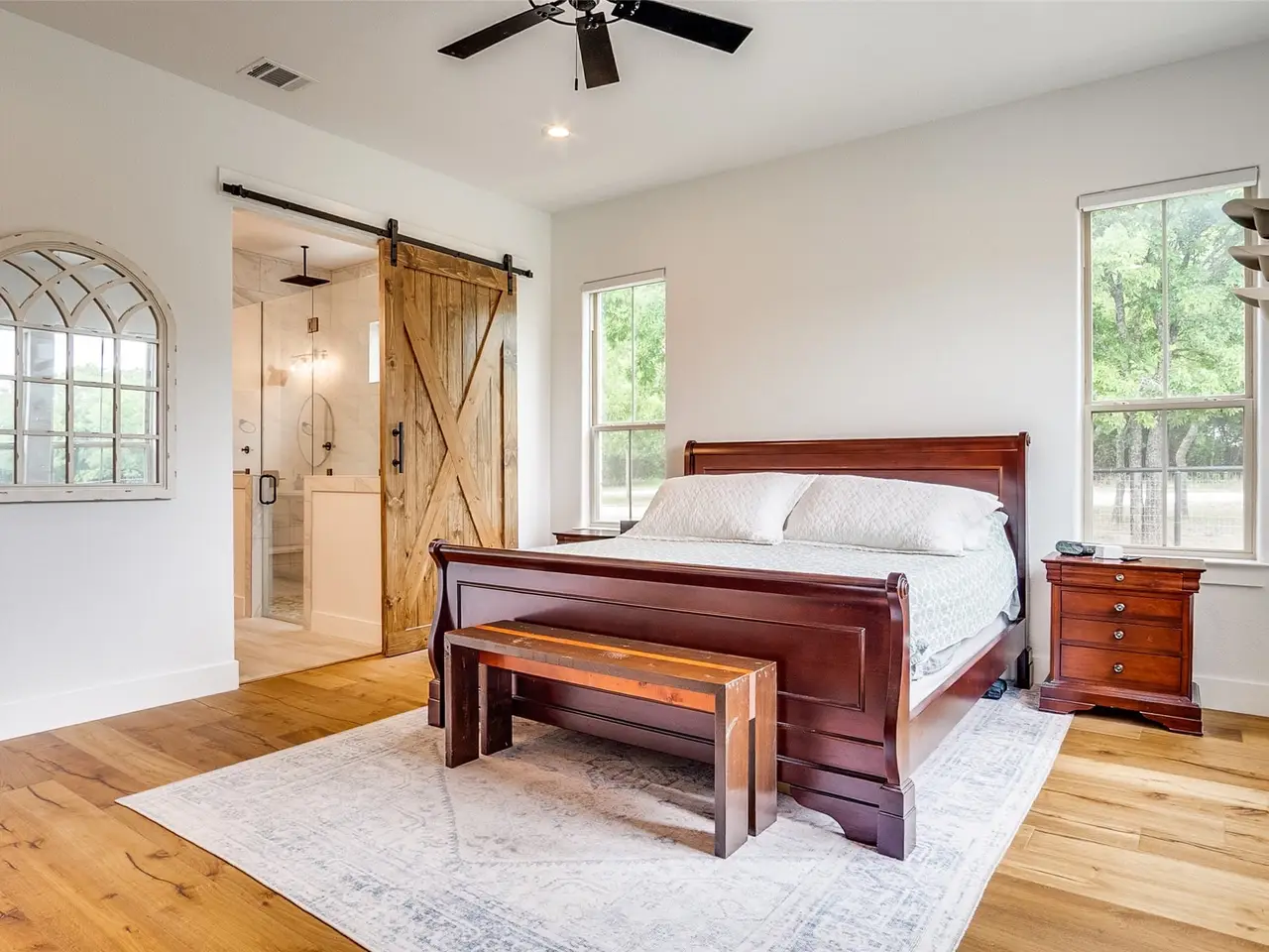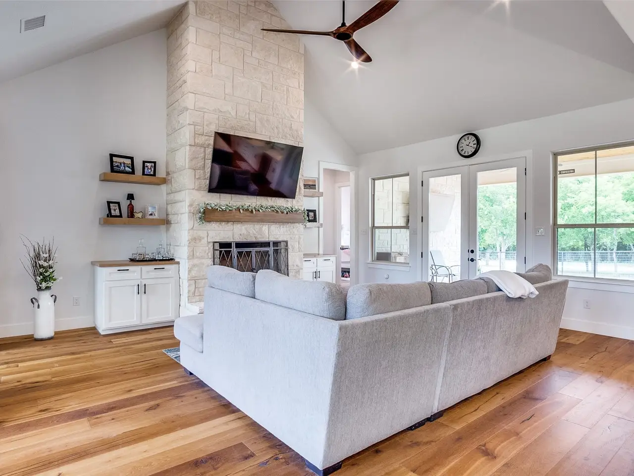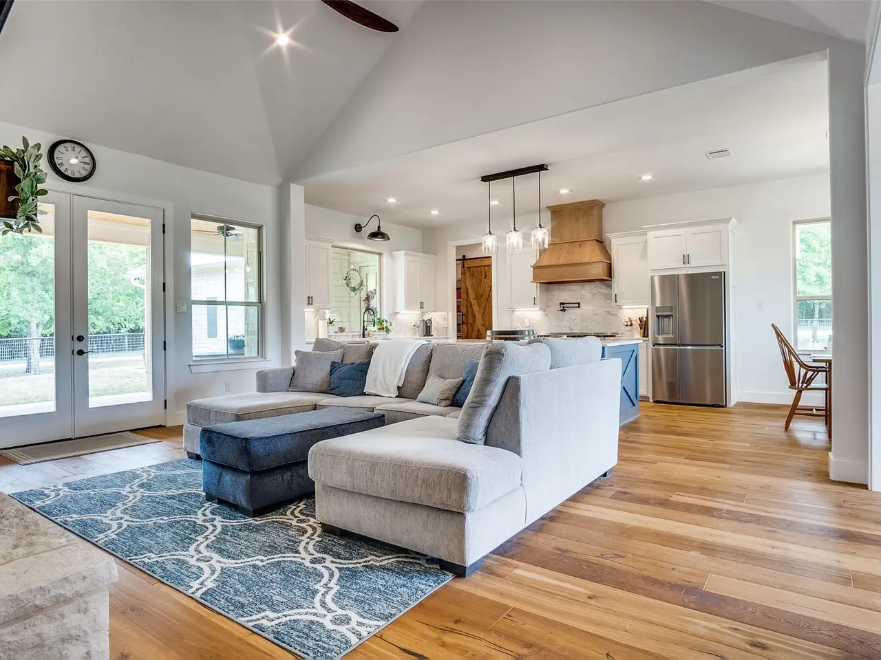 Beautifully constructed 3-bedroom, 2.5-bath custom home situated on 52+/- acres in Grandview, TX. This home features quality craftsmanship throughout, including custom woodwork, barn doors, and a floor-to-ceiling stone fireplace in the open living area. The metal roof provides long-term durability and low maintenance. The open-concept kitchen includes a large island, stainless steel appliances, ample cabinetry, and generous counter space. The spacious primary suite offers a walk-in shower with dual rain shower heads, double vanities, and a large walk-in closet. Secondary bedrooms are well-sized and suitable for guests and family. The home also features a dedicated laundry room, dedicated office flex space, and a two-car garage. Outdoor features include a covered patio, full-length front porch, custom pipe-and-no-climb fencing around the yard, and mature trees. The property is currently under an agricultural exemption and is well-suited for livestock, horses, or recreational use. Located just minutes from downtown Grandview and major highways, this property provides both privacy and accessibility. 10 minutes to Cleburne, 40 minutes to downtown Fort Worth.