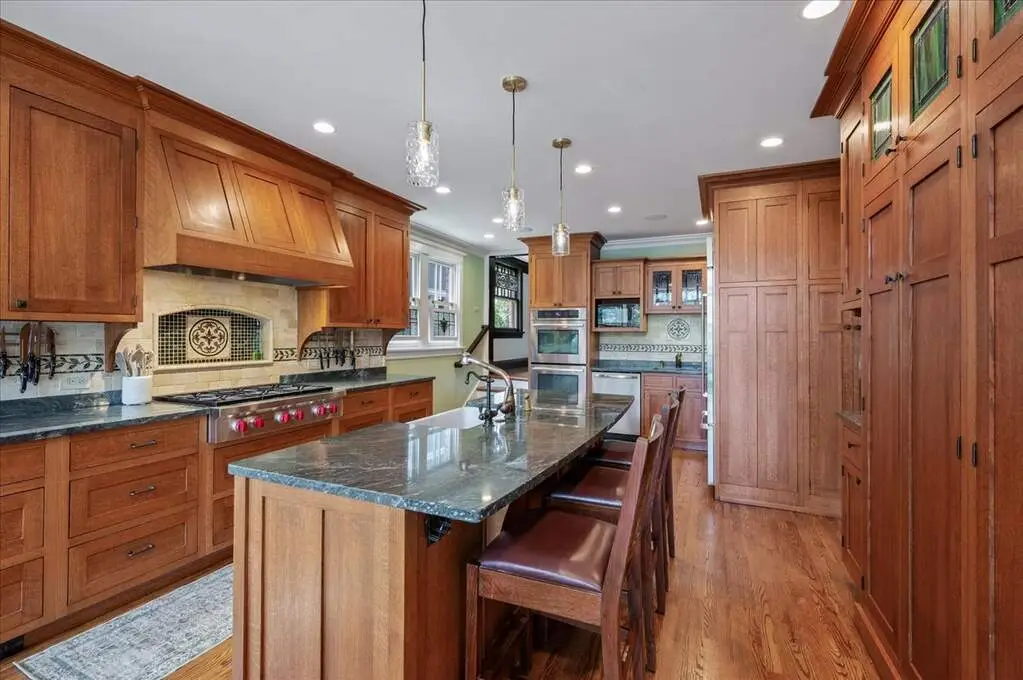 Rare opportunity to own this quintessential East Wilmette solid brick four square with 5 bedrooms, 4.1 baths on a 50 x 190 lot, on the beautiful brick street of Forest Avenue! The front porch welcomes you into this stately home with loads of character throughout. Spacious first floor living room has beautiful millwork throughout with a gas fireplace, flanked by built ins. Dining room is perfect for entertaining large crowds. The sun-drenched gourmet kitchen is a dream for any culinary enthusiasts with quarter-sawn wood cabinets, granite countertops, center island, double oven, Wolf cooktop, Subzero refrigerator, two dishwashers and two sinks. The breakfast area is a perfect gathering spot and opens to the sunny family room. The back of the home has large south-facing windows with a sizeable mudroom that opens to the backyard. The second floor boasts a primary suite with two closets, a sitting area and spa-like primary bath, loaded with a jacuzzi soaker tub, steam shower and a double vanity. Three additional bedrooms and a hall bath finish the floor. The third-floor retreat is a book lovers dream. Full of bookshelves and nooks to read, plus a bedroom and a full bath. The expanded finished basement has a wet bar and room for a pool table, hang out space, work out room, full bath and workshop, plus laundry and lots of storage. Outside, you can enjoy the lush and professionally landscaped private yard with a blue stone patio, perfect for outdoor entertaining or simply relaxing in nature. There is a gas connection for a grill. Stone paver walkway to the garage and additional carport/interior sports court! The location of this home is unbeatable, blocks to Elmwood Dunes, the new and improved Plaza Del Lago, Gilson Beach, Central Elementary School, Metra train and vibrant downtown.