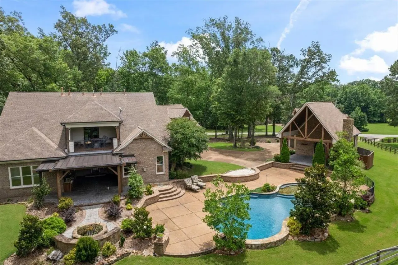 *OPEN 11/23* New price on this incredible home. Incredible opportunity for the space, guest house, pool setting and views that this property offers. 105 Aston Cross is where elegance meets resort-style comfort. At 6290 sqft per appraiser, this stunning custom-built craftsman home offers panoramic walking trail and lake views, specially finished teak floors, and a bright, open-concept design. Designed for both refined living and grand entertaining, the home features a private pool and waterfall hot tub, an outdoor kitchen and fireplaces! Detached guest/pool house has private garage parking, porch w/fireplace, living room, 2 bedroom spaces (one doesn't have closet), full bath and kitchenette area. Covered porches provide seamless indoor-outdoor living, while the serene setting in Fayette County ensures privacy and exclusivity. The setting and views are unbeatable for entertaining and enjoying. Heated and cooled sqft includes guest house.