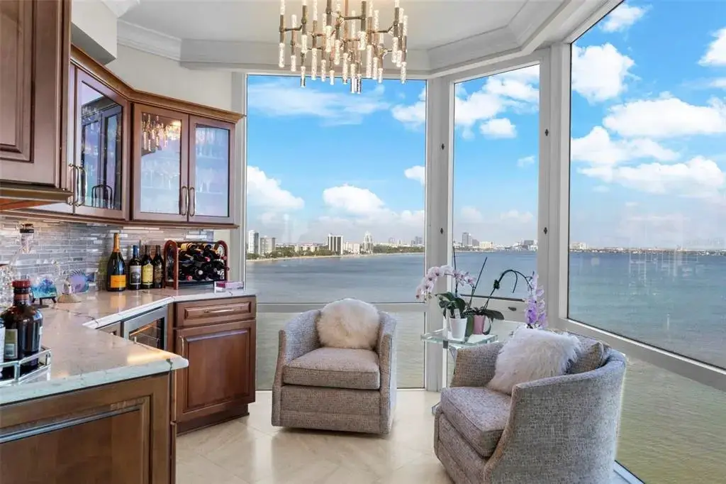 Welcome to the Bayshore Regency, one of Tampa’s most prestigious residences. Completely renovated in 2020, Unit 1401 boasts modern luxury and stunning views. Every detail was carefully considered, from the reconfigured kitchen with custom Kraft Maid cabinetry to the travertine floors throughout. The kitchen features top-of-the-line appliances, including a double-door Sub-Zero refrigerator, Wolf double ovens, and a sleek black glass Wolf electric cooktop. The large island offers ample storage, while a spacious walk-in pantry adds even more convenience. The open concept kitchen flows into the dining and living areas, perfect for entertaining. The bar area, with floor-to-ceiling windows, offers expansive views of Hillsborough Bay and downtown Tampa, with a glass-front Sub-Zero beverage center and ice maker. The living room includes multiple sliding doors, recessed lighting, and a built-in electric fireplace with color-changing flames. The private elevator entrance opens to a stunning foyer with a custom etched glass door and coffered ceiling. The primary bedroom features its own balcony, two walk-in closets with custom storage, and a luxurious marble shower. The second bedroom offers privacy and scenic views, with automatic Hunter Douglas window treatments. With only two condos per floor, enjoy ultimate privacy and breathtaking sunrise views and sunset views.