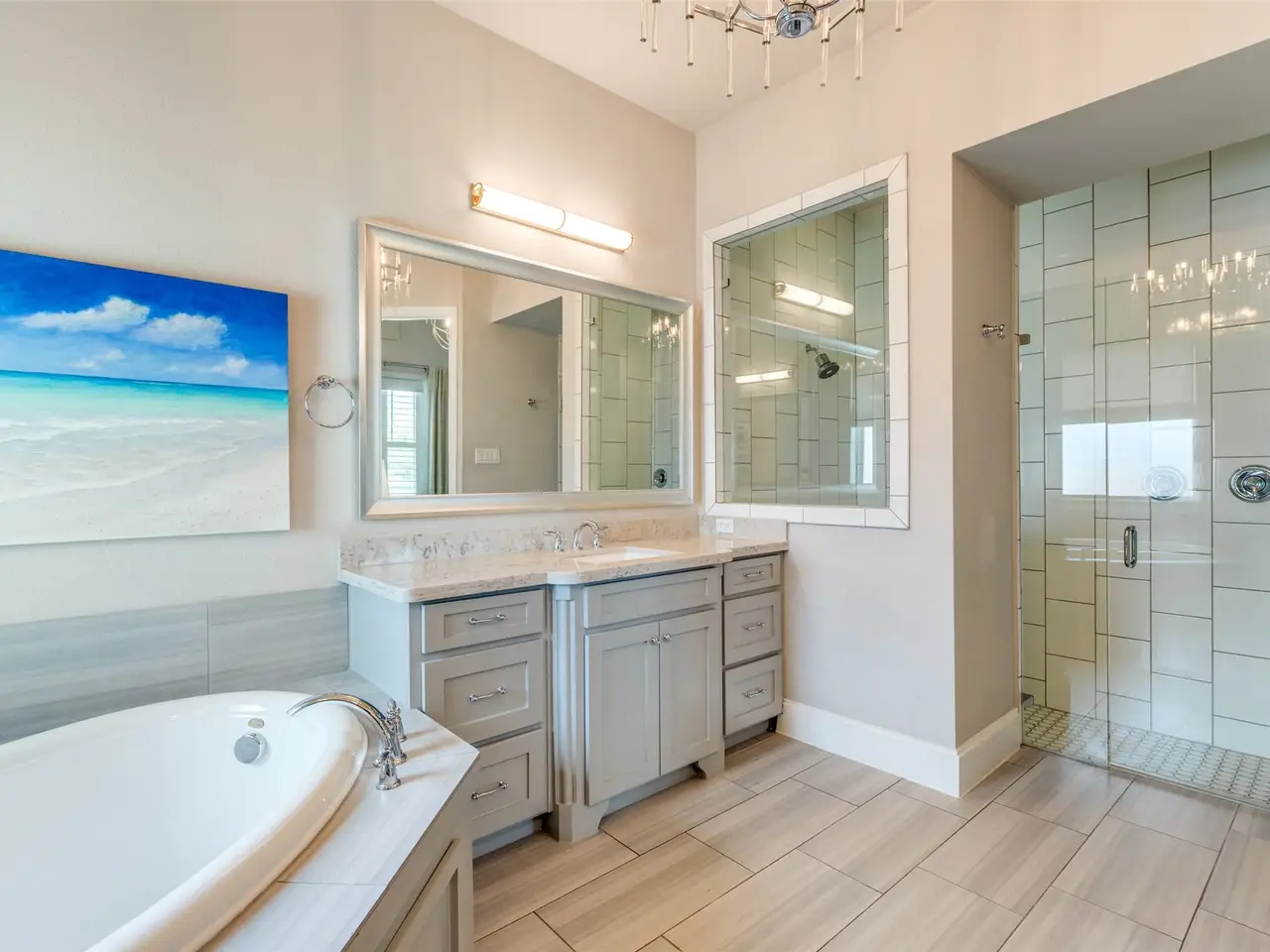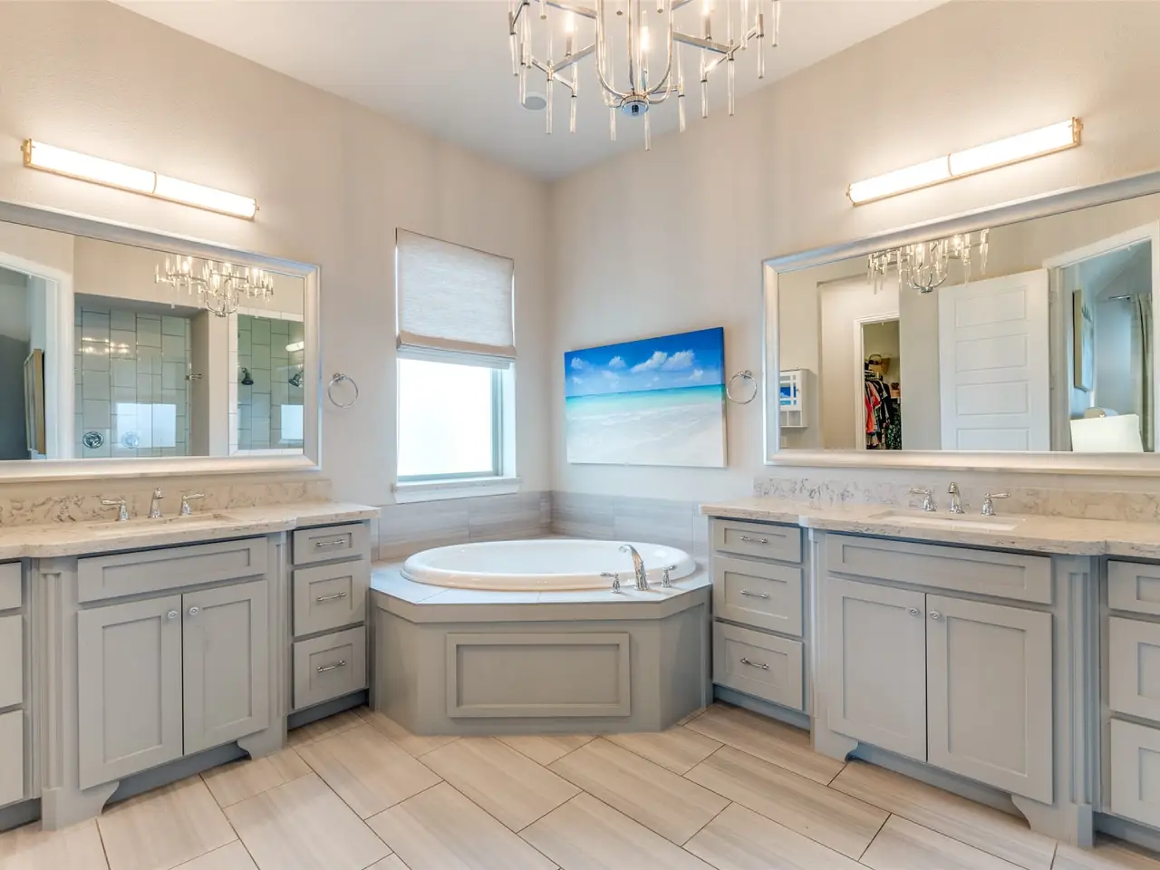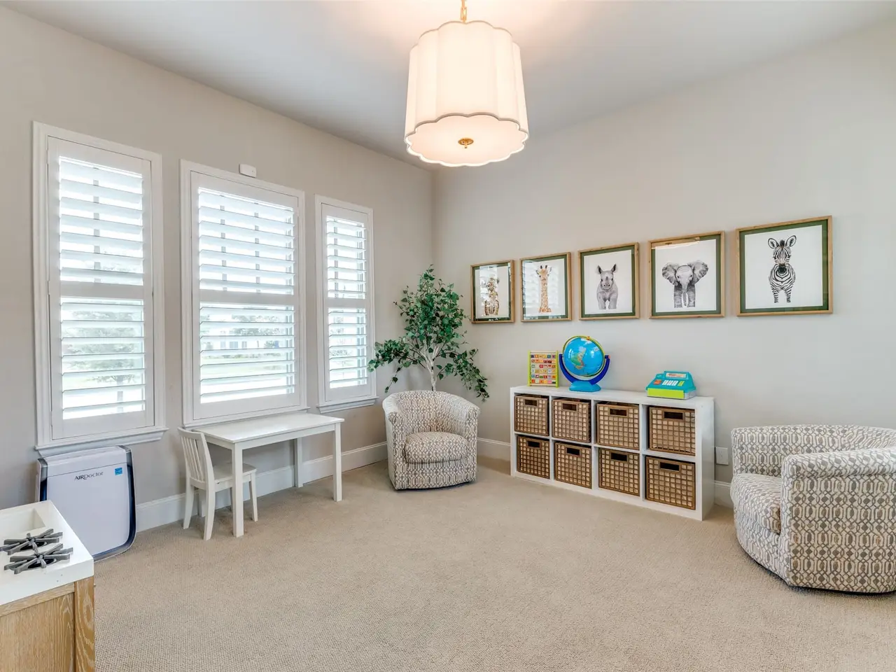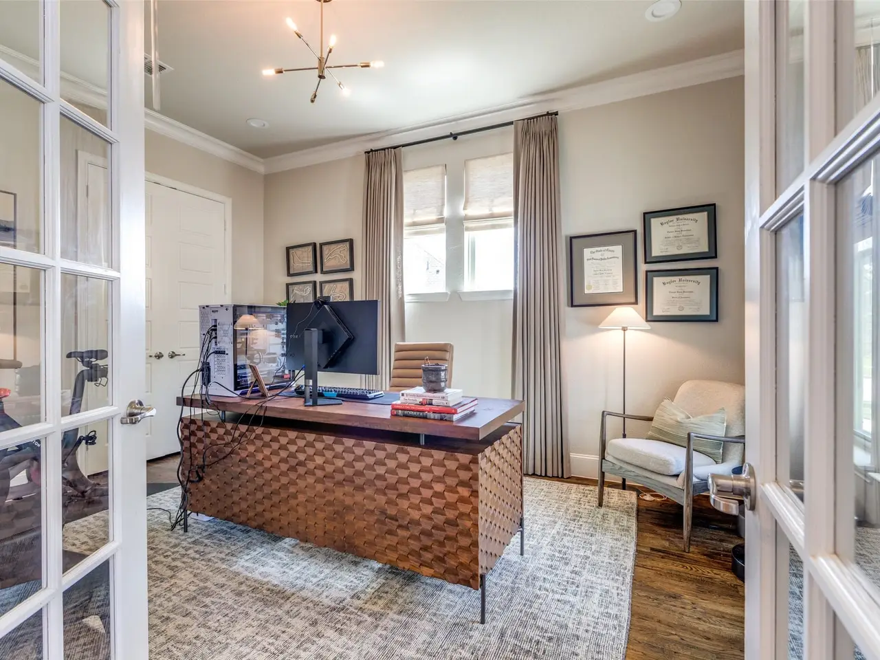 Stunning two-story modern Craftsman, nestled in the beautiful Canals at Grand Park. This beautifully designed home offers four spacious bedrooms with an additional space off the Primary Bedroom that could be used as an office, nursery, or exercise room, four full bathrooms, and a 3-car garage. Elegant hardwood floors guide you through the main level and into a chefs kitchen featuring white cabinetry, stainless steel appliances with a gas cooktop, a classic white subway tile backsplash, and an oversized island ideal for gathering. Thoughtfully designed extras include a wine bar, a media room, and a cozy covered back patio with a fireplace. The generous side yard wraps around to the backyard, offering ample space for outdoor living or a future pool. All light fixtures were updated to visual comfort and Ralph Lauren lighting. All new custom draperies.