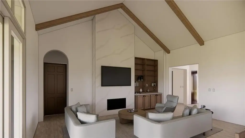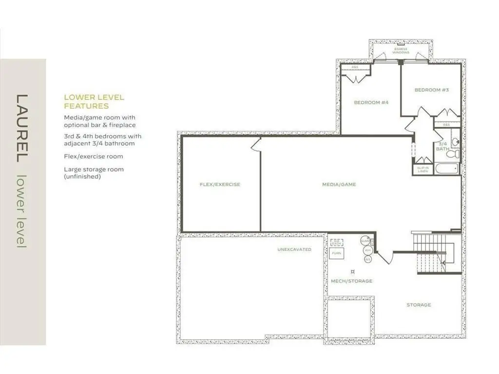 Welcome to the stunning Laurel home, a perfect blend of luxury and functionality! This exquisite residence features a spacious main level with a chef’s gourmet kitchen boasting a large island, oversized center island & walk-in pantry, ideal for culinary enthusiasts. The dramatic great room/dining room with vaulted ceiling and 12' sliding patio doors with transoms opens to an optional great room beamed ceiling or sunroom, enhancing the open and airy feel. Enjoy a luxurious primary suite with ceramic tile shower, freestanding tub, dual vanities, and walk-in closet with laundry room access, plus an optional vaulted ceiling for added elegance. A second bedroom, 3/4 bathroom, and study with double door entry complete this level, alongside a spacious mudroom with built-in bench and walk-in closet. The lower level offers a versatile media/game room with an optional bar & fireplace, perfect for entertainment.