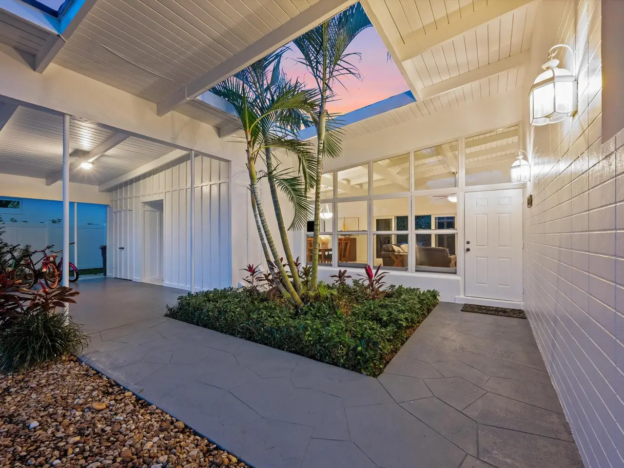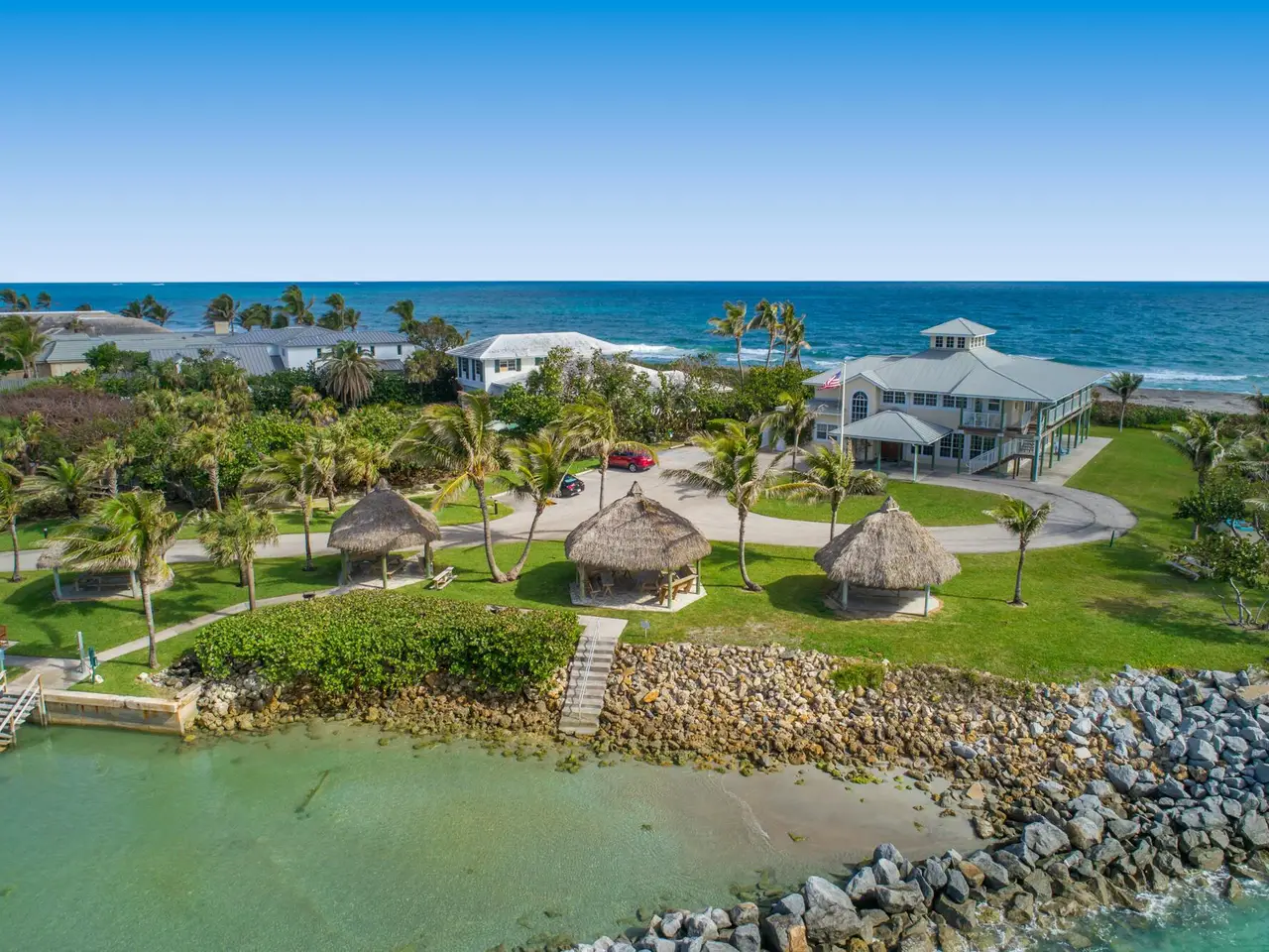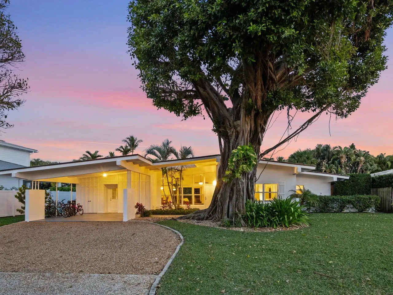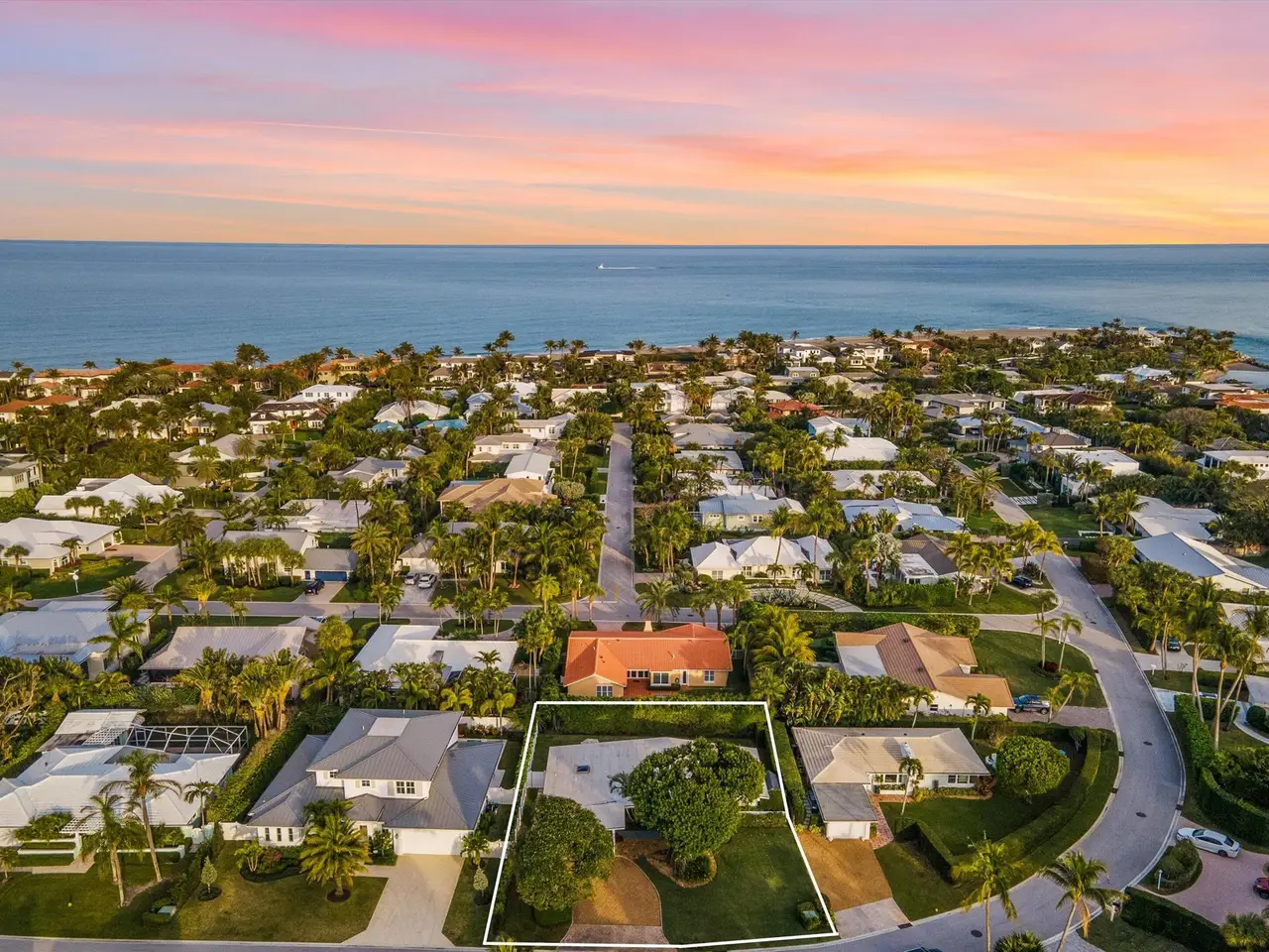 Just steps from the private, secured beaches of Jupiter Inlet Colony, this one-level Mid-Century coastal retreat sits on a prime interior lot, offering both charm and opportunity. Fully furnished and turnkey, this CBS-constructed home features 3 bedrooms, 2 baths, and an open floor plan where the kitchen seamlessly connects to the dining and living areas. With soaring volume ceilings, exposed beams, and all-impact windows and doors, the home is designed for both style and security. Outside, a lushly landscaped backyard oasis awaits, complete with a private pool enveloped by greenery. Offered at land value and sold as-is. This property presents a rare chance to build new or renovated in one of the most coveted beachside communities.