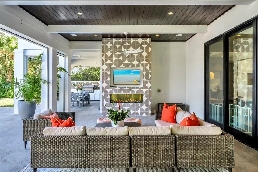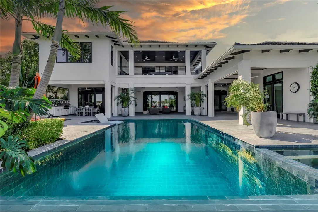 Modern European meets coastal West Indies in this stunning 6,628 sq ft Riomar Bay home. Built in 2019 on a .49-acre lot with 120' of Intracoastal frontage, it offers 6BR/4.5BA including 1/1 cabana. The traditional floor plan is enhanced by modern architectural elements. Kitchen features a 16' Pompeii quartzite island. A media room anchors the 2nd floor, connecting the luxurious primary suite & guest rooms. A resort-style pool, multiple outdoor seating areas, boat dock with lift, and expansive loggias with unobstructed views of Quail Valley River Club complete this retreat.