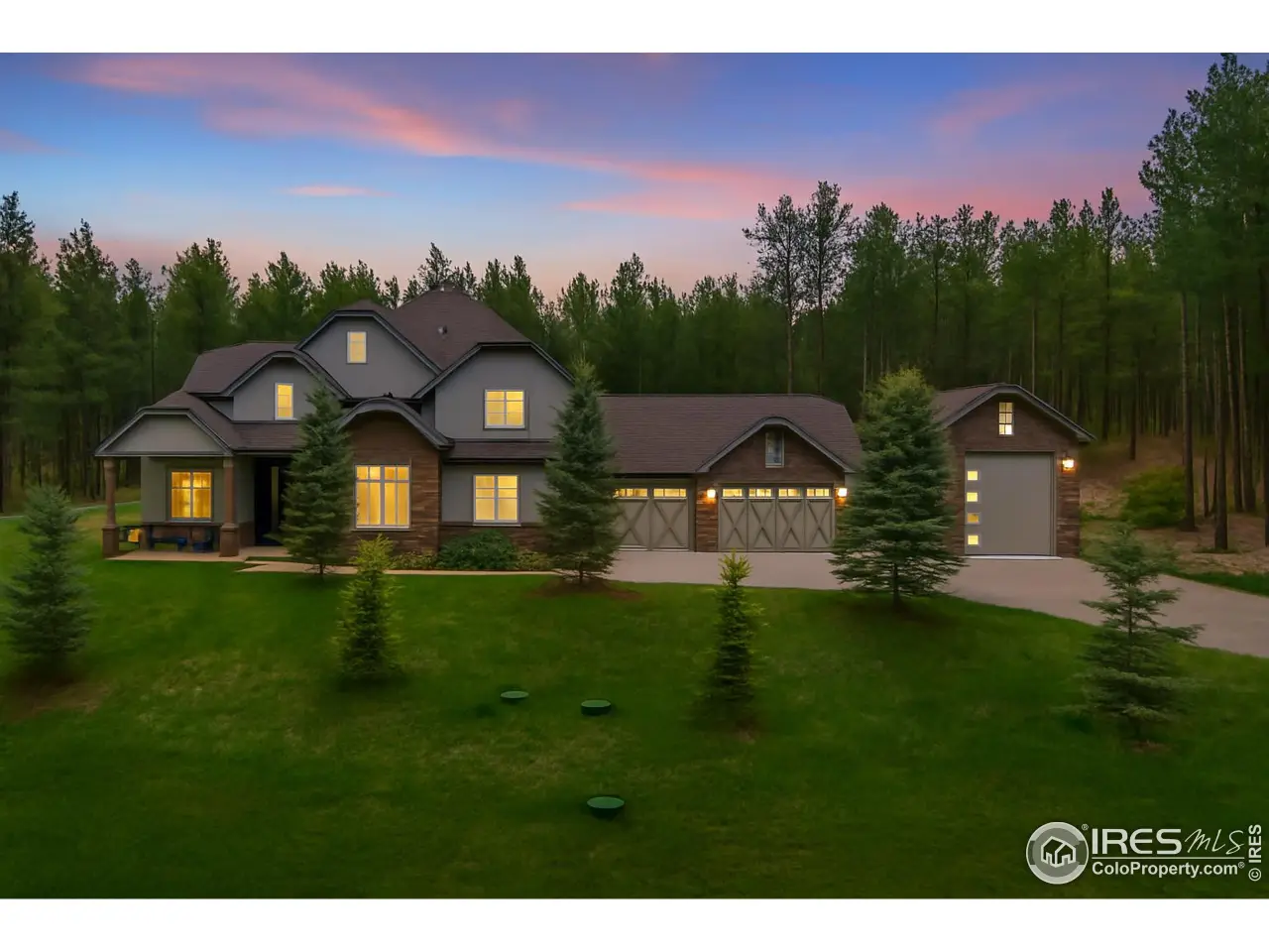 Experience Colorado living at its finest in this stunningly reimagined mountain-modern gem. This indoor-outdoor haven is tucked away on 3 private, wooded acres within the gated Deerfield Preserve. It's surrounded by towering pines, open space, & ample wildlife, including deer, wild turkeys, and serene tranquility. Yet, with swift access to I-25, Castle Rock, & southern Denver, you'll enjoy rural bliss without losing convenience. Step into a world of refined style where every detail caters to modern comforts. The main-floor primary suite is a haven, featuring a fireside sitting nook, a luxurious freestanding tub, a dual-head shower, sleek quartz finishes, & a spacious walk-in closet seamlessly connected to the laundry. Three generously appointed bedrooms with en-suite baths & a versatile loft complement each other. Hand-troweled walls add charm, while three HVAC zones ensure year-round comfort. The gourmet kitchen, a culinary dream, features quartz countertops, a marble backsplash, soft-close cabinetry, illuminated glass shelving, & a walk-in pantry. Dual laundry rooms simplify daily tasks, & a custom Morningstar elevator provides connectivity throughout all levels. A new roof, installed in 2024, adding peace of mind. The vast 3,000-sq-ft finished basement, with soaring 10-ft ceilings, offers endless possibilities: a fifth bedroom with en-suite bath, a built-in bunk room, & ample space for a home theater, gym, or game room. Outside, a covered patio opens to a strikingly landscaped, irrigated yard, where Colorado's lively seasons unfold. Storage & utility are unmatched, with a heated four-car attached garage & a separate heated 50' deep RV garage/outbuilding-complete with 50-amp service-ideal for adventure gear or hobbies. Move-in ready & exceptionally rare, this 3-acre estate blends unparalleled artistry, luxurious upgrades, & natural splendor. Seize the opportunity to claim this serene retreat, just moments from Castle Rock's premier dining, shopping, golf, & parks.