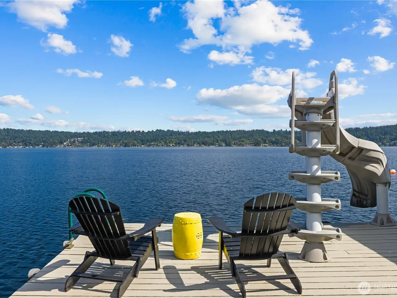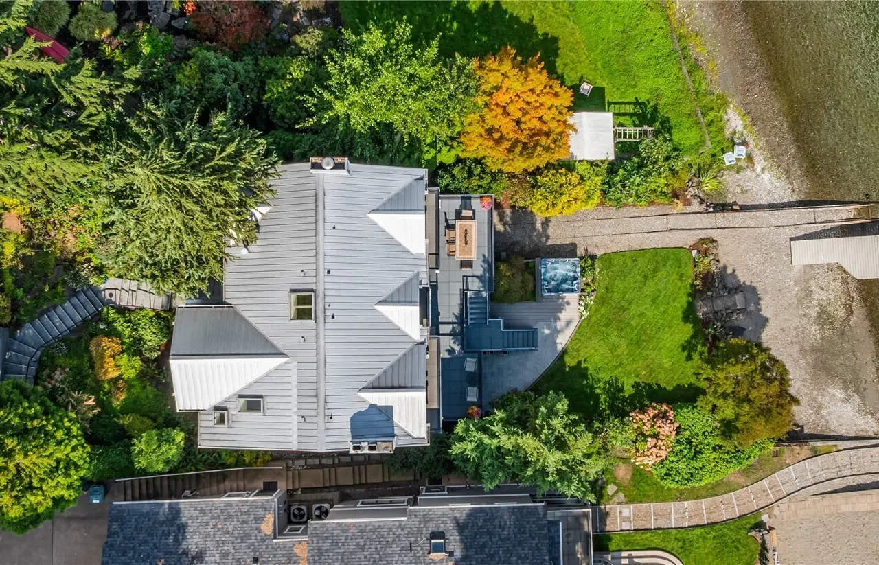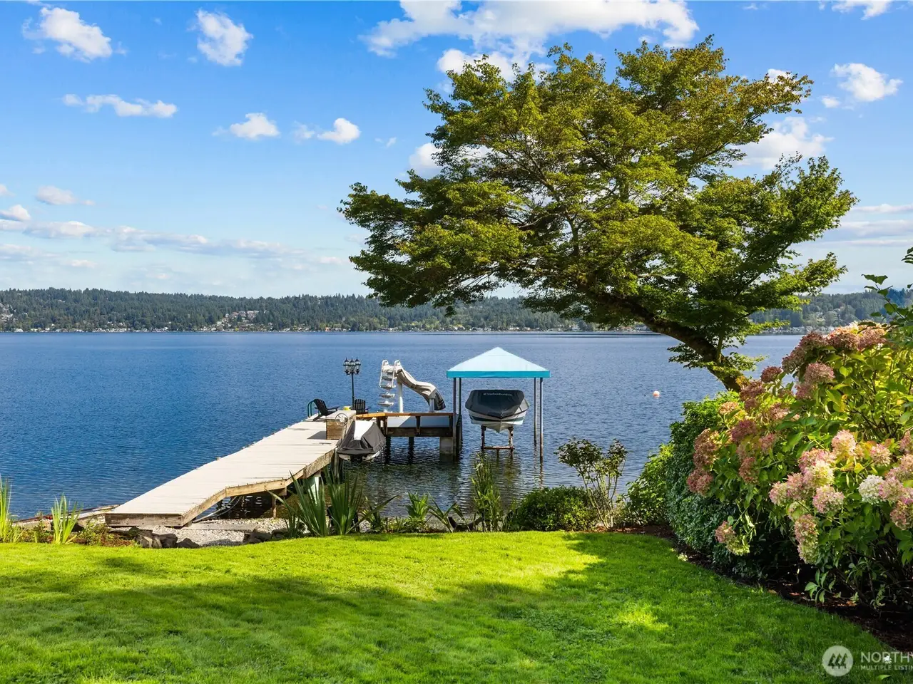 Nestled on 50 feet of lakefront, this Baylis Architects home, remodeled in 2004, turns everyday living into lakeside adventure. Launch from the dock or soak in the hot tub as golden sunlight dances across the water. Blooming hydrangeas and fruit trees frame a vibrant lawn alive with natural beauty. With granite counters and a farmhouse sink, the open kitchen flows toward the deck for sunset cocktails overlooking shimmering water. Upstairs, the primary suite with fireplace and jetted tub offers serene retreat. A bonus room with wet bar and wine cellar invites entertaining. Steps away, a 3-car garage hosts a charming ADU with loft, while a rare boathouse with functional tram houses your boat, completing this extraordinary waterfront lifestyle.