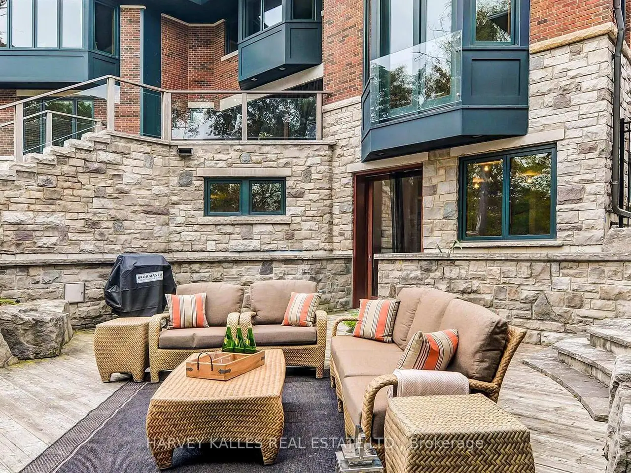 Discover a gem, custom-built as a multi-generational home, offering over 11,000 sq ft of luxurious living space on a rare 125ft double lot at the edge of the Humber Valley in the tree-lined Kingsway neighbourhood. This residence is a statement of contemporary elegance and sophistication, perfect for the discerning family. Inside, experience clean lines and exquisite details that enhance comfortable luxury living, including sound-isolated suites, Jatoba hardwood floors, stunning Persian serpentinite kitchen countertops, and heated stone floors for ultimate comfort. Accessibility is a key feature, with snow melt for the front porch, steps, ramp and driveway, a commercial 4x6 ft elevator, and 4 ft wide hallways to ensure effortless movement throughout the residence. The ground floor features a bright, open-plan living area that seamlessly integrates the chefs kitchen, dining, and living spaces, extending to a partially covered upper deck with a 17ft wide opening. A heated 3-car garage is cleverly positioned at the side of the house. The primary retreat is where luxury meets tranquility, featuring two generous walk-in closets and two ensuites one complete with a massage room and whirlpool tub offering tree-top views. Two additional spacious bedrooms, each with walk-in closets, share a thoughtfully designed bathroom suite with dual sinks, ample storage, and a separate area for added privacy. The oversized fourth bedroom also includes its own ensuite bathroom and walk-in closet, providing comfort and convenience for family or guests. The ground floor bedroom suite with a Juliet balcony offers a perfect retreat for guests. Venture to the finished lower level, where 10+ ft ceilings create a light and airy ambiance. This expansive space features a wide sliding door leading to the lower deck, ideal for entertaining. With multiple entertainment areas, including a stepped home theatre and sprawling park-like backyard, this home is designed for those who appreciate spacious comfort.