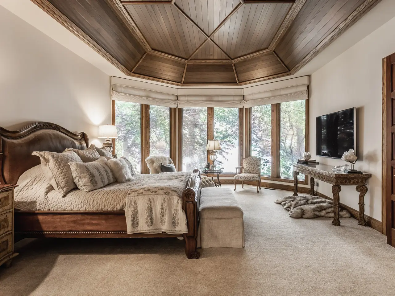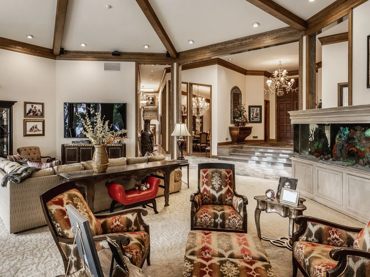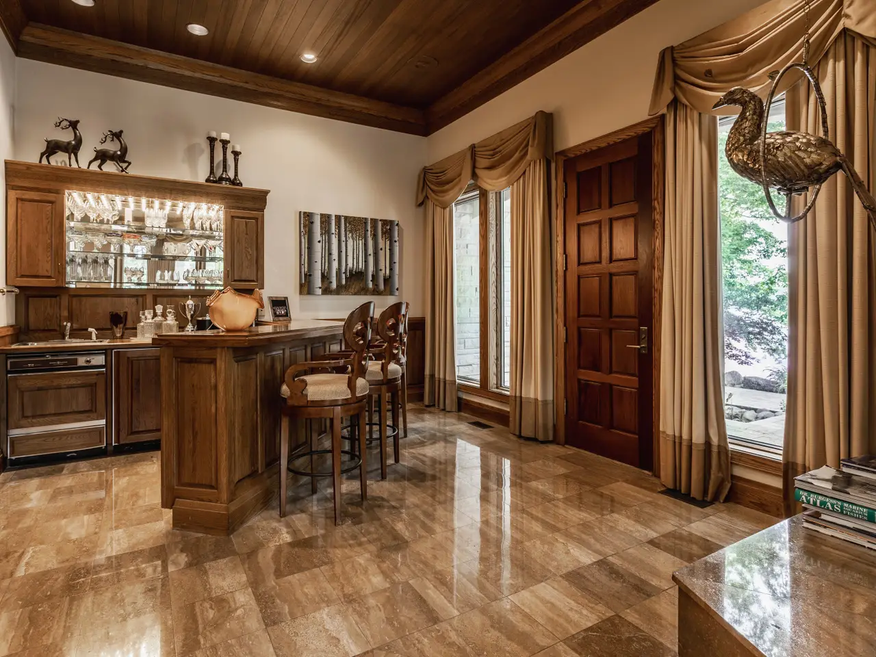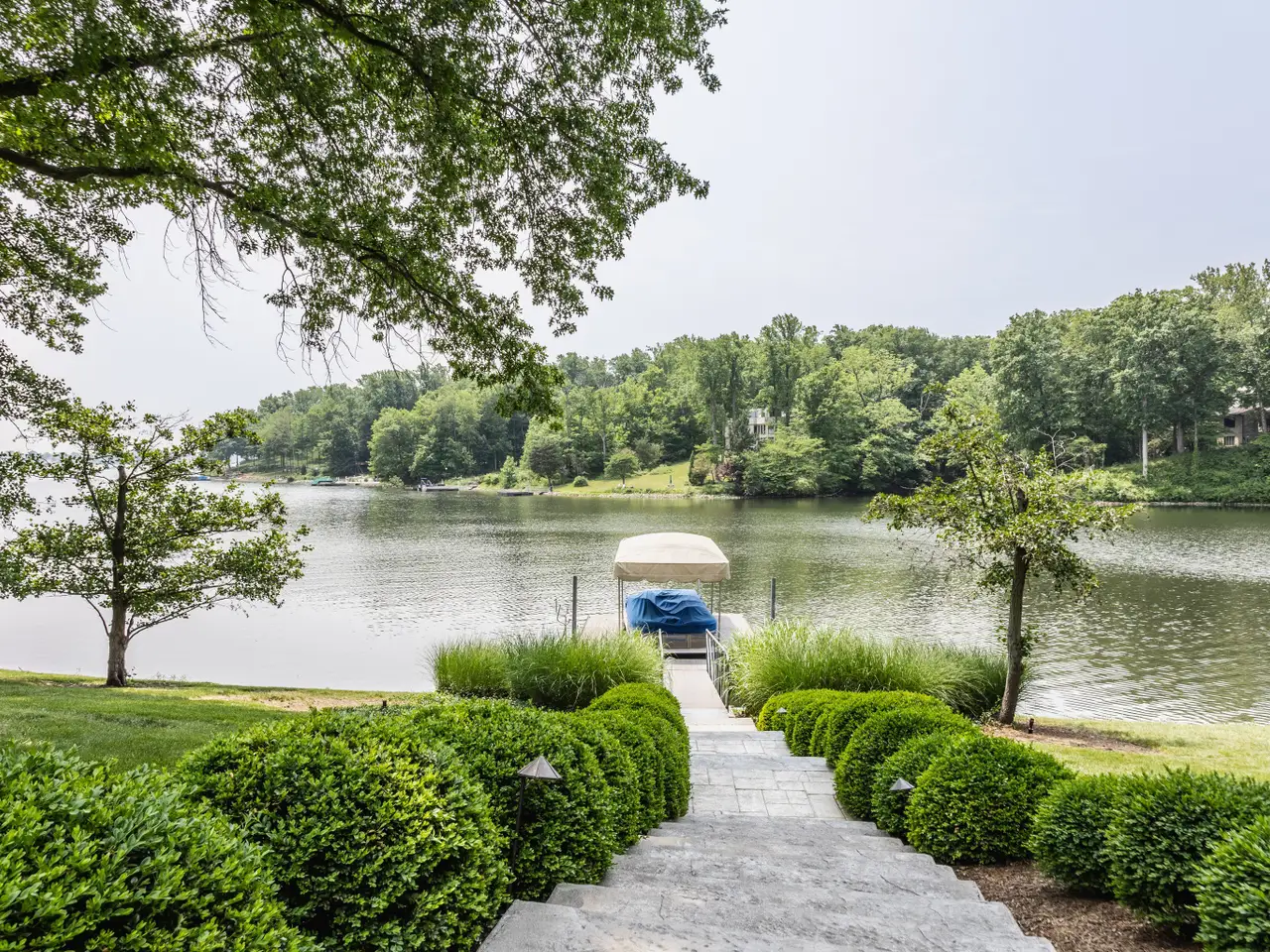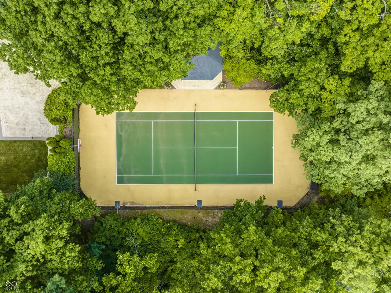 Exclusivity at its finest, this gated estate expands over 5.5 acres and is perfectly situated to capture breathtaking, panoramic views with 1,250 feet of water frontage on Eagle Creek Reservoir. The lush oasis creates the feeling of a serene, private sanctuary featuring a koi pond that spans the back of the home, Gunite swimming pool & spa w/cabana & tennis court w/cabana. A spacious great room welcomes guests w/expansive bay windows that brighten the room, which also features a vaulted ceiling w/exposed wooden beams, built-in aquarium, fireplace & adjoining bar area with access to the backyard retreat. Cozy den embellished with wood-paneled walls, built-ins & marble fireplace. Gourmet kitchen boats upscale appliances and a sun-washed breakfast area.
