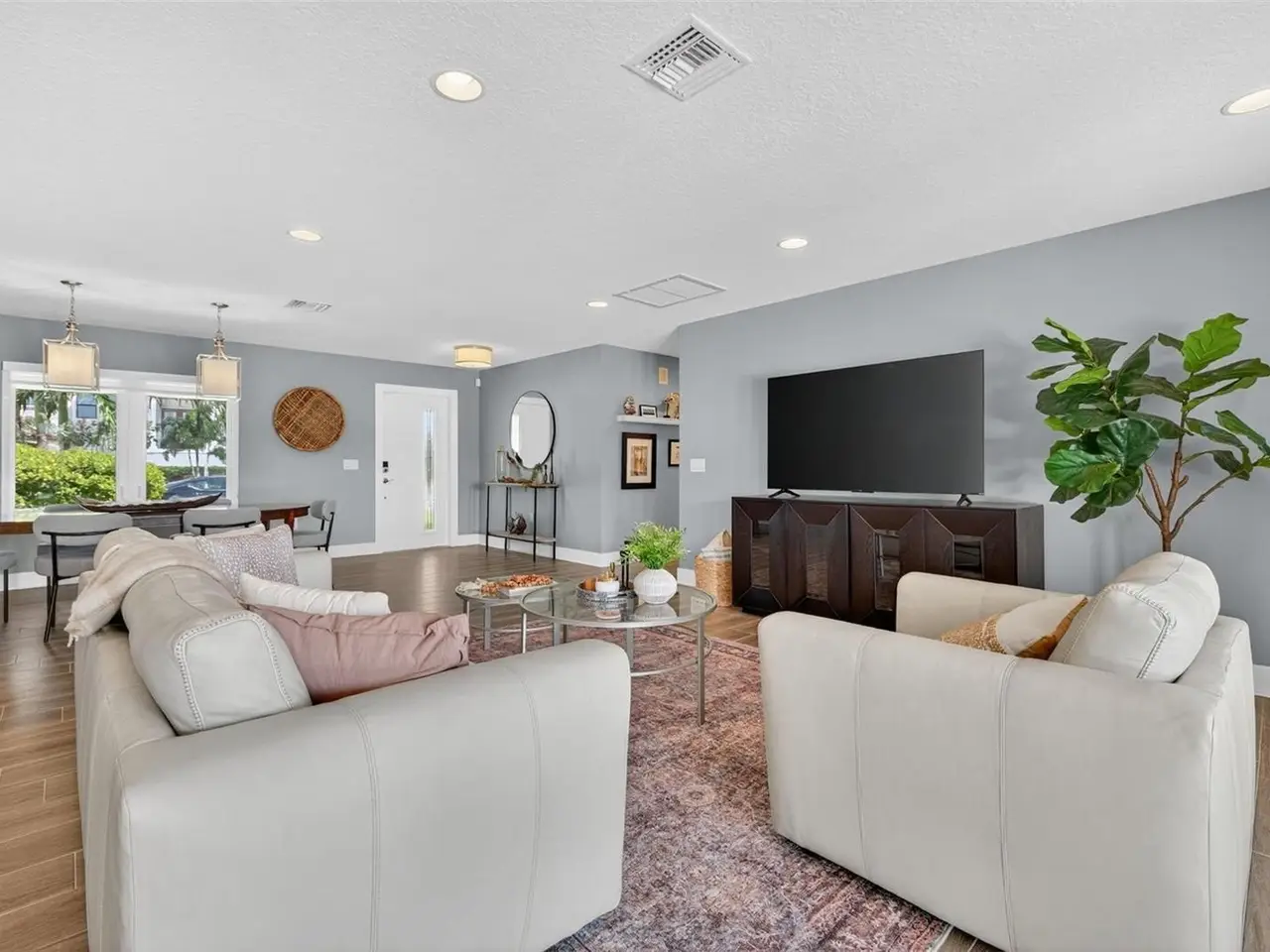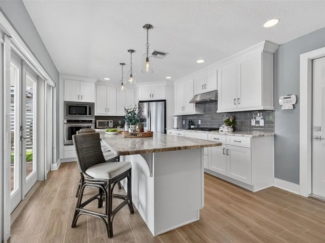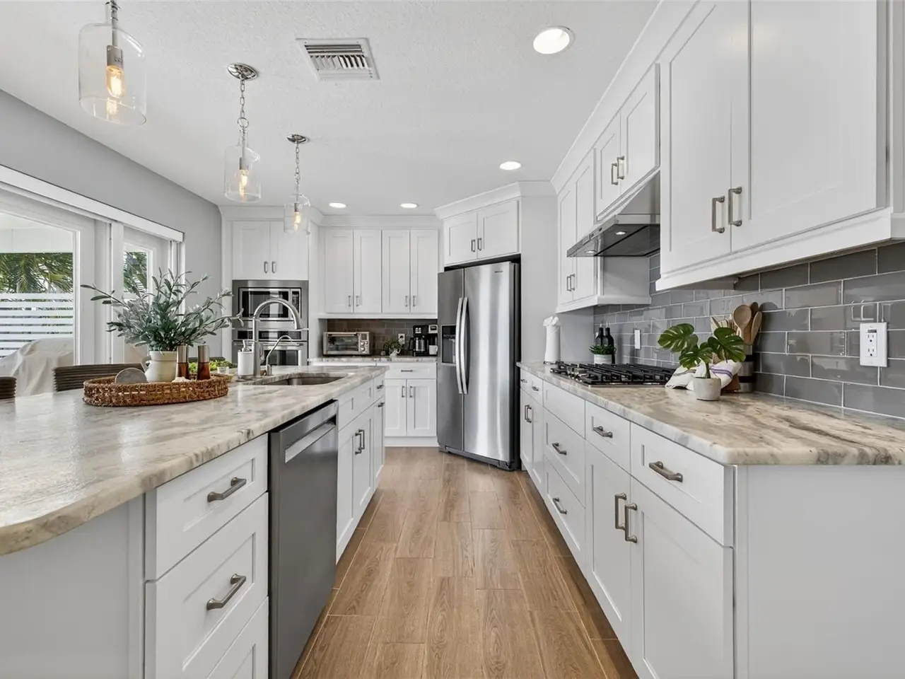 Under contract-accepting backup offers. Experience waterfront living at its finest in this beautifully remodeled Island Estates residence. With three bedrooms, two bathrooms, and refined finishes throughout an airy, open layout, the home is designed to make every day feel like a vacation. Step through the front door and take in sweeping water views and light-filled living spaces, perfect for effortless coastal living and easy entertaining. The kitchen is a true centerpiece, featuring a large leathered-granite island ideal for casual dining, a 4-burner gas cooktop, sleek stainless-steel appliances, abundant storage, and captivating views that make cooking a pleasure. A split-bedroom plan ensures privacy for the primary suite, complete with a beautifully tiled shower and a quartz dual-sink vanity, while comfortable guest rooms and a large indoor laundry room add everyday convenience. Open the back doors to a resort-style backyard with a saltwater in-ground pool, a covered patio, lush tropical landscaping, and seamless canal vistas. Your private dock includes 30-amp electrical service, ready for a future boat lift and ideal for launching kayaks and paddleboards, so you can spend more time on the water and less time in the car. Blending luxury, function, and the best of the Island Estates lifestyle, you are just minutes to Clearwater Beach, dining, and the open water, this waterfront retreat is tailor-made for buyers who want to live where they love to play.