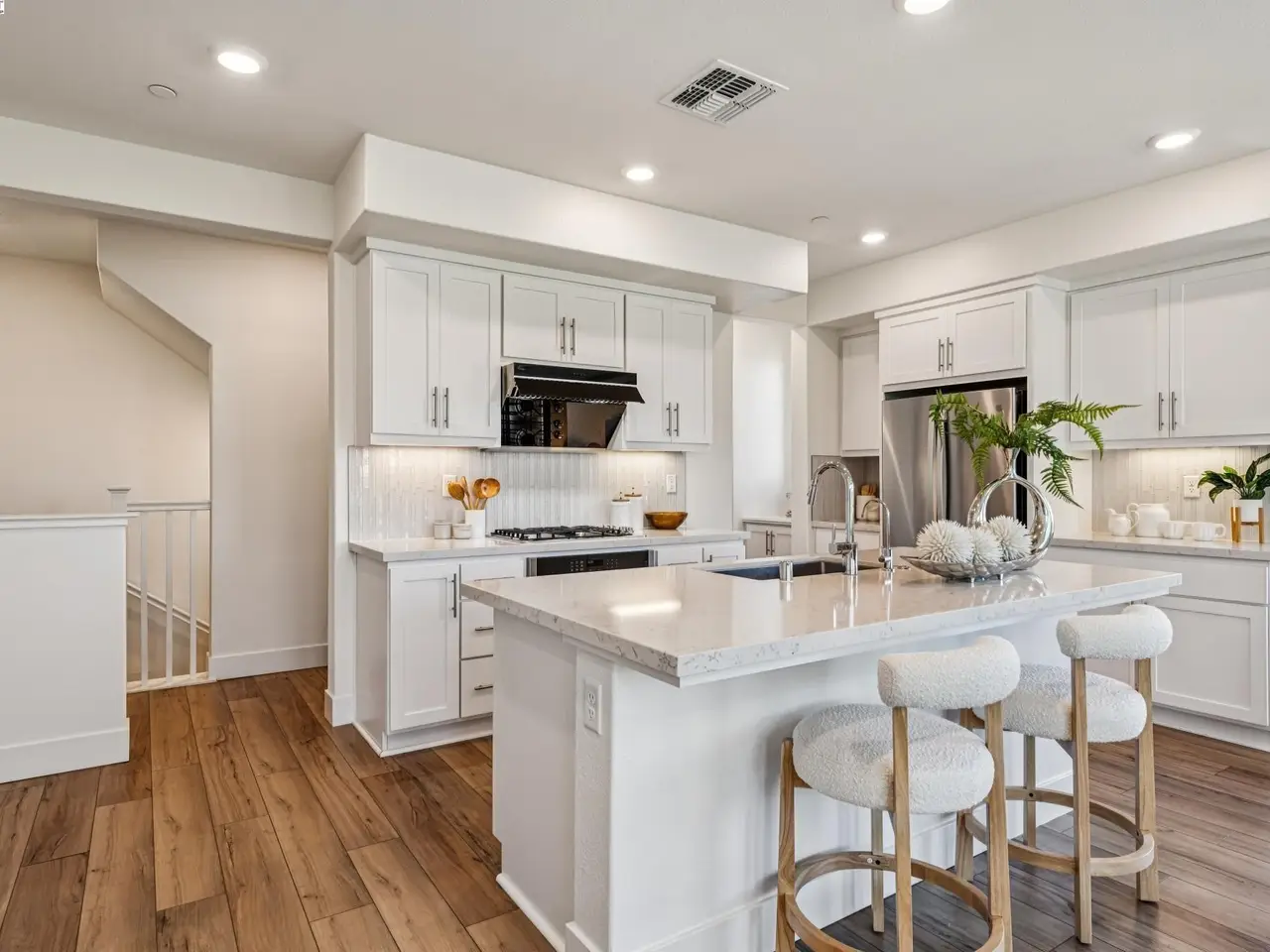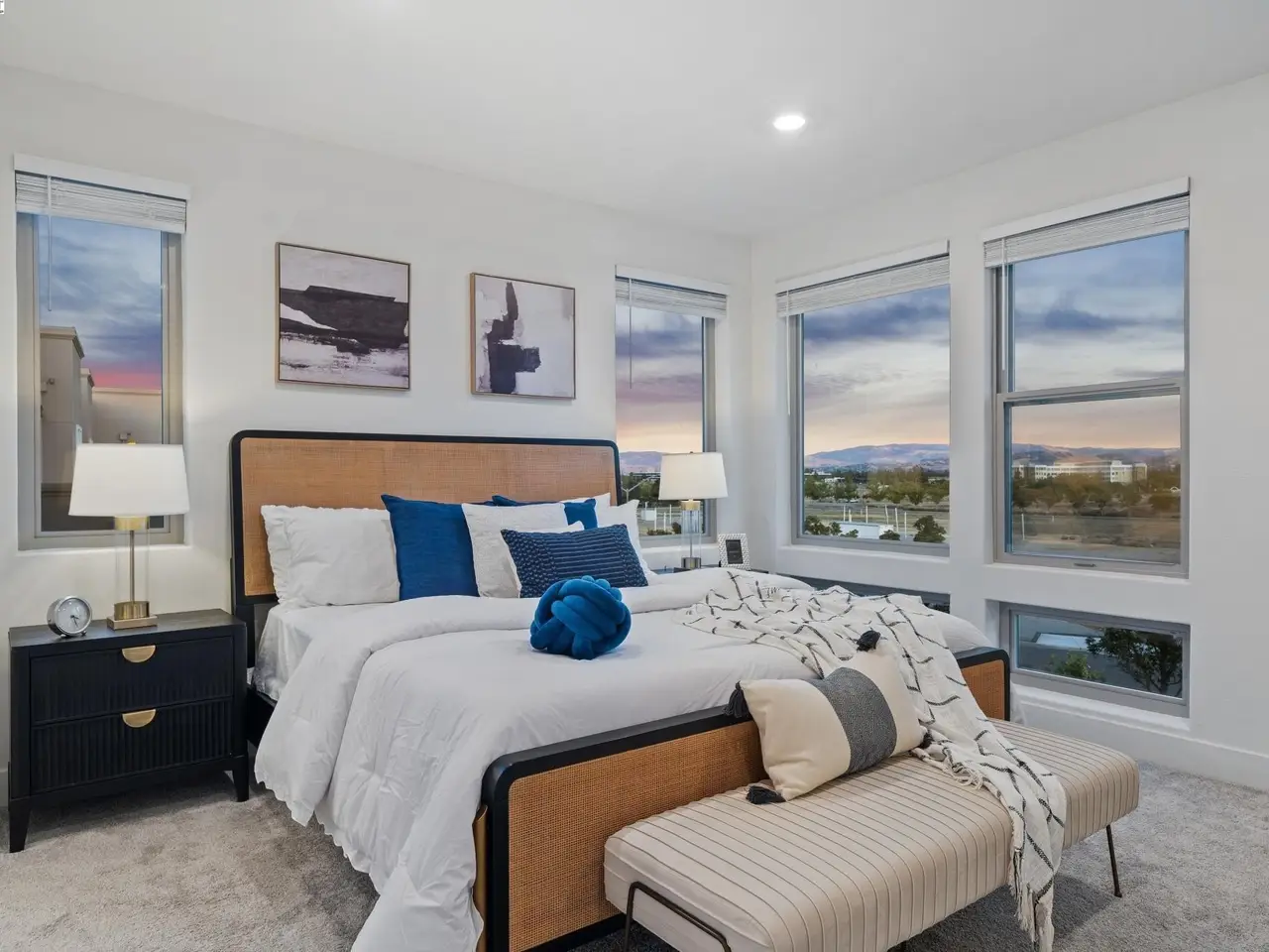 Welcome to this exceptional multi-story corner condo NORTH EAST Facing Front Door. The main level presents an inviting open living concept, flooded w/natural light from an abundance of windows that also offer stunning views. Enjoy peace & quiet thanks to the triple-paned windows designed for superior sound reduction. Contemporary kitchen, a chef's delight featuring sleek quartz countertops, elegant white shaker cabinets, a gas range, stainless steel appliances & a walk-in pantry. Spacious primary suite w/a walk-in closet, a double vanity & a large walk-in shower. 2bed/1ba on the same floor with washer/dryer in closet. Attached two-car garage w/driveway parking ensures easy access. Step out onto your private balcony to enjoy the views. Boulevard Rec Center, featuring a heated pool, meeting rooms, workout areas, a game room & outdoor lounges. Commuting is a breeze with easy access to major highways & just a 5-minute walk to BART. This prime location places you minutes from everyday essentials: groceries, banks, farmer's markets, diverse shopping options, charming cafes, exquisite dining, and entertainment at the local theater. Top-rated schools, beautiful parks, and a variety of recreational facilities are also within easy reach.