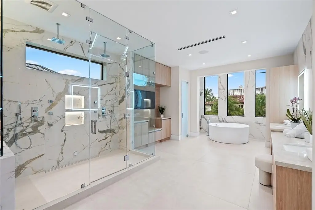 Step into refined coastal living with this stunning, architect-designed modern waterfront home in exclusive Seven Isles. A dramatic two-story entry leads to 7 en-suite bedrooms, a dedicated office, and a bonus room in the luxurious primary suite complete with sauna and steam. Walls of glass fill the home with natural light and peaceful water views. Enjoy 100'± of water frontage, a full-length concrete dock, and direct ocean access. some of the features include a spacious upstairs family room, lift-ready 4-car garage with epoxy floors, Control4 smart system, custom cabinetry, hot and cold plunge spa, covered terraces for entertaining, and exceptional finishes. Tons of light and open spaces. Just minutes to beaches, shops, restaurants and international airports. By appointment only.