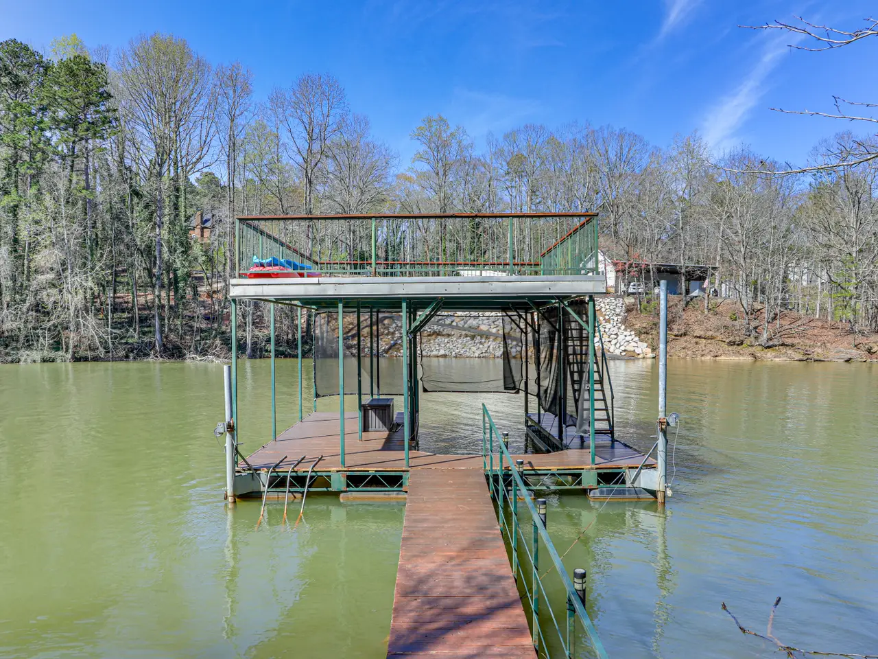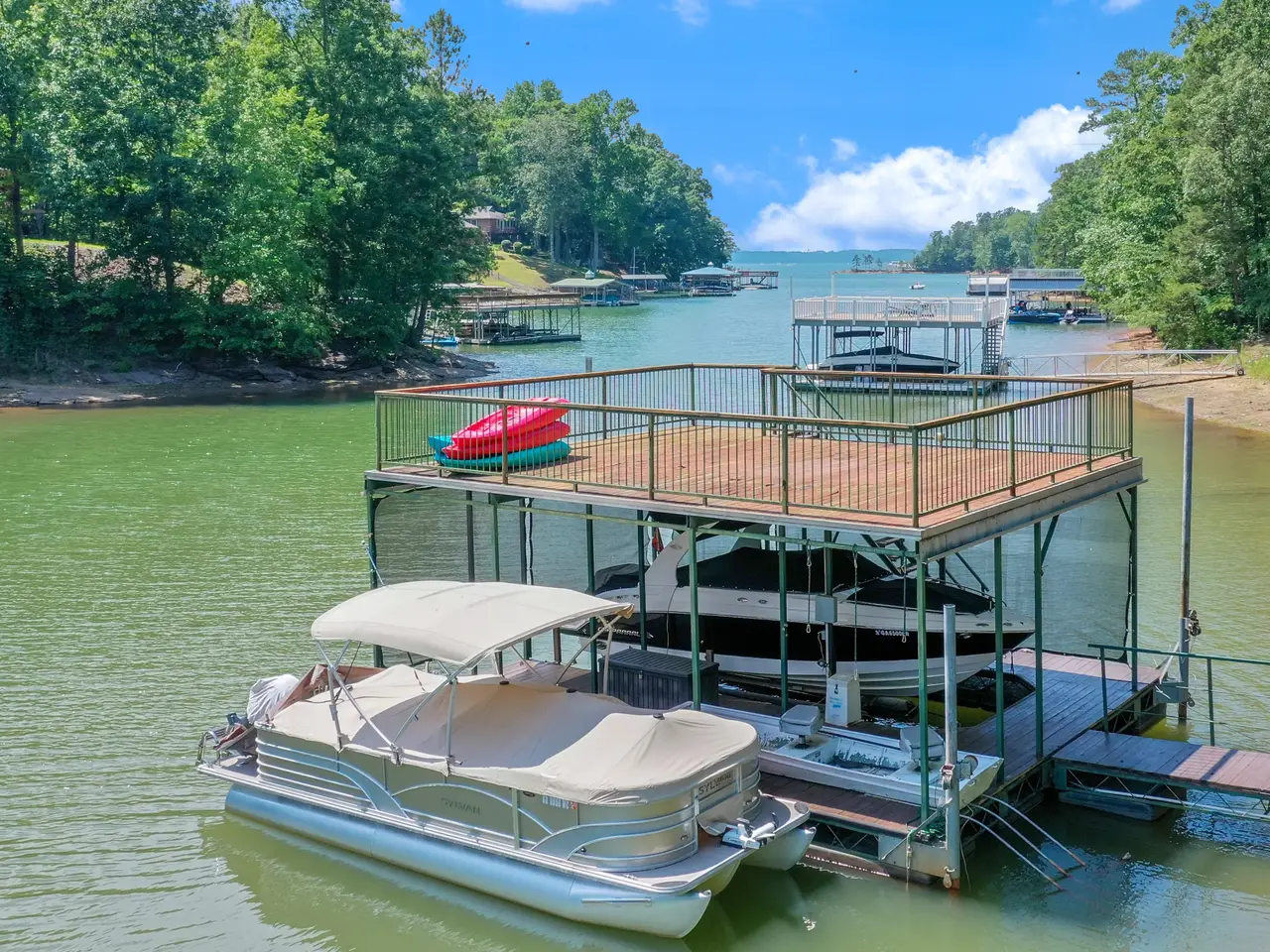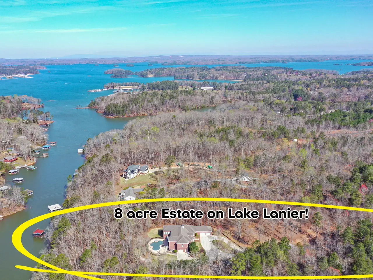 This is a rare opportunity to find acreage on South Lake Lanier! This premier 8 acre Lake Lanier estate is located in the sought after Buford area of on South Lake Lanier. As you enter the gates, down a long winding drive, this magnificent property offers acreage, trees, privacy and tranquility. The property includes a circular driveway, a beautiful traditional and updated brick home with a fully finished terrace level, a 2 car garage plus 2 car drive around to the terrace level with a workshop, a heated gunite salt water pool, and a large barn/workshop to store all your toys! Situated in a quiet cove on South Lake, with 350' of shoreline, the single slip party dock is just a short, gentle walk from the home. Close to the University Yacht Club, Holiday Marina and other lakeside restaurants by water! The home is spacious and grand, with many recent updates! The main level features 4500 finished sq. ft., with an open design, a large great room with vaulted ceilings, hardwood floors and a stone fireplace, and a new custom kitchen with a large island, stainless appliances, double ovens, and a gas cooktop. A spacious dining room is just off the kitchen. A formal study/office is just off the wet bar, and the private owner's suite has a large double vanity area, separate shower, Jacuzzi tub, and custom closets and built-ins. The finished terrace level features an open plan with a large media and game room area and a custom bar with dishwasher and icemaker, all off the covered patio and pool. Perfect for watching sports and entertaining! There's also a second laundry, full bath and two additional bedrooms. The lower level's two-car garage has extra space for storage and a workshop. The large barn/building can hold many cars, trucks, trailers, etc and serve as a workshop. There is extra covered RV storage. No HOA!