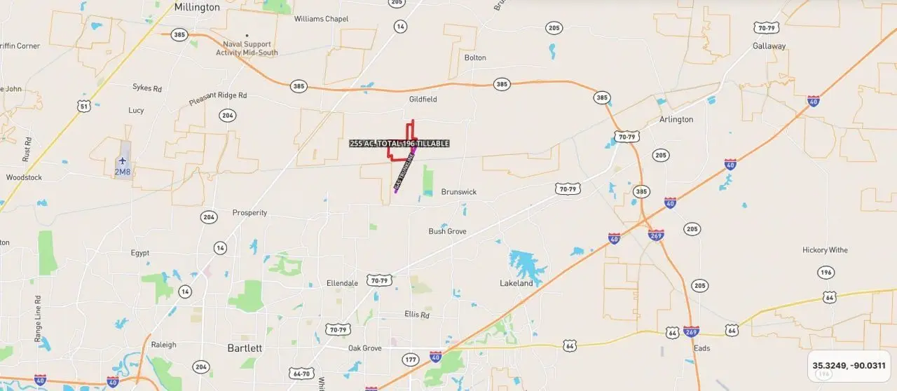 Cedar Grove 255 Farm currently known as the Gillette Farm offers 196 tillable acres of row crop farmland located on the outskirts of Arlington, TN along the Loosahatchie Canal. Property features excellent hunting and recreational opportunities with abundant deer and turkey. Portions of the land also provide an ideal site for a custom home and or potential future larger home site tracts. Conveniently located between Memphis International Airport and Jackson, TN.