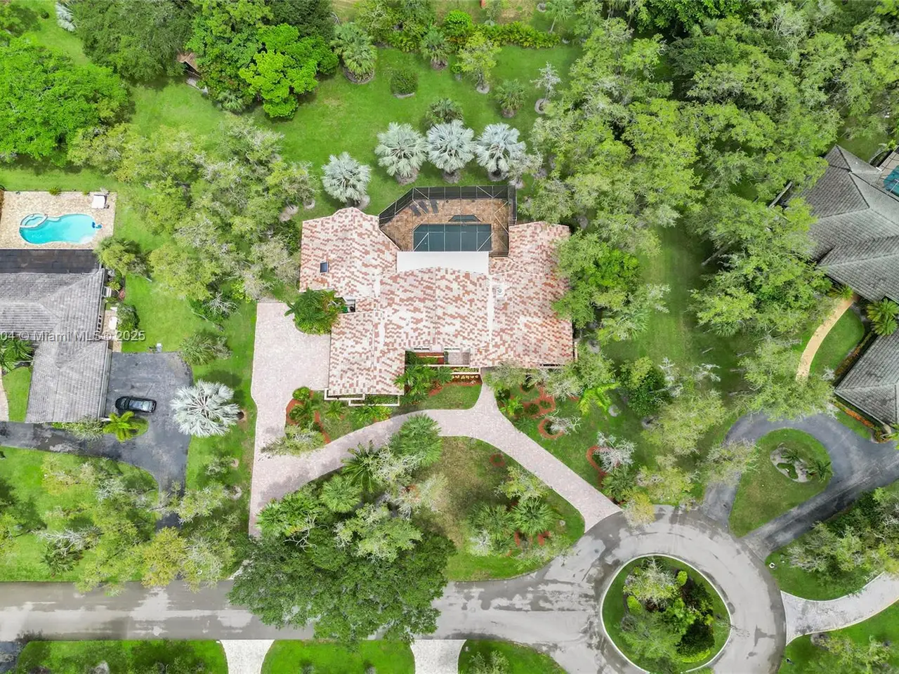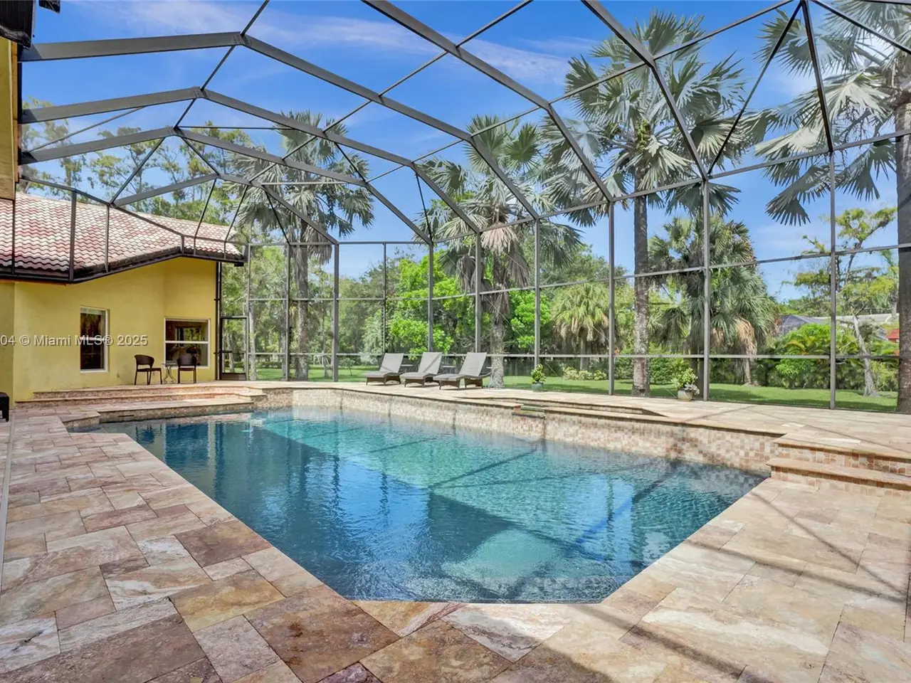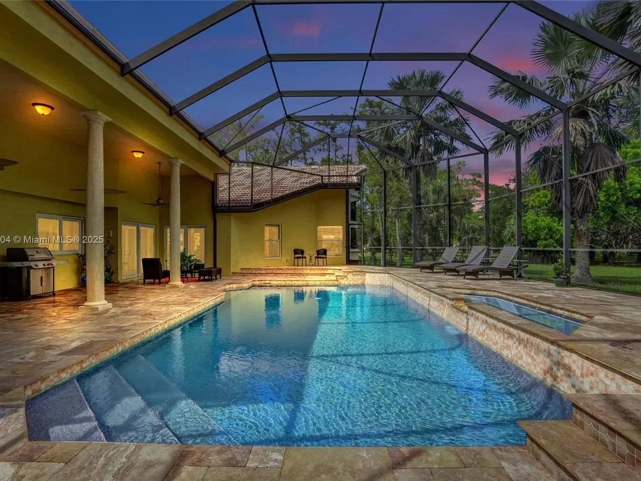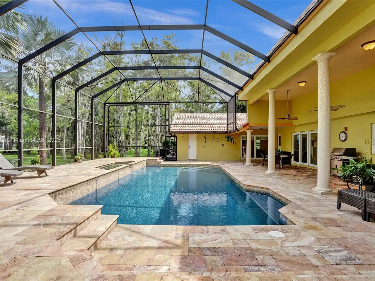 Wow! Great buy on this custom built true six bedroom home with over 4,300 square feet of living area on a wooded 1.02 acre cul-de-sac lot! Impact windows and sliding glass doors! Spectacular 24-inch diagonal marble flooring! Custom "in-law" suite includes gallery, separate additional primary luxury bedroom and bath, and en suite guest bedroom and bath! Huge dome screened remodeled heated waterfall jacuzzi and pool with marble deck! Three new air conditioners in 2019, 2023, and 2025!