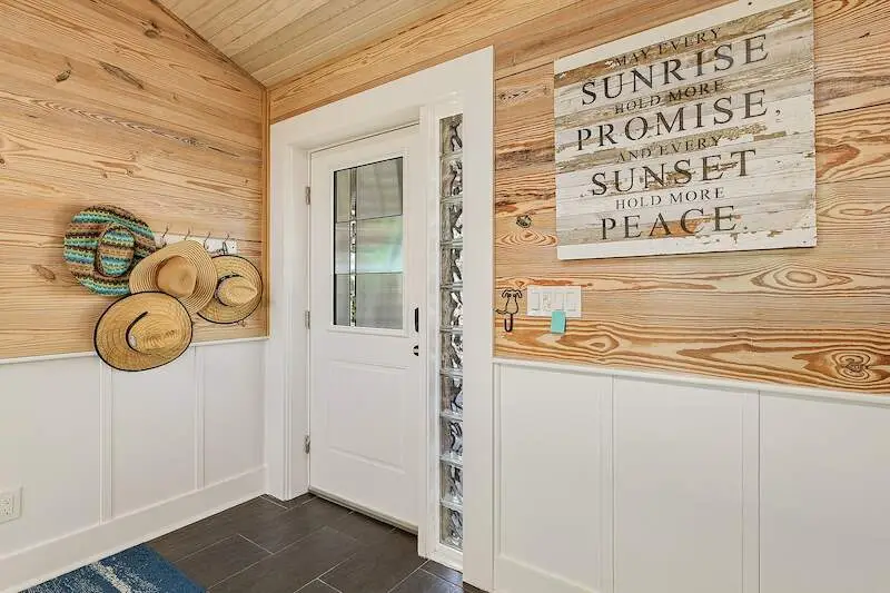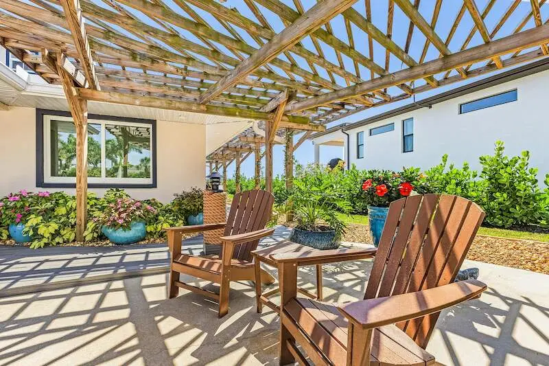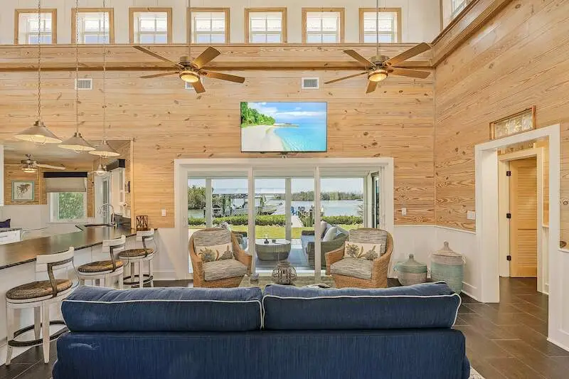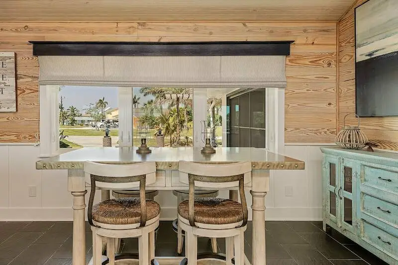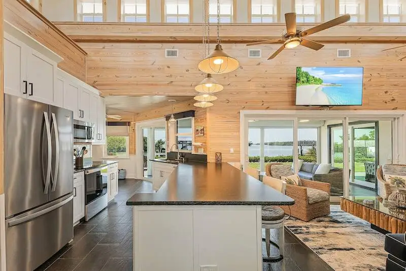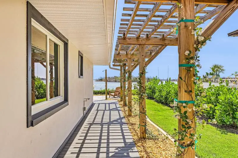 Enjoy life ON San Carlos Bay with stunning views and a uniquely designed coastal style home. Special touches abound in this completely remodeled home, creating the relaxed island lifestyle people dream of. Imagine sitting across from a submerged island, watching the birds, dolphins, and manatees on a regular basis. Outside feels like a private Caribbean resort as you walk through the mangroves toward a wrap-around deck that surrounds the entire home. Beautiful pergolas with flowering vines extend down from the metal roof. Unique design continues inside with amazing light from the vaulted ceiling clear story windows. The woodwork has whitewashed 8" yellow pine boards and wainscot ceiling. The 3bd/2ba home has new hurricane rated windows and sliding glass doors across the back so every room has lanai access and a view of the bay. Roll-down Hurricane Shutters make buttoning up a breeze without the need to drag your furniture inside. Tile floors throughout, including the finished garage which can be used as an office, fitness room or interior space. Immediate access to some of the world's best fishing and minutes away from SW Florida's most amazing islands. 10,000# Covered lift, Composite Dock, Room for a Pool and so much more. Welcome to Paradise.