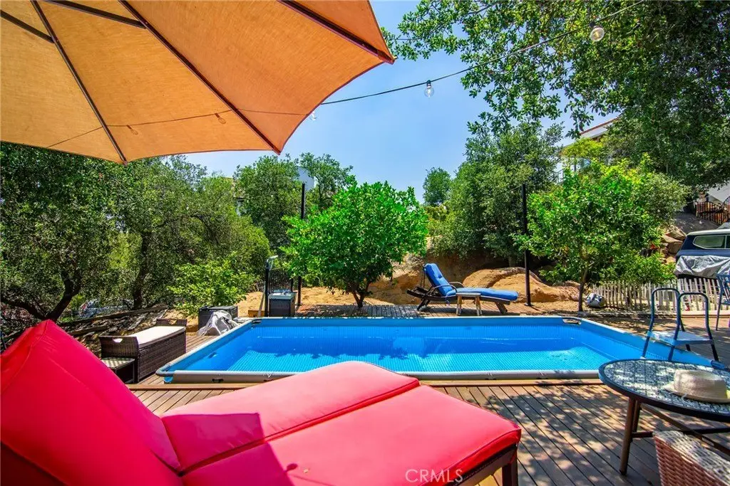 Hollywood Hills charm meets tranquil canyon living in West Hills. This one-of-a-kind Spanish adobe home is perched atop a sandstone ridge, offering unobstructed 360-degree views of the entire San Fernando Valley. Inside, you’ll find 3 bedrooms and 3 full baths across an open-concept floor plan featuring vaulted ceilings with exposed wood beams, creating a warm and airy ambiance. Enjoy seamless indoor-outdoor living with expansive sliding glass doors that open to a wraparound deck, sun deck, and a stylishly integrated above-ground pool with custom wood decking—perfect for relaxing, entertaining, or cooling off beneath the trees. The charming yard and sitting areas offer peaceful spaces to unwind while soaking in canyon and valley views. Modern upgrades include solar panels, a 200-amp electrical panel, landscape lighting, and a dedicated electrical panel by the pool. The property is fully fenced with dense Mangaris wood, and includes two sheds for extra storage, a one-car detached garage with carport, and ample parking. Smart home features include five Ring security cameras, a remote-controlled thermostat, and a WiFi-enabled deadbolt at the front gate, all easily managed from anywhere. Set at the end of a quiet, no-through street, this home offers ultimate privacy, European character, and direct access to incredible hiking trails. Other highlights include a mesh Wi-Fi system indoors and out, majestic oak trees, and the convenience of a main sewer connection (no septic). This rare architectural retreat seamlessly blends character, nature, and modern amenities.