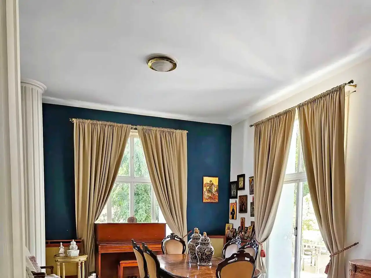 This luxurious residence is located in one of Larnaca’s most exclusive and safest areas, offering privacy, proximity to the airport, and views of a park and salt lake. The house is 1050m² across three levels and sits on a 939m² plot. The basement includes three large offices, a workshop, a bathroom, two WCs, a domestic staff room with a kitchen and shower, and a gym. The ground floor features an open-plan living room with access to the garden, pool, Jacuzzi, and pool house, as well as a kitchen, dining area, and storeroom. It also contains a private apartment with its own entrance, living room, kitchen, and large bedroom with en suite bathroom. On the first floor, there are four bedrooms. The master bedroom has a dressing room, en suite bathroom, and private terrace. Two other bedrooms also have en suite bathrooms, while the fourth shares a bathroom. An office area connects to a large veranda with park views. The home is equipped with air-conditioning and central heating throughout.