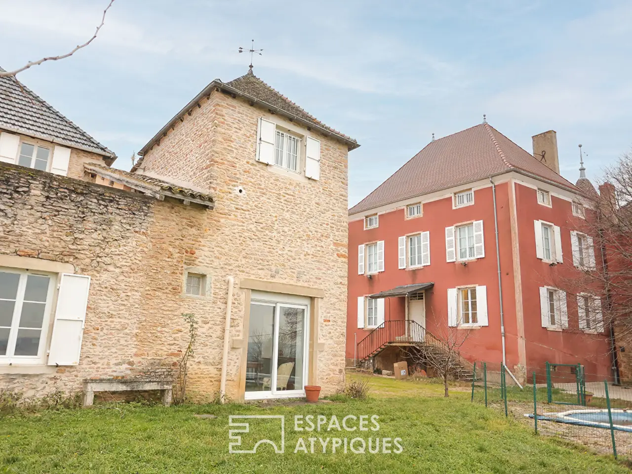 Nestled in an idyllic setting, in the heart of one of the most sought-after towns in the West of Maconnais, this rare real estate property consists of two charming houses offering 437sqm on a plot of 2552sqm with swimming pool.A true haven of peace, combining authenticity and character, this property offering two houses with the typical charm of the region will be ideal for a large family, a guest house project or a family reunion.A first mansion, a family home, consists of an entrance serving a separate living room, a dining room linked to a fitted kitchen, and its exterior access.A period staircase leads to the night area composed of three beautiful and bright bedrooms as well as an office and a bathroom.The third floor offers a games room, two bedrooms, an office and a shower room.A cellar completes this property.The second stone building is of an atypical composition with its volume, its different spaces, its roof terrace and its many development possibilities.On the ground floor, a kitchen-diner and a living room.Upstairs, a bedroom in a tower and its mezzanine. Another access leads to two other bedrooms, a bathroom and a magnificent roof terrace with a clear view allowing you to admire Mont Blanc.Finally on the upper floor, you will discover a huge living room with its fireplace and exposed framework contributing to the charm of the place.A garage, a cellar and a storeroom complete this property.The landscaped grounds, a true cocoon of tranquility, offer an enchanting natural setting, ideal for recharging your batteries throughout the seasons. Between shaded terraces, a wooded garden, swimming pool, and a clear view of the surrounding countryside, a change of scenery is guaranteed.Located a few minutes from amenities, this property benefits from a calm and sought-after environment while remaining close to major communication routes (TGV station, motorway 10 minutes away).Whether for a main residence or an atypical life project, this real estate tenement will appeal to lovers of elegance and authenticity. A rare address to discover without delay!ENERGY CLASS: D / CLIMATE CLASS: D. Average energy prices indexed for the years 2021, 2022, 2023 (subscriptions included): between EUR3,850 and EUR5,250.Information on the risks to which this property is exposed is available on the Georisques website for the areas concerned.Jean-Charles BUATOIS, 06.27.47.49.38. Commercial agent (EI), 911 278 737 RSAC. Bourg en Bresse.REF. 841EBAdditional information* 19 rooms* 10 bedrooms* 2 bathrooms* 3 shower rooms* 2 floors in the building* Outdoor space : 2552 SQM* Property tax : 2 428 €Energy Performance CertificateEPC : 211 kWhEP/m2.year* A 450GHG : 31 kgeqCO2/m2.year* A 80Agency feesThe fees include VAT and are payable by the vendorMediatorMediation Franchise-Consommateurswww.mediation-franchise.com29 Boulevard de Courcelles 75008 ParisInformation on the risks to which this property is exposed is available on the Geohazards website : www.georisques.gouv.fr
