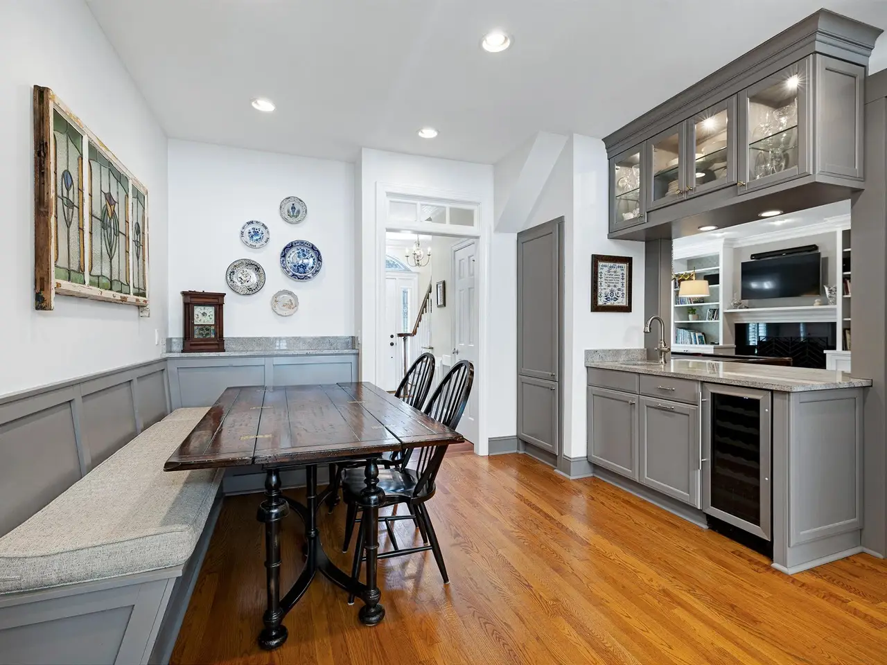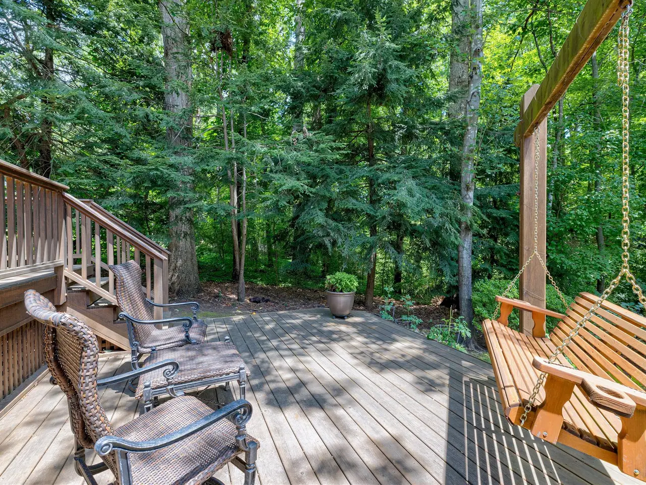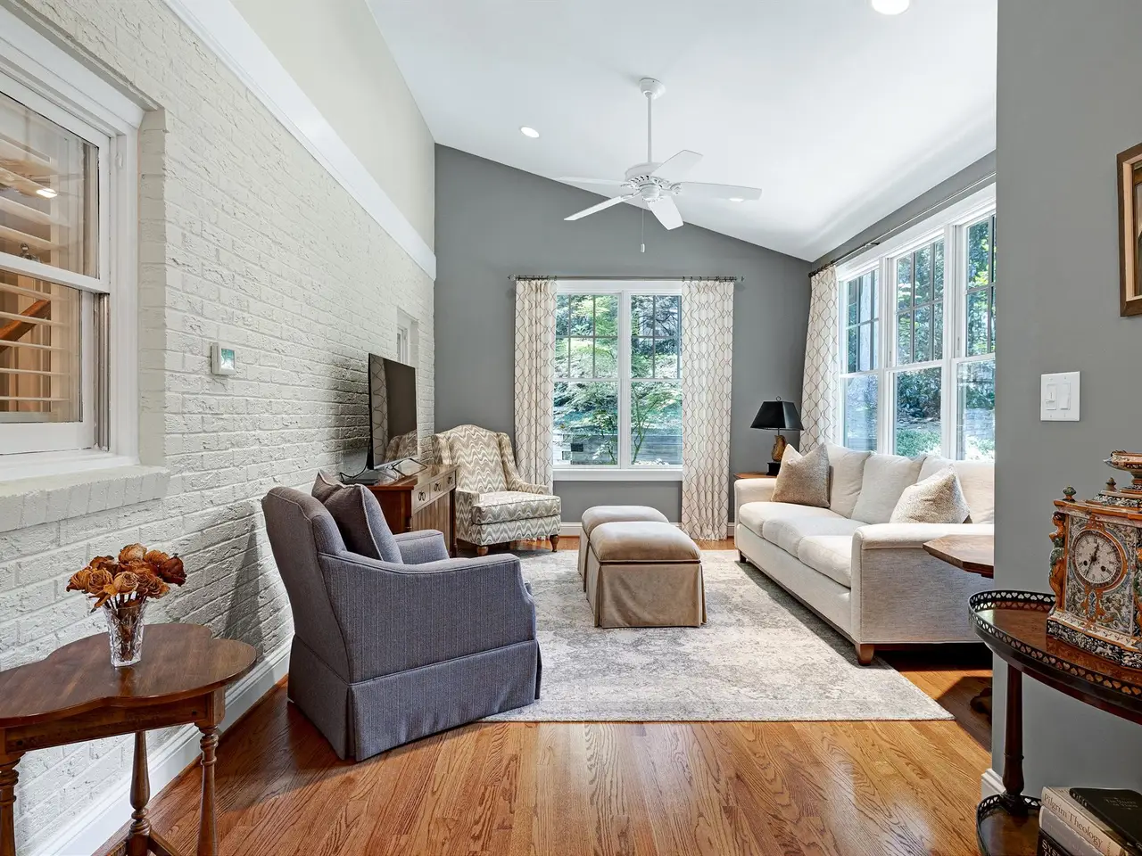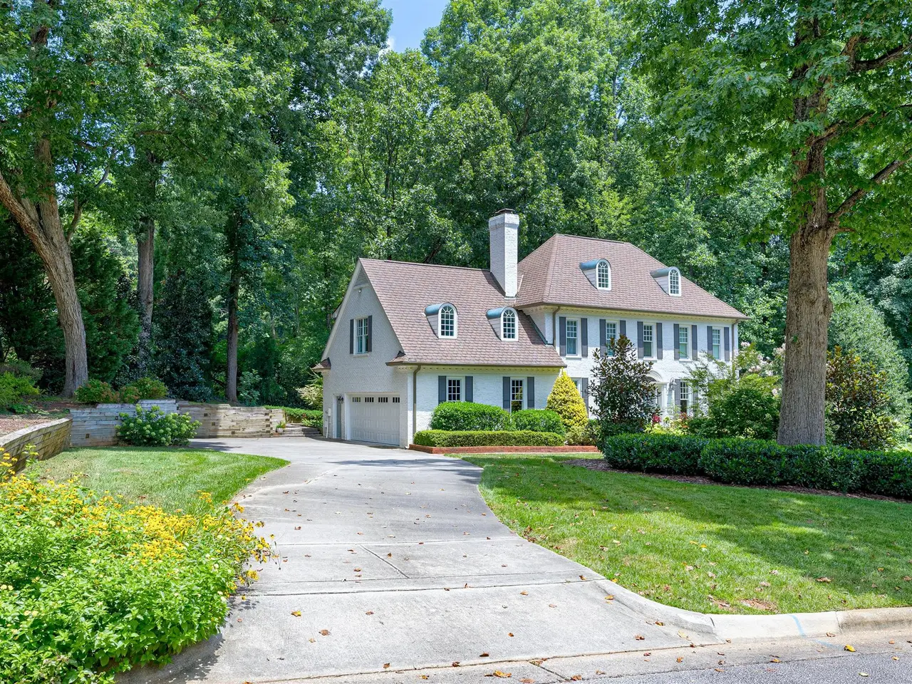 Set on a peaceful cul-de-sac with no through traffic, this 4-bed, 4-bath home offers nearly 4,300 sq ft of beautifully updated living. A major two-story rear addition expands the living space with a renovated kitchen and double sunrooms. All new Pella windows, new skylights, updated HVAC systems on every level, and major plumbing replacement mean the big projects are done. Quiet location, quality finishes, and a strong price point make this one of the best values in North Raleigh.Light-filled interiors begin with a welcoming foyer and continue into a versatile living/billiards room with built-ins and a gas fireplace. The formal dining room features a beamed ceiling and space to host a crowd. The kitchen includes a center island, gas cooktop, wet bar, granite counters, new skylights, and a sunny breakfast banquette. Two adjoining sunrooms create relaxed spaces for reading, entertaining, or enjoying the quiet setting. The primary suite offers a fireplace, double closets, and a newly renovated bath. Upstairs are two additional bedrooms, a full bath, and a spacious bonus room with rear-stair access. The third floor provides a private guest suite with full bath. Outside, a two-level deck overlooks a landscaped yard with magnolias, hydrangeas, and towering oaks, backing to a creek and forest.