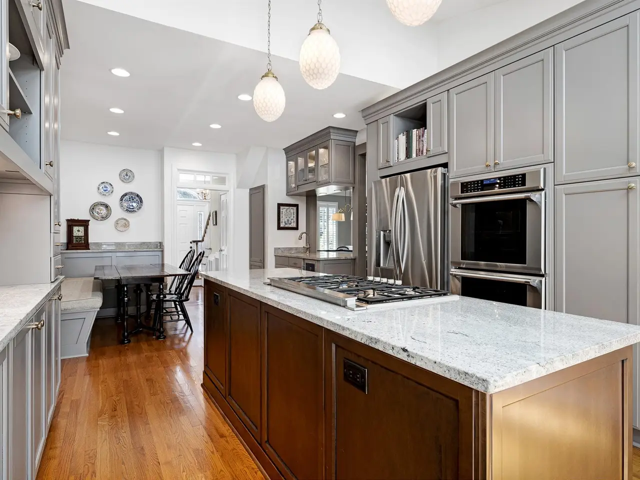 Center island and gas cooktop in kitchen