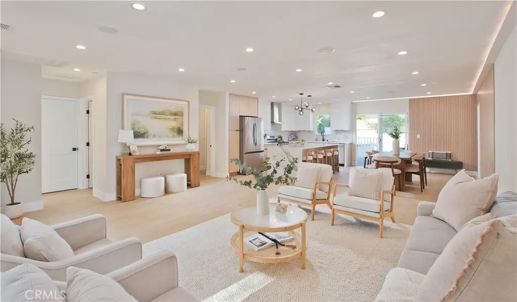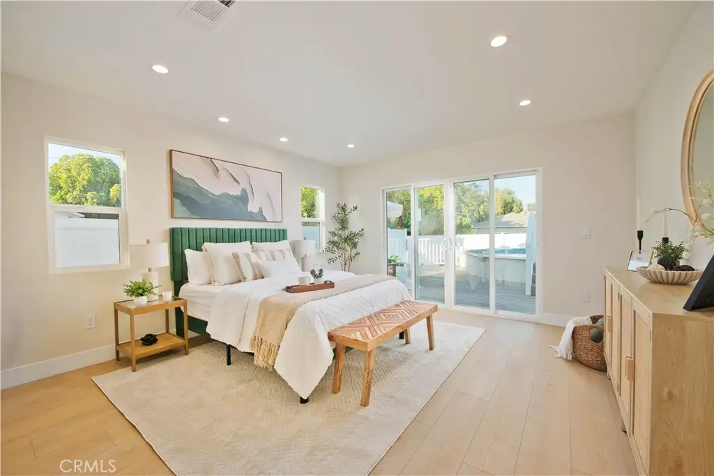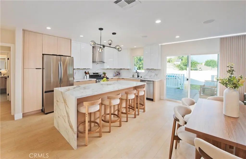 Welcome to 5864 Jamieson Ave, a stunning 3-bedroom, 3-bathroom home that has been reimagined & expanded to 1,993 sqft. Step onto the inviting front porch where modern design meets natural warmth. Vertical wood slat siding paired w/ sleek black accents creates eye-catching curb appeal, while elegant lighting adds a touch of sophistication. Inside, the oversized living room provides ample space for both relaxation & entertainment. Ambient LED lighting lets you set the perfect mood. At the heart of the home is a showstopping modern kitchen featuring an oversized marble waterfall island w/ seating for four—ideal for entertaining or casual meals. Two-tone cabinetry combines glossy white uppers & warm wood lowers for a clean, contemporary look. Stainless steel appliances, including a gas range & built-in hood, are seamlessly integrated. Striking pendant lights, recessed lighting, & natural window light keep the space bright & open. Adjacent, the elegant dining area features a custom vertical slat accent wall in a soft neutral tone, adding architectural interest. A hidden pantry offers sleek storage beyond the already generous cabinetry. Light wood floors flow throughout, complemented by recessed lighting & large sliding glass doors that open to the outdoor space, filling the home w/ natural light. The primary suite is a private retreat with its own spa-like bathroom, walk-in closet, & direct access to the deck & pool. The bathroom features a floating dual vanity with natural wood cabinetry, marble countertops, & LED mirrors. An oversized walk-in shower with a frameless glass enclosure & rainfall showerhead pairs beautifully with a freestanding soaking tub beneath a recessed accent shelf with ambient lighting. Matte black fixtures & large-format tile flooring complete the look. A spacious secondary bedroom & designer bath sit tucked into their own private wing. On the opposite side of the home, a secondary suite offers ideal guest accommodations, w/ its own access to the deck via sliding glass doors. The stylish en-suite includes a large shower, designer vanity, & LED mirror. Outside, an expansive deck offers space to relax & entertain beside the sparkling pool. A generous grassy area is perfect for play, with a large shed to keep things tucked away. Upgrades include fingerprint door access, wood slat accents, LED lighting, new roof, new AC, fully remodeled interior & exterior, laundry room for side-by-side units, direct garage access, Ecobee thermostat & more.