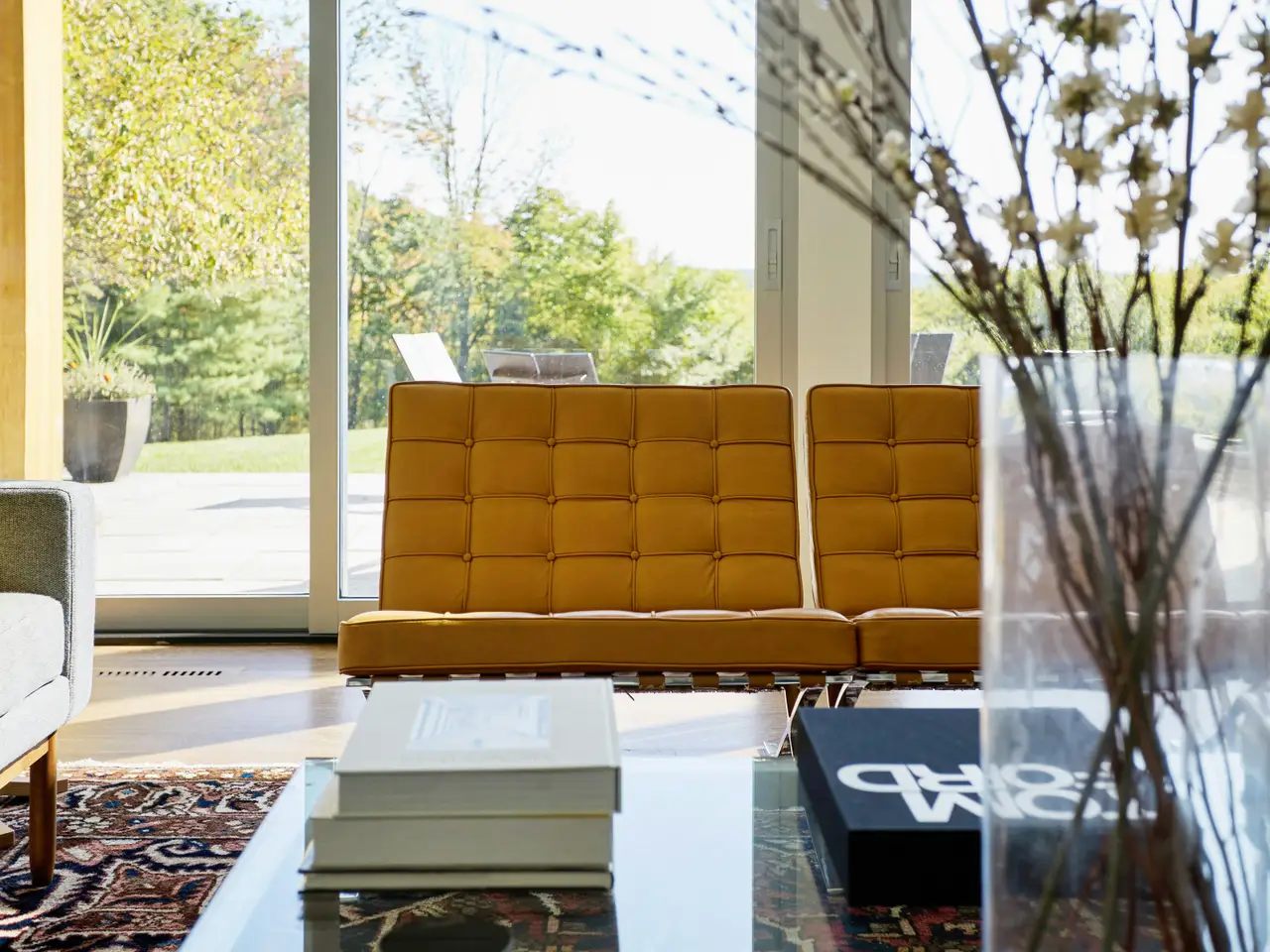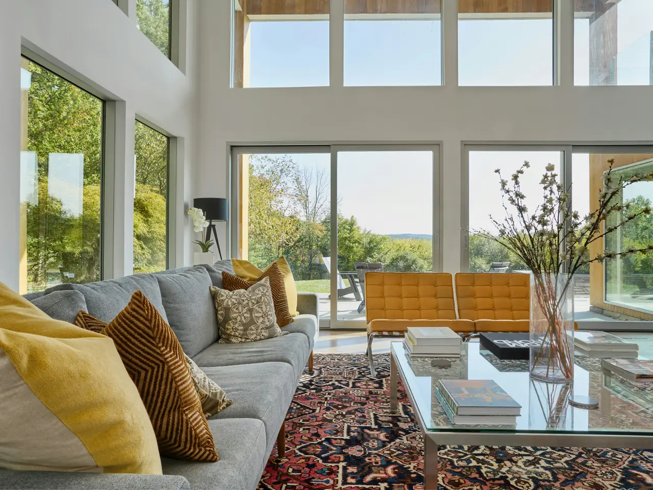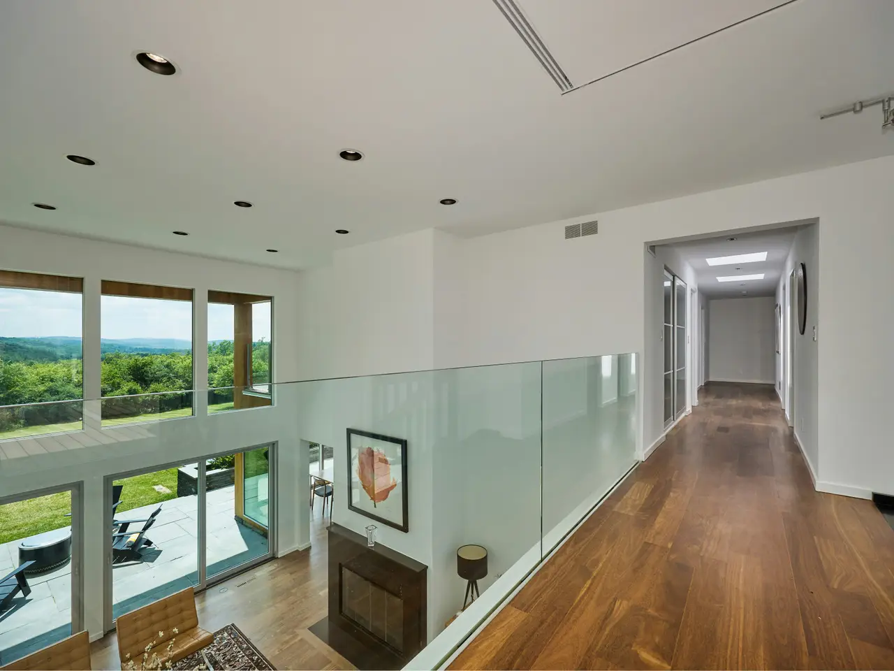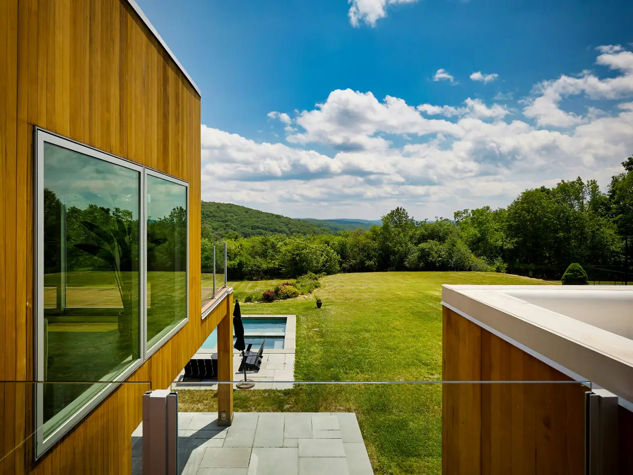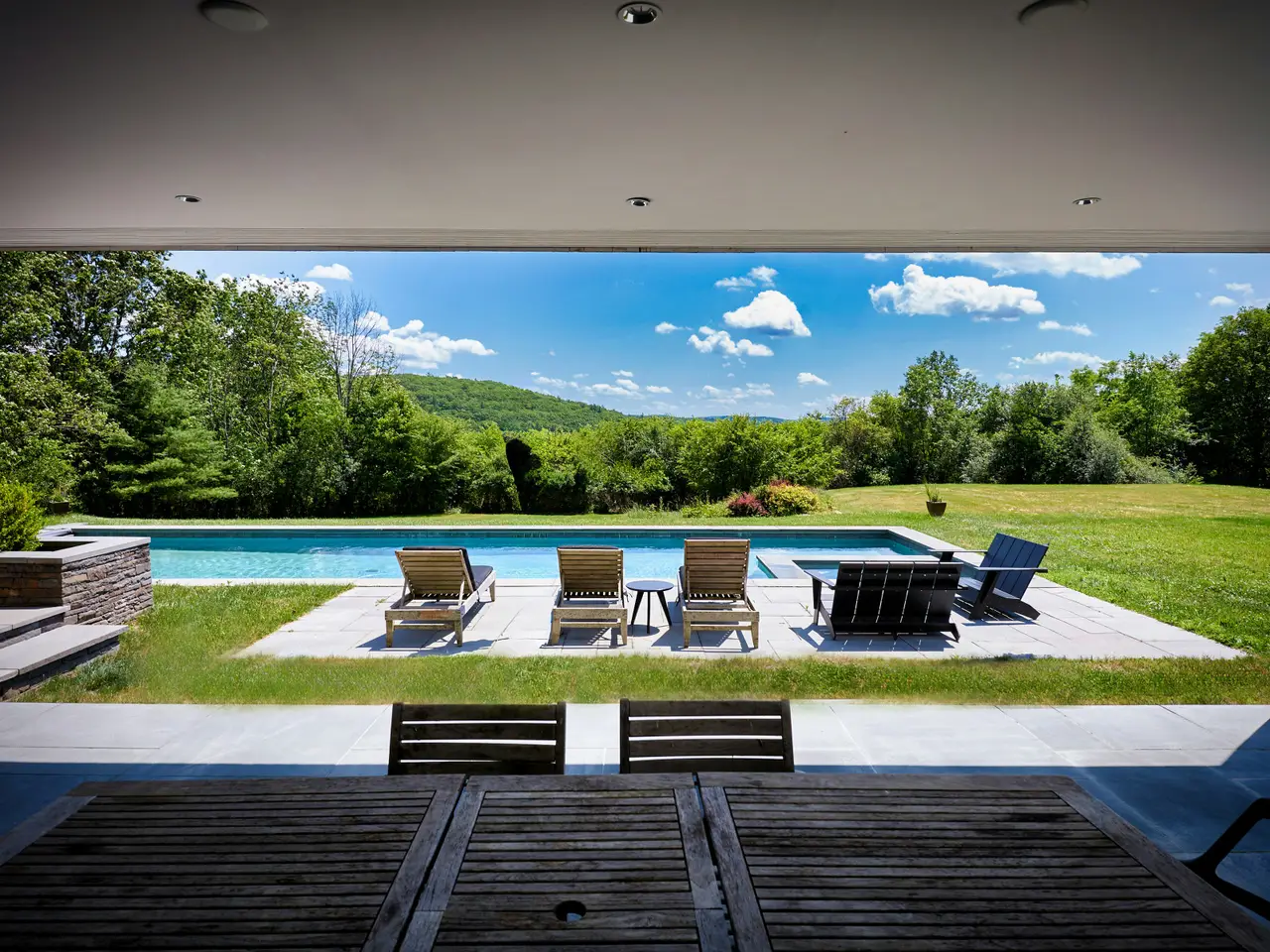 Bathed in sunlight, this graceful architectural masterwork is perfectly sited on ten private acres with awe-inspiring panoramic southern mountain views stretching endlessly, offering an ever-changing magical canvas of light and landscape. A home for all seasons, this newly re-built and expanded cedar house stands as if it rose from the landscape. A porte cochere and formal entry welcome you to a dramatic, sun-drenched living space where serenity meets sophistication. Impressive for entertaining or just for quiet reflection, the soaring ceilings, wood-burning fireplace, and walls of glass showcase each season's magic. Breathtaking views unfold throughout the home's effortless flow between interior comfort and nature's beauty. The house, wrapped to the south, east and west with 3000 sf of bluestone patios, supports a fire pit, open-air or covered dining, around the pool, and endless lounging areas. At the heart of the home, an expansive modern kitchen - with butler's pantry - opens to gracious dining and a separate living area centered around a second wood-burning fireplace. A continued wall of glass doors opens to the sweeping bluestone patios; an invitation to dine under the stars with fresh organics from the garden or savor quiet morning light. Also on the main floor is the spacious entertainment / game room that opens to a grand covered patio overlooking the heated 50 x 17 gunite pool with built-in hot tub. The truly extraordinary mudroom with main level laundry and great storage is a dream entered via your second entrance, found through an impressive architecturally beautiful breezeway. Across the breezway you will find the separately housed spa, with stainless custom hot tub, cedar sauna, shower and bath, an indoor lounge with floor-to-ceiling windows capturing the south views and west views to the floodlit Dura-Ace tennis court. The sleeping quarters include a main-floor bedroom and full bath, a second-floor primary suite with sweeping views and expansive glass doors for continued indoor-outdoor interaction with a glass-walled deck. Four additional bedrooms (or flex spaces), full bath, laundry and a bonus room - ideal for gym, studio, office or den - overlooking the main living space, or closed for privacy with a huge deck of its own, complete the second floor. Throughout the home, you will find the finest of finishes and high-end systems for comfort and efficiency. There is a whole-house grid-connected solar system and multiple electric car-charging stations.. The radiant-heated three-car garage with ample storage and work space is a dream convenience. This idyllic property is ideally located for access to all the Hudson Valley and Berkshires have to offer. Whether your passions are hiking, skiing, biking, art, shopping, yoga, theatre, or indulging in farm-to-table markets and celebrated gems or just relaxing, this rare offering in historic Old Chatham surrounded by New York's most scenic and storied countryside, Cedar Hill is the perfect home for your adventures and memories.