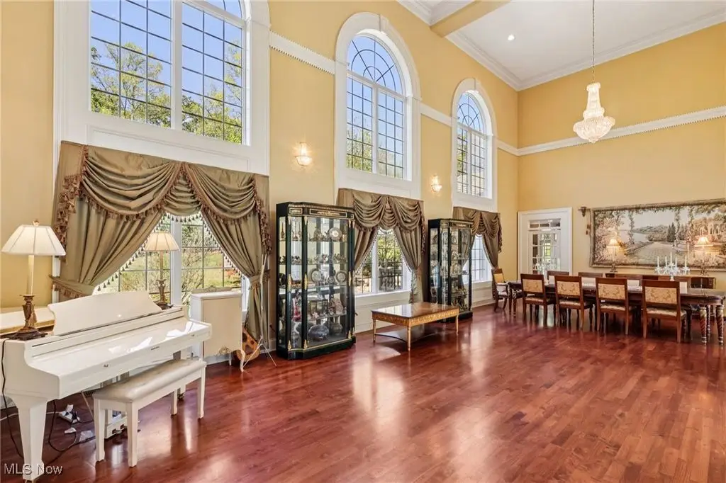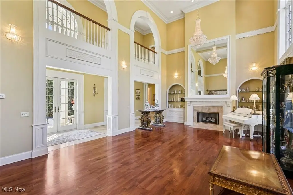 Stunning custom-built Scholz Design Brick Villa with 6+ bedrooms and 6.5 bathrooms situated on 5 gorgeous acres surrounded by lush mature plantings and landscaped gardens. The elegant iron forged gate opens to the tree-lined driveway that leads to an inviting courtyard with fountain and beautiful gardens. This exquisite home offers superior craftsmanship, imported tile, stone work, handcrafted millwork and stunning details throughout. The grand foyer opens to the most spectacular great room with 25' ceilings, hardwood floors, fireplace, custom moldings, archways and floor to ceiling Palladian windows. The heart of this home is the fabulous Cook's kitchen with granite counter tops, custom cabinetry, center island, breakfast bar and dinette area that is open to the family/hearth room with gas fireplace and extraordinary Turret style ceiling. Charming separate morning/bonus room as well that leads to attached laundry room. Large handsome cherry-stained library/den with custom shelving. First floor Owner's suite has a sitting room, walk-in closets, two vanities with hand painted sinks in the glamour bath. Elegant powder room and the 2nd full bathroom complete the first floor. The second floor features a graceful balcony overlooking the Great Room, loft area with skylights, private guest suite that includes a sitting room and full bath, four additional spacious bedrooms, and two more full baths. The walk-out lower level includes a theater area, recreation room with kitchenette, huge bonus room/bedroom/exercise room with glam full bath and sauna. The lower level opens to secluded multi-level brick patios with stunning waterfall and pond. This amazing property is situated on 5 fenced acres within 20 miles to downtown Cleveland.