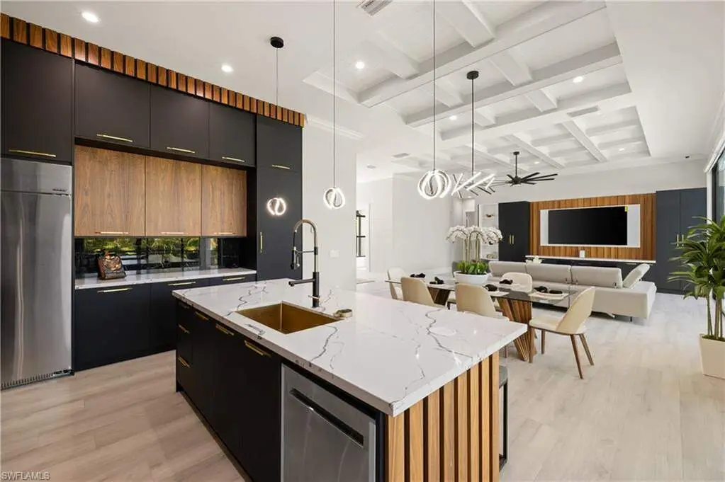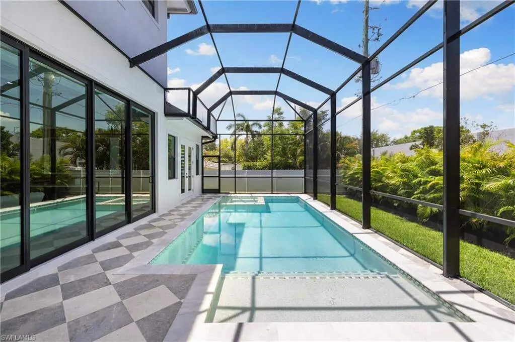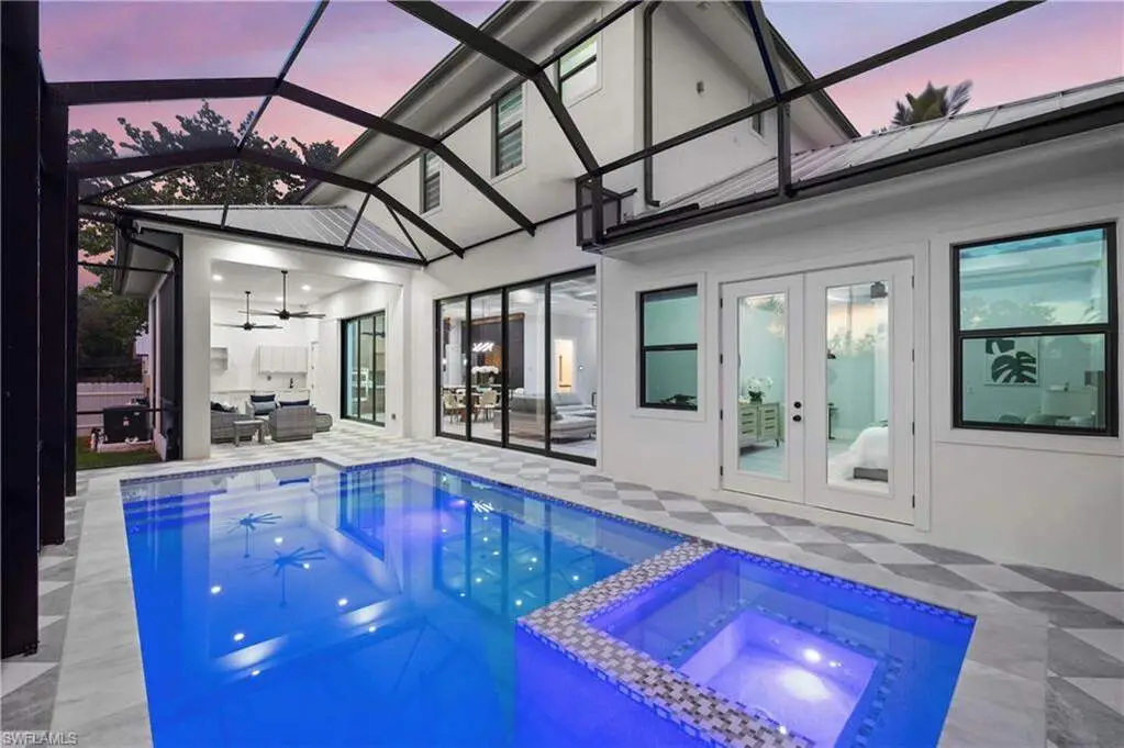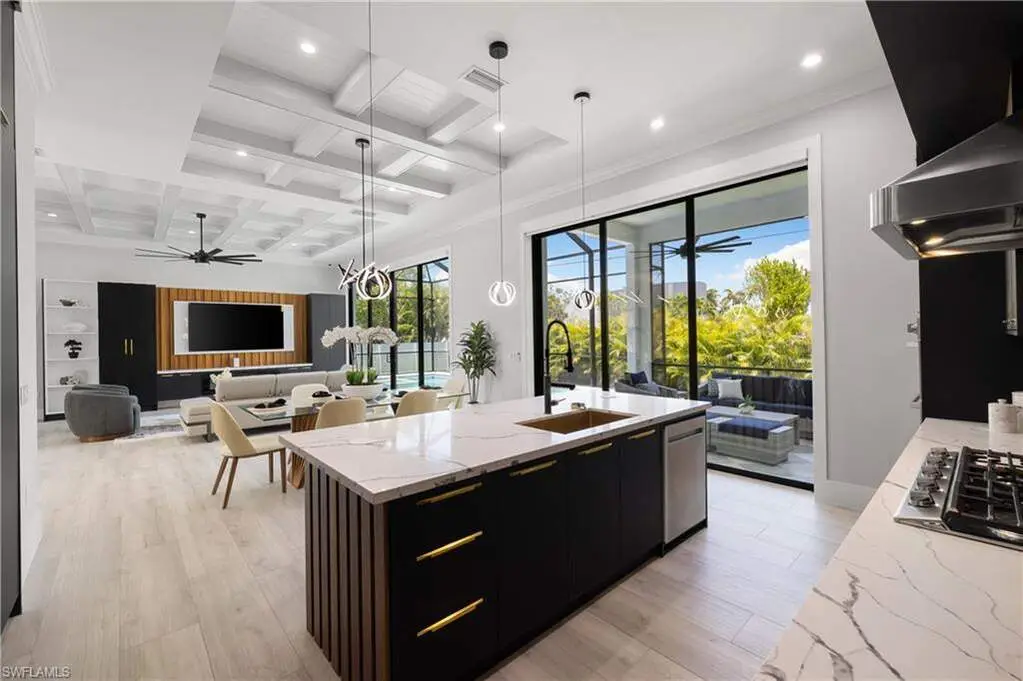 2025 NEW CONSTRUCTION, CONTEMPORARY ESTATE WITH 4 BEDS + DEN + BONUS LOFT AREA IN THE HIGHLY COVETED NEIGHBORHOOD OF LAKE PARK IN NAPLES! Perfectly located just 1 mile (4-minute drive or 7-minute bike ride) from both the pristine white sands of Naples Beach and the iconic 5th Avenue South, offering world-class dining, shopping, and entertainment right at your fingertips. This exceptional home is positioned with desirable Southwestern exposure for stunning sunsets and all-day sun over the pool area. Crafted for modern living, this residence features hurricane-impact windows and sliders throughout, a metal roof, and meticulous finishes. The open airy floor plan is enhanced by driftwood-style wide plank tile flooring and high coffered ceilings paired with tongue and groove wood paneling. Two sets of 9-foot impact sliding glass doors open seamlessly to the outdoor oasis, where a spacious saltwater pool with a tanning shelf, spa, and summer kitchen await, all surrounded by lush landscaping for ultimate privacy. The modern chef's kitchen features white quartz countertops, all Dacor appliances including gas range, and custom dual-toned cabinetry with rich wood grain and warm gold hardware. The primary suite is a private retreat, with French doors leading to the pool deck, a large walk-in closet with custom built-ins, and a spa-inspired bathroom boasting floor-to-ceiling marbled tile, a luxurious walk-in shower with six shower heads including rainfall, and a freestanding soaking tub. All guest bedrooms offer ensuite baths and walk-in closets, providing comfort and privacy for visitors, plus a second-story loft for their own private living space if desired. Located in an "A-rated" Collier County school district, and just minutes from Venetian Village, Waterside Shops, and Third Street South, this home delivers the best of luxury coastal living in one of Naples' most desirable neighborhoods.